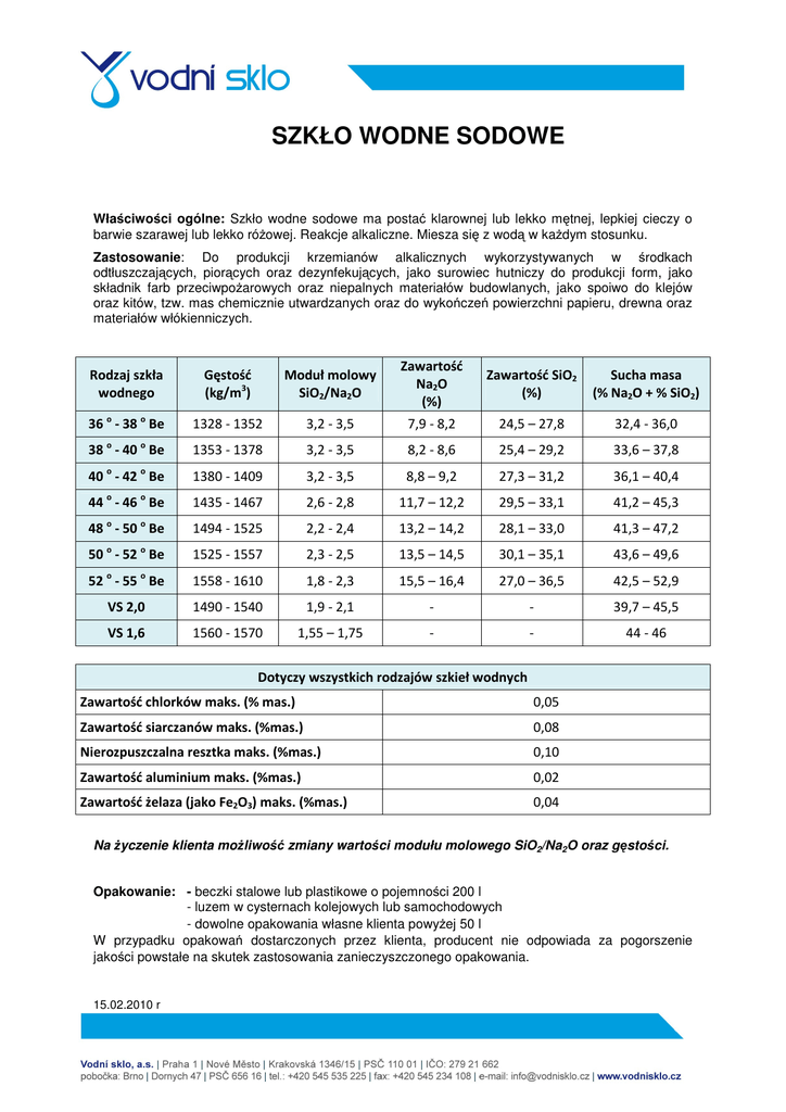 SZKŁO WODNE SODOWE Wła ciwo ci ogólne: Szkło wodne sodowe ma posta klarownej lub lekko m tnej, lepkiej cieczy o barwie szarawej lub lekko ró owej. Reakcje alkaliczne. Miesza si z wod w ka dym stosunku. Zastosowanie: Do produkcji krzemianów alkalicznych wykorzystywanych w rodkach odtłuszczaj cych, pior cych oraz dezynfekuj cych, jako surowiec hutniczy do produkcji form, jako składnik farb przeciwpo arowych oraz niepalnych materiałów budowlanych, jako spoiwo do klejów oraz kitów, tzw. mas chemicznie utwardzanych oraz do wyko cze powierzchni papieru, drewna oraz materiałów włókienniczych. " # ! ! $ " # %& $ $ ! '$ ( ) * + * ) ,- + ,- ) , + ,, ) ,( + ,* ) .- + .- ) . . + ) .. + / 0- / 10( 2 " # %& # 3 " # #% ! # 5 " # " # % % 4$ 3 %& 4 4$ 4$ 6 3 4 4$ # %& # 7 Na yczenie klienta mo liwo 4 4 4$ 4 zmiany warto ci modułu molowego SiO2/Na2O oraz g sto ci. Opakowanie: - beczki stalowe lub plastikowe o pojemno ci 200 l - luzem w cysternach kolejowych lub samochodowych - dowolne opakowania własne klienta powy ej 50 l W przypadku opakowa dostarczonych przez klienta, producent nie odpowiada za pogorszenie jako ci powstałe na skutek zastosowania zanieczyszczonego opakowania. 15.02.2010 r o Transport i przechowywanie: Transportowa i przechowywa w temp. powy ej 0 C. .Bezpiecze stwo i higiena pracy: Zgodnie z ustaw nr 356/2003 produkt został zakwalifikowany jako dra ni cy z nast puj cymi symbolami zagro enia: R 38 - Podra nia skór , R 41 - Ryzyko powa nego uszkodzenia oczu. Podczas pracy z produktem nale y stosowa r kawice ochronne, osłon twarzy, odzie ochronn , fartuch gumowy oraz obuwie ochronne. Utylizacja produktu: Mał ilo wytr ci kwasem chlorowodorowym tak, aby powstał kwas krzemowy w stanie stałym, a nast pnie przekaza do wła ciwego punktu odbioru odpadów. Usuwanie opakowa : Stalowe lub plastikowe beczki przekaza do odpowiedniego punktu odbioru odpadów. Producent - oddział: 15.02.2010 r Vodní sklo a.s. , Dornych 47, 656 16 Brno Tel.: +420 545 535 225 – technolog +420 475 245 259 Fax: +420 545 234 108 e-mail: [email protected] www.vodnisklo.cz