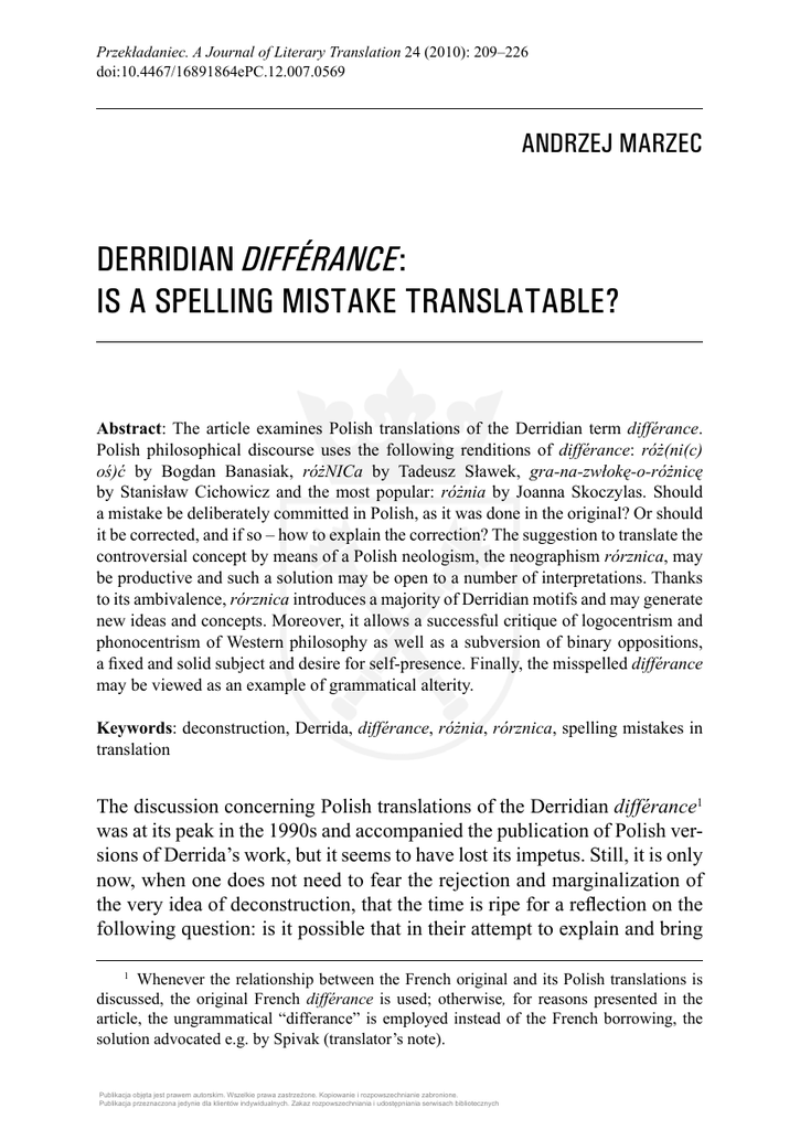 Przekładaniec. A Journal of Literary Translation 24 (2010): 209–226 doi:10.4467/16891864ePC.12.007.0569 ANDRZEJ MARZEC DERRIDIAN DIFFÉRANCE: IS A SPELLING MISTAKE TRANSLATABLE? Abstract: The article examines Polish translations of the Derridian term différance. Polish philosophical discourse uses the following renditions of différance: róż(ni(c) oś)ć by Bogdan Banasiak, różNICa by Tadeusz Sławek, gra-na-zwłokę-o-różnicę by Stanisław Cichowicz and the most popular: różnia by Joanna Skoczylas. Should a mistake be deliberately committed in Polish, as it was done in the original? Or should it be corrected, and if so – how to explain the correction? The suggestion to translate the controversial concept by means of a Polish neologism, the neographism rórznica, may be productive and such a solution may be open to a number of interpretations. Thanks to its ambivalence, rórznica introduces a majority of Derridian motifs and may generate new ideas and concepts. Moreover, it allows a successful critique of logocentrism and phonocentrism of Western philosophy as well as a subversion of binary oppositions, a fixed and solid subject and desire for self-presence. Finally, the misspelled différance may be viewed as an example of grammatical alterity. Keywords: deconstruction, Derrida, différance, różnia, rórznica, spelling mistakes in translation The discussion concerning Polish translations of the Derridian différance1 was at its peak in the 1990s and accompanied the publication of Polish versions of Derrida’s work, but it seems to have lost its impetus. Still, it is only now, when one does not need to fear the rejection and marginalization of the very idea of deconstruction, that the time is ripe for a reflection on the following question: is it possible that in their attempt to explain and bring 1 Whenever the relationship between the French original and its Polish translations is discussed, the original French différance is used; otherwise, for reasons presented in the article, the ungrammatical “differance” is employed instead of the French borrowing, the solution advocated e.g. by Spivak (translator’s note). Publikacja objęta jest prawem autorskim. Wszelkie prawa zastrzeżone. Kopiowanie i rozpowszechnianie zabronione. Publikacja przeznaczona jedynie dla klientów indywidualnych. Zakaz rozpowszechniania i udostępniania serwisach bibliotecznych 210 ANDRZEJ MARZEC closer the French term the individual translations of différance have in fact obliterated its proper meaning and, even more importantly, have deprived it of its subversive and dynamic potential? I will start my discussion with the analysis of the existing translation proposals (by Bogdan Banasiak, Tadeusz Sławek, Stanisław Cichowicz and Joanna Skoczylas) and move on to consider the possibilities of rendering into Polish the term différance with its inherent spelling mistake, which could play on incorrect Polish versions of the term as rórznica or rużnica. In order to do that I will look at the Derridian différance/différence through the lens of iterability, i.e. resemblance that is pervaded by displacement and alterity. I hope to demonstrate what consequences and what interpretive perspectives may be generated by a translation proposal that stresses the notion of iteration. I also ask whether the mistake made deliberately by the French philosopher should be corrected in the Polish critical thought and whether the correction is justified. At the same time, I investigate whether such an atypical, alternative translation matches other terms coined by Derrida, e.g. “supplement,” “pharmakon,” “deferral,” “espacement,” “trace” or “dissemination.” I am convinced that on the basis of the misspelling inherent in differance it is possible to outline the way in which grammatical alterity stands the chance of entering the order of language. The initial plurality and prolific originality of the first Polish translations of différance, favouring one or two characteristic features of the controversial term, has already been limited and standardized. The choice has been made on the strength of the philosophical usus that at the moment is inclined towards the proposition of Joanna Skoczylas (her różnia) or alternatively towards the seemingly neutral and therefore relatively attractive original French term. Indeed, it is possible that the notion of differance, of paramount importance to deconstruction, will share the fate of the Heideggerian Dasein, which, after many futile translation attempts, has been accepted in the Polish academic practice as an untranslatable term that can always be explained and discussed.2 Bogdan Banasiak, who translated of Of Grammatology, suggested in his preface to the Polish version of Derrida’s work that différance should be translated as różnicość, a word which could take a double form of róż(nic)ość or różni(coś)ć and therefore embrace both nic (nothing) and coś (something). This proposal seems to articulate quite convincingly the 2 Note such Polish equivalents as e.g. jestestwo (being) coined by Bogdan Baran or byt przytomny (conscious being) used by Krzysztof Michalski. Publikacja objęta jest prawem autorskim. Wszelkie prawa zastrzeżone. Kopiowanie i rozpowszechnianie zabronione. Publikacja przeznaczona jedynie dla klientów indywidualnych. Zakaz rozpowszechniania i udostępniania serwisach bibliotecznych Derridian différance: Is a Spelling Mistake Translatable? 211 undecidable oscillation between turning into nothing and becoming something: these two antagonistic tendencies coexist with each other, as neither would be able to prevail. This twofold term seems to refer with every single reading to an entirely different scope of meaning (nothing/something), which allows it to enter the space of ambivalence, of scintillating activity. The complicated róż(ni(c)oś)ć, that is and at the same time is not, proves an interesting trans