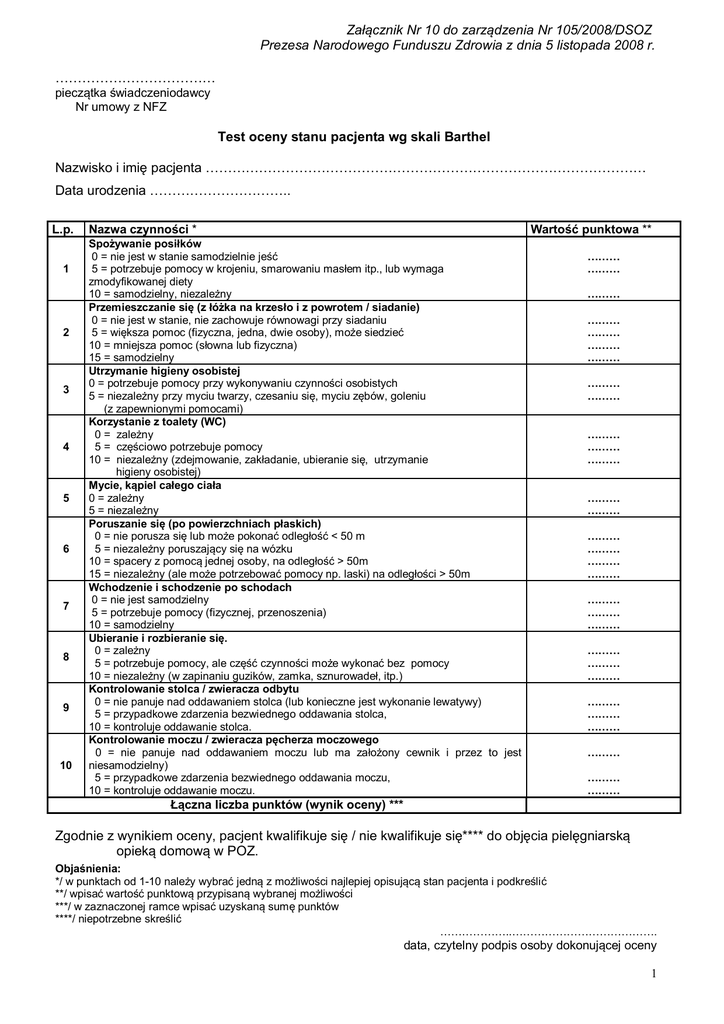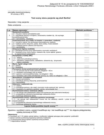 Załącznik Nr 10 do zarządzenia Nr 105/2008/DSOZ Prezesa Narodowego Funduszu Zdrowia z dnia 5 listopada 2008 r. ……………………………… pieczątka świadczeniodawcy Nr umowy z NFZ Test oceny stanu pacjenta wg skali Barthel Nazwisko i imię pacjenta ……………………………………………………………………………………… Data urodzenia ………………………….. L.p. 1 2 3 4 5 6 7 8 9 10 Nazwa czynności * Wartość punktowa ** Spożywanie posiłków 0 = nie jest w stanie samodzielnie jeść 5 = potrzebuje pomocy w krojeniu, smarowaniu masłem itp., lub wymaga zmodyfikowanej diety 10 = samodzielny, niezależny Przemieszczanie się (z łóżka na krzesło i z powrotem / siadanie) 0 = nie jest w stanie, nie zachowuje równowagi przy siadaniu 5 = większa pomoc (fizyczna, jedna, dwie osoby), może siedzieć 10 = mniejsza pomoc (słowna lub fizyczna) 15 = samodzielny Utrzymanie higieny osobistej 0 = potrzebuje pomocy przy wykonywaniu czynności osobistych 5 = niezależny przy myciu twarzy, czesaniu się, myciu zębów, goleniu (z zapewnionymi pomocami) Korzystanie z toalety (WC) 0 = zależny 5 = częściowo potrzebuje pomocy 10 = niezależny (zdejmowanie, zakładanie, ubieranie się, utrzymanie higieny osobistej) Mycie, kąpiel całego ciała 0 = zależny 5 = niezależny Poruszanie się (po powierzchniach płaskich) 0 = nie porusza się lub może pokonać odległość < 50 m 5 = niezależny poruszający się na wózku 10 = spacery z pomocą jednej osoby, na odległość > 50m 15 = niezależny (ale może potrzebować pomocy np. laski) na odległości > 50m Wchodzenie i schodzenie po schodach 0 = nie jest samodzielny 5 = potrzebuje pomocy (fizycznej, przenoszenia) 10 = samodzielny Ubieranie i rozbieranie się. 0 = zależny 5 = potrzebuje pomocy, ale część czynności może wykonać bez pomocy 10 = niezależny (w zapinaniu guzików, zamka, sznurowadeł, itp.) Kontrolowanie stolca / zwieracza odbytu 0 = nie panuje nad oddawaniem stolca (lub konieczne jest wykonanie lewatywy) 5 = przypadkowe zdarzenia bezwiednego oddawania stolca, 10 = kontroluje oddawanie stolca. Kontrolowanie moczu / zwieracza pęcherza moczowego 0 = nie panuje nad oddawaniem moczu lub ma założony cewnik i przez to jest niesamodzielny) 5 = przypadkowe zdarzenia bezwiednego oddawania moczu, 10 = kontroluje oddawanie moczu. ……… ……… ……… ……… ……… ……… ……… ……… ……… ……… ……… ……… ……… ……… ……… ……… ……… ……… ……… ……… ……… ……… ……… ……… ……… ……… ……… ……… ……… ……… Łączna liczba punktów (wynik oceny) *** Zgodnie z wynikiem oceny, pacjent kwalifikuje się / nie kwalifikuje się**** do objęcia pielęgniarską opieką domową w POZ. Objaśnienia: */ w punktach od 1-10 należy wybrać jedną z możliwości najlepiej opisującą stan pacjenta i podkreślić **/ wpisać wartość punktową przypisaną wybranej możliwości ***/ w zaznaczonej ramce wpisać uzyskaną sumę punktów ****/ niepotrzebne skreślić ………………..…………………………………. data, czytelny podpis osoby dokonującej oceny 1