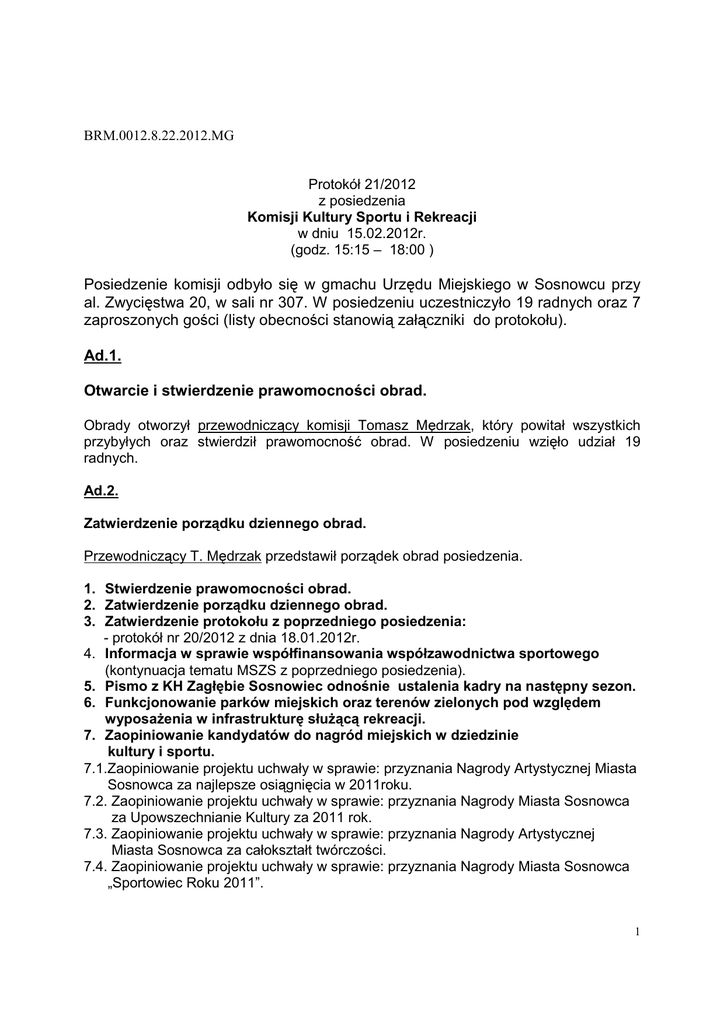 BRM.0012.8.22.2012.MG Protokół 21/2012 z posiedzenia Komisji Kultury Sportu i Rekreacji w dniu 15.02.2012r. (godz. 15:15 – 18:00 ) Posiedzenie komisji odbyło się w gmachu Urzędu Miejskiego w Sosnowcu przy al. Zwycięstwa 20, w sali nr 307. W posiedzeniu uczestniczyło 19 radnych oraz 7 zaproszonych gości (listy obecności stanowią załączniki do protokołu). Ad.1. Otwarcie i stwierdzenie prawomocności obrad. Obrady otworzył przewodniczący komisji Tomasz Mędrzak, który powitał wszystkich przybyłych oraz stwierdził prawomocność obrad. W posiedzeniu wzięło udział 19 radnych. Ad.2. Zatwierdzenie porządku dziennego obrad. Przewodniczący T. Mędrzak przedstawił porządek obrad posiedzenia. 1. Stwierdzenie prawomocności obrad. 2. Zatwierdzenie porządku dziennego obrad. 3. Zatwierdzenie protokołu z poprzedniego posiedzenia: - protokół nr 20/2012 z dnia 18.01.2012r. 4. Informacja w sprawie współfinansowania współzawodnictwa sportowego (kontynuacja tematu MSZS z poprzedniego posiedzenia). 5. Pismo z KH Zagłębie Sosnowiec odnośnie ustalenia kadry na następny sezon. 6. Funkcjonowanie parków miejskich oraz terenów zielonych pod względem wyposażenia w infrastrukturę służącą rekreacji. 7. Zaopiniowanie kandydatów do nagród miejskich w dziedzinie kultury i sportu. 7.1.Zaopiniowanie projektu uchwały w sprawie: przyznania Nagrody Artystycznej Miasta Sosnowca za najlepsze osiągnięcia w 2011roku. 7.2. Zaopiniowanie projektu uchwały w sprawie: przyznania Nagrody Miasta Sosnowca za Upowszechnianie Kultury za 2011 rok. 7.3. Zaopiniowanie projektu uchwały w sprawie: przyznania Nagrody Artystycznej Miasta Sosnowca za całokształt twórczości. 7.4. Zaopiniowanie projektu uchwały w sprawie: przyznania Nagrody Miasta Sosnowca „Sportowiec Roku 2011”. 1 7.5. Zaopiniowanie projektu uchwały w sprawie: przyznania Nagrody Miasta Sosnowca „Trener Roku 2011” 7.6. Do wiadomości: zarządzenie w sprawie przyznania wyróżnienia w formie nagrody pieniężnej dla zawodnika za osiągnięcia sportowe w 2011 roku. 8. Wybór czterech radnych do komisji ds. przyznawania dotacji dla zabytków. 9. Sprawy bieżące 9.1. Pismo z WED w sprawie lokalu przy ul. Będzińskiej 6. W wyniku głosowania, w którym udział wzięło 15 radnych, w tym: za: 15, przeciw: 0, wstrzymało się: 0, porządek został zatwierdzony. Ad. 3. Zatwierdzenie protokołów z poprzednich posiedzeń: - protokół nr 20/2012 z dnia 18.01.2012r. W wyniku głosowania, w którym udział wzięło 15 radnych, w tym: za: 15, przeciw: 0, wstrzymało się: 0, protokół został zatwierdzony. Ad. 4. Informacja w sprawie współfinansowania współzawodnictwa sportowego. Przewodniczący T. Mędrzak poprosił o zabranie głosu zastępcę prezydenta A. Czechowską-Kopeć. Zastępca prezydenta A. Czechowska-Kopeć poinformowała, że odbyło się spotkanie na którym ustalono, iż MSZS może zawrzeć umowę o organizacji zawodów sportowych i finansowanie może nastąpić z MOS, na który przekazywana jest dotacja miejska. Radny K. Winiarski zapytał, czy będą to konkretne kwoty, czy w miarę potrzeb. Zastępca prezydenta A. Czechowska-Kopeć odpowiedziała, że będzie to kwota około 30.000 zł. Ad. 5. Pismo z KH Zagłębie Sosnowiec odnośnie ustalenia kadry na następny sezon. Materiał stanowi załącznik do protokołu. Przewodniczący T. Mędrzak zapytał, jak wygląda sytuacja finansowa klubu hokejowego. 2 Prezes Zagłębie Sosnowiec S.A. Z. Drążkiewicz poinformował, że spotkanie rady nadzorczej spółki odbędzie się jutro i szkoda, że komisja nie poczekała z tematem na pismo od spółki. Dodał, że informacji udzieli po przedstawieniu jej radzie nadzorczej. Przewodniczący T. Mędrzak zapytał o rozmowy z zawodnikami odnośnie nie przyszłego sezonu. Prezes Zagłębie Sosnowiec S.A. Z. Drążkiewicz odpowiedział, że problem ten zależy od możliwości finansowych. Powiedział, że nie może podawać do wiadomości publicznej informacji o prowadzonych rozmowach. Radny K. Winiarski stwierdził, że w budżecie miasta przewidziano 1.000.000 zł dla spółki. Zapytał, czy te pieniądze już wpłynęły do spółki. Zapytał, czy prezes poradzi sobie w sytuacji w przypadku braku innych pieniędzy. Prezes Zagłębie Sosnowiec S.A. Z. Drążkiewicz odpowiedział, że 31 stycznia do spółki wpłynęło 1.000.000 zł w jednej racie. Poinformował, że zostały one wydane w 80 % na zaległe wypłaty oraz spłaty ugód . Na dzień 31 stycznia spółka na zalega zawodnikom wypłaty płacy. Dodał, że na jutrzejszej radzie zostanie przedstawiony plany na następny sezon. Radny K. Winiarski zapytał o sponsorów. Prezes Zagłębie Sosnowiec S.A. Z. Drążkiewicz odpowiedział, że w tej chwili ma podpisane umowy na 190 000 zł od sponsorów. Spółka wystąpiła także o pieniądze na sport młodzieżowy. Dodał, że drużyna będzie walczyć o 5 lub 6 pozycję w przyszłym sezonie, a na to będzie potrzeba 2.000.0000 zł. Radny K. Winiarski zapytał, ile potrzeba pieniędzy na walkę o medale. Prezes Zagłębie Sosnowiec S.A. Z. Drążkiewicz odpowiedział, że od 2.400.000 zł do 4.000.000 zł. Poinformował, że w tej chwili spółka nie jest zadłużona. Radny K. Winiarski zapytał, czy sponsor, który obiecał pieniądze w czasie kampanii wyborczej wpłacił je do klubu oraz czy jest zainteresowany wspieraniem hokeja. Prezes Zagłębie Sosnowiec S.A. Z. Drążkiewicz odpowiedział, że wpłynęło 80 % deklarowanej sumy. Radny M. Rykała zapytał o remonty w hali. Prezes Zagłębie Sosnowiec S.A. Z. Drążkiewicz odpowiedział, że gmina podjęła się organizacji zawodów w shorttracku i w związku z tym MOSiR wydawał pieniądze na potrzeby związane z organizacją zawodów w tym także na remonty w hali lodowiska. Radny M. Ornowski zapytał, kto sprowadził do spółki prezesa Falla oraz ile sponsorów pan Fall sprowadził spółki. Stwierdził, że komisja jest radą nadzorczą rady nadzorczej