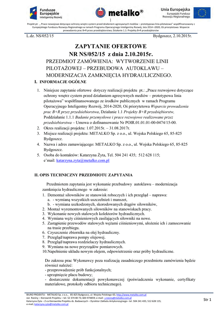 Projekt pt: „ Prace rozwojowe dotyczące ochrony wnętrz cystern przed działaniem agresywnych mediów – prototypowa linia pilotażowa” współfinansowany z Europejskiego Funduszu Rozwoju Regionalnego w ramach Programu Operacyjnego Inteligentny Rozwój, lata 2014 ÷2020, Oś priorytetowa: Wsparcie prowadzenia prac B+R przez przedsiębiorstwa; Działanie 1.1: Projekty B+R przedsiębiorstw L.dz. NS/052/15 Bydgoszcz, 2.10.2015r. ZAPYTANIE OFERTOWE NR NS/052/15 z dnia 2.10.2015r. PRZEDMIOT ZAMÓWIENIA: WYTWORZENIE LINII PILOTAŻOWEJ – PRZEBUDOWA AUTOKLAWU – MODERNIZACJA ZAMKNIĘCIA HYDRAULICZNEGO. I. INFORMACJE OGÓLNE 1. Niniejsze zapytanie ofertowe dotyczy realizacji projektu pt.: „Prace rozwojowe dotyczące ochrony wnętrz cystern przed działaniem agresywnych mediów – prototypowa linia pilotażowa” współfinansowanego ze środków publicznych w ramach Programu Operacyjnego Inteligentny Rozwój, 2014-2020, Oś priorytetowa Wsparcie prowadzenia prac B+R przez przedsiebiorstwa, Działanie 1.1 Projekty B+R przedsiębiorstw, Poddziałanie 1.1.1 Badanie przemysłowe i prace rozwojowe realizowane przez przedsiebiorstwa – Umowa o dofinansowanie Nr POIR.01.01.01-00-0474/15-00. 2. Okres realizacji projektu: 1.07.2015r. – 31.08.2017r. 3. Miejsce realizacji projektu: METALKO Sp. z o.o., ul. Wojska Polskiego 65, 85-825 Bydgoszcz. 4. Nazwa i adres zamawiającego: METALKO Sp. z o.o., ul. Wojska Polskiego 65, 85-825 Bydgoszcz. 5. Osoba do kontaktów: Katarzyna Żyta, Tel. 504 241 435; 512 628 115; e’mail: [email protected] II. OPIS TECHNICZNY PRZEDMIOTU ZAPYTANIA Przedmiotem zapytania jest wykonanie przebudowy autoklawu – modernizacja zamknięcia hydraulicznego w zakresie: 1. Demontaż siłowników ze stanowisk roboczych i ich przegląd – naprawa: a. - wymianą wszystkich uszczelnień i manszet, b. - wymiana uszkodzonych, skorodowanych drągów siłowników, 2. Montaż wyremontowanych siłowników na stanowiskach pracy. 3. Wykonanie nowych stalowych kolektorów hydraulicznych. 4. Wymiana węży ciśnieniowych zasilających siłowniki na nowe. 5. Zastąpienie przewodów stalowych wężami ciśnieniowymi, ułożenie ich i zamocowanie na trasie przebiegu. 6. Czyszczenie zbiornika na olej hydrauliczny. 7. Przegląd/naprawa pompy olejowej. 8. Przegląd/naprawa rozdzielaczy hydraulicznych. 9. Wymiana na nowe przyrządów pomiarowych. 10.Napełnienie układu nowym olejem, odpowietrzenie oraz próby hydrauliczne. Do zakresu prac Wykonawcy poza realizacją zasadniczego przedmiotu zamówienia będzie również należeć: - przeprowadzenie prób funkcjonalnych; - uprzątnięcie placu budowy; - dostarczenie dokumentacji powykonawczej (poświadczenia wykonanie, certyfikaty materiałowe, protokoły odbioru technicznego). BIURO PROJEKTU: METALKO Sp. z o.o., 85-825 Bydgoszcz, ul: Wojska Polskiego 65; http://www.metalko.com.pl Jan Rześny – Kierownik Projektu – tel. 52 374 80 73; 603 974859; e-mail: [email protected] Katarzyna Żyta – Z-ca Kierownika Projektu ds. Badawczych – Dyrektor Zakładu Antykorozyjnego– tel. 504 241 435; 512 628 115; e-mail; [email protected] Str 1 Wspólny słownik zamówień Kod CPV przedmiotu zapytania: 50514100-2 Usługi w zakresie napraw i konserwacji zbiorników III. OPIS PRZYGOTOWANIA OFERTY Złożona oferta powinna zawierać następujące elementy: 1. Nr i datę zapytania ofertowego w odpowiedzi na które składana jest oferta. 2. Nazwę oferenta, dane kontaktowe oraz siedzibę oferenta. 3. Wyspecyfikowany zakres prac. 4. Cenę jednostkową (netto i brutto) wyspecyfikowanego zakresu prac. 5. Warunki gwarancji. 6. Warunki płatności. 7. Termin wykonania poszczególnych etapów prac opisanych w punkcie II. 8. Termin ważności oferty. 9. Oświadczenie, że podana cena nie ulegnie zmianie. 10. Podpisane Oświadczenie Oferenta stanowiące załącznik do niniejszego zapytania. IV. OFERTY CZĘŚCIOWE Przedmiot zamówienia stanowi dla Zamawiającego jedną całość i nie dopuszcza się składania ofert obejmujących część zakresu prac. V. MIEJSCE I TERMIN SKŁADANIA OFERT 1. Ofertę należy składać nie później niż do dnia 16.06.2014r. do godziny 15-tej, w wersji papierowej na adres Biura Projektu: METALKO Sp. z o.o. Ul. Wojska Polskiego 65 85-825 Bydgoszcz lub elektronicznej na adres e’mail: [email protected] 2. O ważności składanej oferty decyduje data i godzina wpływu oferty do Biura Projektu. 3. Oferta powinna być opatrzona pieczęcią Oferenta oraz podpisem osoby upoważnionej VI. WARUNKI UDZIAŁU W POSTĘPOWANIU O udzielenie zamówienia mogą ubiegać się Oferenci, którzy spełniają następujące warunki: 1. Posiadają uprawnienia do wykonywania określonej działalności lub czynności, jeśli przepisy prawne nakładają obowiązek posiadania takich uprawnień. 2. Posiadają niezbędną wiedzę doświadczenie oraz dysponują potencjałem technicznym i osobowym niezbędnym do wykonania usługi zgodnie z zamówieniem. 3. Nie otwarto wobec nich postępowania likwidacyjnego ani upadłościowego. 4. Nie stanowią podmiotów powiązanych kapitałowo lub osobowo zgodnie przepisami ustawy z dnia 3 grudnia 2010r. o zmianie Ustawy o utworzeniu Polskiej Agencji Rozwoju Przedsiębiorczości (Dz.U.10.240.1603). 5. Przez powiązania kapitałowe lub osobowe rozumie się wzajemne powiązania pomiędzy METALKO Sp. z o.o. jako Beneficjentem lub osobami upoważnionymi do zaciągania zobowiązań w imieniu Beneficjenta lub osobami wykonującymi w imieniu Beneficjenta czynności związane z przygotowaniem i przeprowadzeniem procedury wyboru wykonawcy a wykonawcą, polegające w szczególności na: 1) uczestniczeniu w spółce jako wspólnik spółki cywilnej lub spółki osobowej; Str 2 2) posiadaniu co najmniej 10% udziałów lub akcji; 3) pełnieniu funkcji członka organu nadzorczego lub zarządzającego, prokurenta, pełnomocnika; 4) pozostawaniu w związku małżeńskim, w stosunku pokrewieństwa lub powinowactwa w linii prostej, pokrewieństwa dru