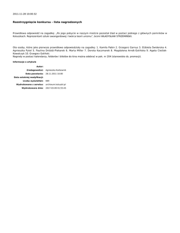 2011-11-28 10:00:32 Rozstrzygnięcie konkursu - lista nagrodzonych Prawidłowa odpowiedź na zagadkę: „Po jego pobycie w naszym mieście pozostał ślad w postaci jednego z głównych pomników w Koluszkach. Reprezentant sztuki awangardowej i twórca teorii unizmu”, brzmi WŁADYSŁAW STRZEMIŃSKI. Oto osoby, które jako pierwsze prawidłowo odpowiedziały na zagadkę: 1. Kamila Pabin 2. Grzegorz Garnys 3. Elżbieta Świderska 4. Agnieszka Pytel 5. Paulina Dróżdż-Piekarek 6. Marta Miller 7. Dorota Kaczmarek 8. Magdalena Arndt-Golińska 9. Agata CieślakKowalczyk 10. Grzegorz Goliński. Nagrody w postaci kalendarzy, folderów i biletów do kina można odebrać w pok. nr 204 (stanowisko ds. promocji). Informacje o artykule Autor: Zredagował(a): Data powstania: Agnieszka Karbownik 28.11.2011 10:00 Data ostatniej modyfikacji: Liczba wyświetleń: 669 Wydrukowano z serwisu: archiwum.koluszki.pl Wydrukowano dnia: 2017-03-09 01:55:45