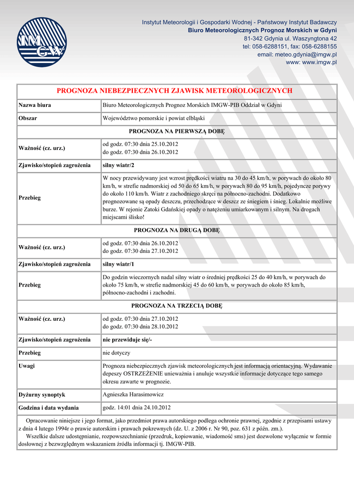 Instytut Meteorologii i Gospodarki Wodnej - Państwowy Instytut Badawczy Biuro Meteorologicznych Prognoz Morskich w Gdyni 81-342 Gdynia ul. Waszyngtona 42 tel: 058-6288151, fax: 058-6288155 email: [email protected] www: www.imgw.pl PROGNOZA NIEBEZPIECZNYCH ZJAWISK METEOROLOGICZNYCH Nazwa biura Biuro Meteorologicznych Prognoz Morskich IMGW-PIB Oddział w Gdyni Obszar Województwo pomorskie i powiat elbląski PROGNOZA NA PIERWSZĄ DOBĘ Ważność (cz. urz.) od godz. 07:30 dnia 25.10.2012 do godz. 07:30 dnia 26.10.2012 Zjawisko/stopień zagrożenia silny wiatr/2 Przebieg W nocy przewidywany jest wzrost prędkości wiatru na 30 do 45 km/h, w porywach do około 80 km/h, w strefie nadmorskiej od 50 do 65 km/h, w porywach 80 do 95 km/h, pojedyncze porywy do około 110 km/h. Wiatr z zachodniego skręci na północno-zachodni. Dodatkowo prognozowane są opady deszczu, przechodzące w deszcz ze śniegiem i śnieg. Lokalnie możliwe burze. W rejonie Zatoki Gdańskiej opady o natężeniu umiarkowanym i silnym. Na drogach miejscami ślisko! PROGNOZA NA DRUGĄ DOBĘ Ważność (cz. urz.) od godz. 07:30 dnia 26.10.2012 do godz. 07:30 dnia 27.10.2012 Zjawisko/stopień zagrożenia silny wiatr/1 Przebieg Do godzin wieczornych nadal silny wiatr o średniej prędkości 25 do 40 km/h, w porywach do około 75 km/h, w strefie nadmorskiej 45 do 60 km/h, w porywach do około 85 km/h, północno-zachodni i zachodni. PROGNOZA NA TRZECIĄ DOBĘ Ważność (cz. urz.) od godz. 07:30 dnia 27.10.2012 do godz. 07:30 dnia 28.10.2012 Zjawisko/stopień zagrożenia nie przewiduje się/- Przebieg nie dotyczy Uwagi Prognoza niebezpiecznych zjawisk meteorologicznych jest informacją orientacyjną. Wydawanie depeszy OSTRZEŻENIE unieważnia i anuluje wszystkie informacje dotyczące tego samego okresu zawarte w prognozie. Dyżurny synoptyk Agnieszka Harasimowicz Godzina i data wydania godz. 14:01 dnia 24.10.2012 Opracowanie niniejsze i jego format, jako przedmiot prawa autorskiego podlega ochronie prawnej, zgodnie z przepisami ustawy z dnia 4 lutego 1994r o prawie autorskim i prawach pokrewnych (dz. U. z 2006 r. Nr 90, poz. 631 z późn. zm.). Wszelkie dalsze udostępnianie, rozpowszechnianie (przedruk, kopiowanie, wiadomość sms) jest dozwolone wyłącznie w formie dosłownej z bezwzględnym wskazaniem źródła informacji tj. IMGW-PIB.