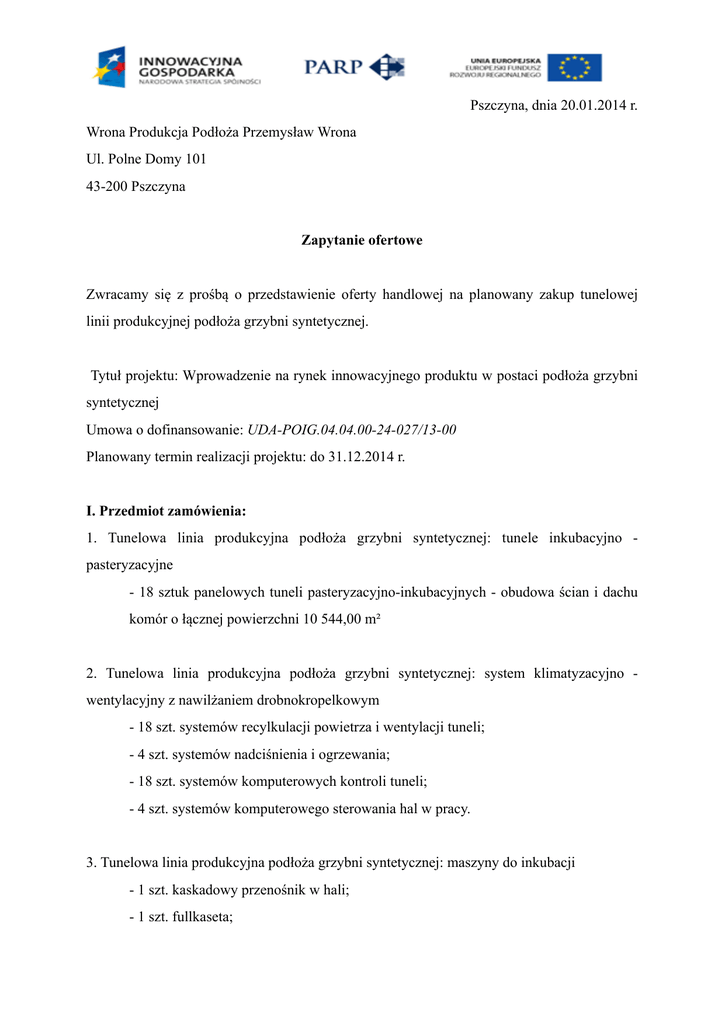 ! Pszczyna, dnia 20.01.2014 r. Wrona Produkcja Podłoża Przemysław Wrona Ul. Polne Domy 101 43-200 Pszczyna Zapytanie ofertowe Zwracamy się z prośbą o przedstawienie oferty handlowej na planowany zakup tunelowej linii produkcyjnej podłoża grzybni syntetycznej. Tytuł projektu: Wprowadzenie na rynek innowacyjnego produktu w postaci podłoża grzybni syntetycznej Umowa o dofinansowanie: UDA-POIG.04.04.00-24-027/13-00 Planowany termin realizacji projektu: do 31.12.2014 r. I. Przedmiot zamówienia: 1. Tunelowa linia produkcyjna podłoża grzybni syntetycznej: tunele inkubacyjno pasteryzacyjne - 18 sztuk panelowych tuneli pasteryzacyjno-inkubacyjnych - obudowa ścian i dachu komór o łącznej powierzchni 10 544,00 m² 2. Tunelowa linia produkcyjna podłoża grzybni syntetycznej: system klimatyzacyjno wentylacyjny z nawilżaniem drobnokropelkowym - 18 szt. systemów recylkulacji powietrza i wentylacji tuneli; - 4 szt. systemów nadciśnienia i ogrzewania; - 18 szt. systemów komputerowych kontroli tuneli; - 4 szt. systemów komputerowego sterowania hal w pracy. 3. Tunelowa linia produkcyjna podłoża grzybni syntetycznej: maszyny do inkubacji - 1 szt. kaskadowy przenośnik w hali; - 1 szt. fullkaseta; ! - 1 szt. maszyna wyciągowa z taśma i siewnikiem grzybni syntetycznej – taśmociąg rewersyjny hala inkubacji 70,00 mb - 1 szt. tablica rozdzielcza. 4. Tunelowa linia produkcyjna podłoża grzybni syntetycznej: Maszyny na halę kostkarki - 1 szt. maszyna wyciągowa z taśmą i dozownikiem; - 18 szt. siatka tunelowa jakości R875; - 1 szt. tunelowa maszyna siatkowa czyszcząca - 127,00 mb - 1 szt. tablica rozdzielcza. II. Kryteria oceny ofert: Nazwa kryterium Liczba punktów Cena 100% III. Wskazówki dotyczące przygotowania ofert: Oferta powinna być ważna do: 28.02.2014 r. Złożona oferta powinna zawierać: − nazwę i adres oferenta; − datę sporządzenia; − cenę całkowitą netto i brutto; − termin ważności oferty; − warunki i termin płatności; − maksymalny czas realizacji; − podpis wykonawcy; Oferta powinna być sporządzona na papierze firmowym oferenta lub opatrzona pieczątką firmową, posiadać datę sporządzenia oraz powinna być podpisana przez oferenta. Oferta może być przesłana: − za pośrednictwem poczty elektronicznej na adres: [email protected]; − za pośrednictwem poczty tradycyjnej na adres: Wrona Produkcja Podłoża Przemysław Wrona Ul. Polne Domy 101 43-200 Pszczyna ! Zapytanie ofertowe zamieszczono na stronie: www.wrona.pl oraz w siedzibie zamawiającego mieszczącej się w Pszczynie na ul. Polne Domy 101 w miejscu publicznie dostępnym. Termin składania ofert upływa w dniu: 30.01.2014 r. W trakcie trwania konkursu ofert nie będą udzielane żadne informacje, które mogłyby mieć wpływ na treść składanych ofert. Załącznik 1. Formularz ofertowy ! Załącznik 1. Formularz ofertowy Nazwa oferenta Adres oferenta Data sporządzenia oferty Termin ważności oferty Cena netto i brutto Cena: Tunelowa linia produkcyjna podłoża grzybni syntetycznej: tunele inkubacyjno - pasteryzacyjne Cena: Tunelowa linia produkcyjna podłoża grzybni syntetycznej: system klimatyzacyjno - wentylacyjny z nawilżaniem drobnokropelkowym Cena: Tunelowa linia produkcyjna podłoża grzybni syntetycznej: maszyny do inkubacji Cena: Tunelowa linia produkcyjna podłoża grzybni syntetycznej: Maszyny na halę kostkarki Termin realizacji Warunki płatności ………………… Podpis