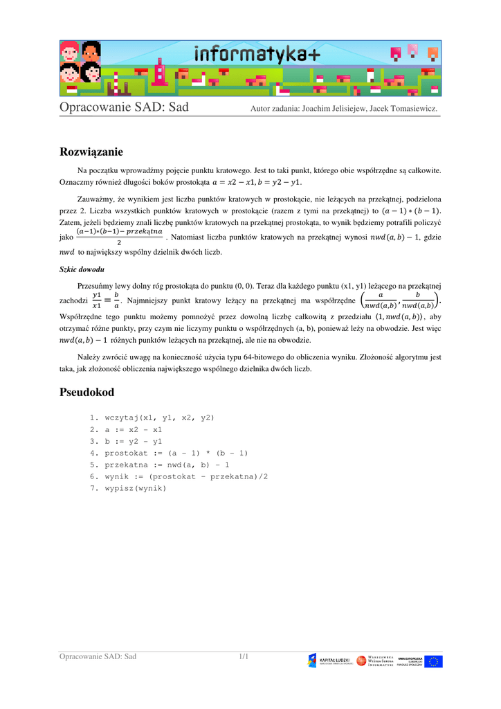 Opracowanie SAD: Sad Autor zadania: Joachim Jelisiejew, Jacek Tomasiewicz. Rozwiązanie Na początku wprowadźmy pojęcie punktu kratowego. Jest to taki punkt, którego obie współrzędne są całkowite. Oznaczmy również długości boków prostokąta ܽ = ݔ2 − ݔ1, ܾ = ݕ2 − ݕ1. Zauważmy, że wynikiem jest liczba punktów kratowych w prostokącie, nie leżących na przekątnej, podzielona przez 2. Liczba wszystkich punktów kratowych w prostokącie (razem z tymi na przekątnej) to (ܽ − 1) ∗ (ܾ − 1). Zatem, jeżeli będziemy znali liczbę punktów kratowych na przekątnej prostokąta, to wynik będziemy potrafili policzyć jako (ିଵ)∗(ିଵ)ି ௭ą௧ ଶ . Natomiast liczba punktów kratowych na przekątnej wynosi ݊ܽ(݀ݓ, ܾ) − 1, gdzie ݊ ݀ݓto największy wspólny dzielnik dwóch liczb. Szkic dowodu Przesuńmy lewy dolny róg prostokąta do punktu (0, 0). Teraz dla każdego punktu (x1, y1) leżącego na przekątnej zachodzi ௬ଵ ௫ଵ = . Najmniejszy punkt kratowy leżący na przekątnej ma współrzędne ቀ௪ௗ(,) , ௪ௗ(,)ቁ. Współrzędne tego punktu możemy pomnożyć przez dowolną liczbę całkowitą z przedziału ۃ1, ݊ܽ(݀ݓ, ܾ) ۄ, aby otrzymać różne punkty, przy czym nie liczymy punktu o współrzędnych (a, b), ponieważ leży na obwodzie. Jest więc ݊ܽ(݀ݓ, ܾ) − 1 różnych punktów leżących na przekątnej, ale nie na obwodzie. Należy zwrócić uwagę na konieczność użycia typu 64-bitowego do obliczenia wyniku. Złożoność algorytmu jest taka, jak złożoność obliczenia największego wspólnego dzielnika dwóch liczb. Pseudokod 1. 2. 3. 4. 5. 6. 7. wczytaj(x1, y1, x2, y2) a := x2 - x1 b := y2 - y1 prostokat := (a - 1) * (b - 1) przekatna := nwd(a, b) - 1 wynik := (prostokat – przekatna)/2 wypisz(wynik) Opracowanie SAD: Sad 1/1