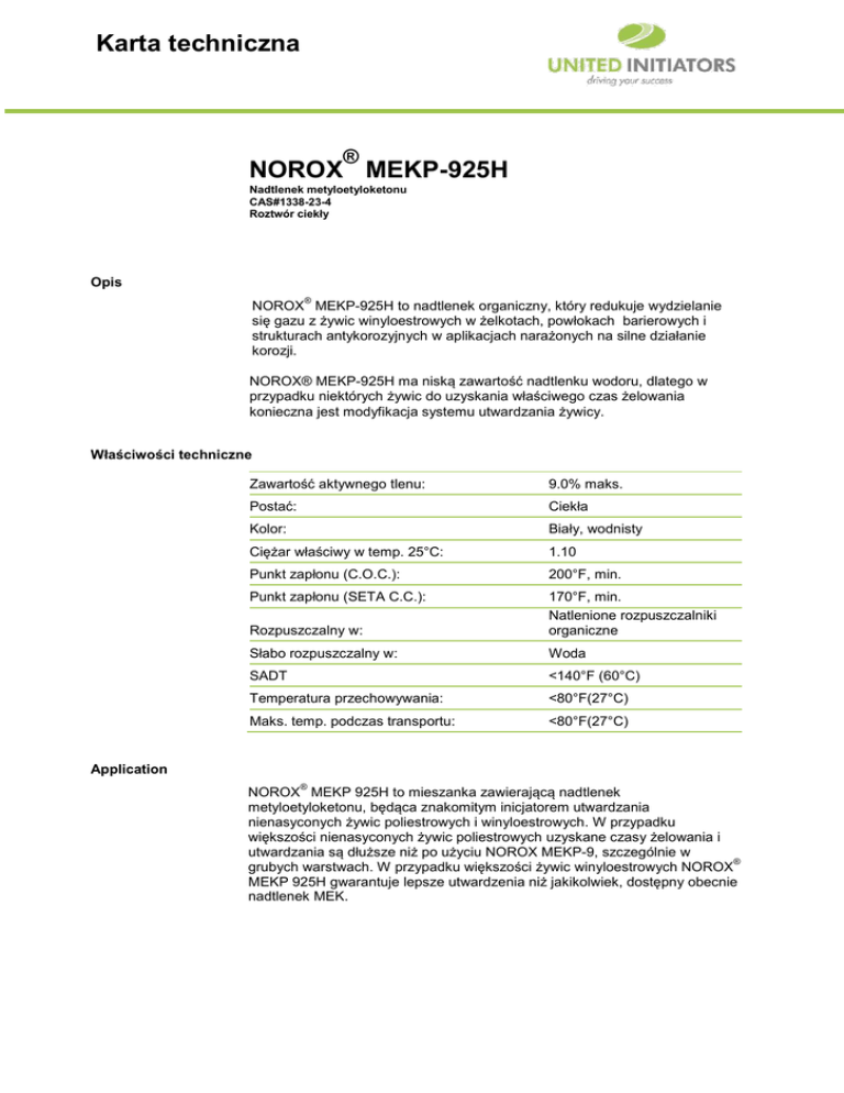 Karta techniczna ® NOROX MEKP-925H Nadtlenek metyloetyloketonu CAS#1338-23-4 Roztwór ciekły Opis ® NOROX MEKP-925H to nadtlenek organiczny, który redukuje wydzielanie się gazu z żywic winyloestrowych w żelkotach, powłokach barierowych i strukturach antykorozyjnych w aplikacjach narażonych na silne działanie korozji. NOROX® MEKP-925H ma niską zawartość nadtlenku wodoru, dlatego w przypadku niektórych żywic do uzyskania właściwego czas żelowania konieczna jest modyfikacja systemu utwardzania żywicy. Właściwości techniczne Zawartość aktywnego tlenu: 9.0% maks. Postać: Ciekła Kolor: Biały, wodnisty Ciężar właściwy w temp. 25°C: 1.10 Punkt zapłonu (C.O.C.): 200°F, min. Punkt zapłonu (SETA C.C.): Rozpuszczalny w: 170°F, min. Natlenione rozpuszczalniki organiczne Słabo rozpuszczalny w: Woda SADT <140°F (60°C) Temperatura przechowywania: <80°F(27°C) Maks. temp. podczas transportu: <80°F(27°C) Application ® NOROX MEKP 925H to mieszanka zawierającą nadtlenek metyloetyloketonu, będąca znakomitym inicjatorem utwardzania nienasyconych żywic poliestrowych i winyloestrowych. W przypadku większości nienasyconych żywic poliestrowych uzyskane czasy żelowania i utwardzania są dłuższe niż po użyciu NOROX MEKP-9, szczególnie w ® grubych warstwach. W przypadku większości żywic winyloestrowych NOROX MEKP 925H gwarantuje lepsze utwardzenia niż jakikolwiek, dostępny obecnie nadtlenek MEK. Karta techniczna PAKOWANIE, TRANSPORT I DOSTĘPNOŚĆ • NOROX® MEKP-925H dostępny jest w zbiornikach polietylenowych o pojemności 5 i 25 kg. W sprawie pojemników niestandardowych należy kontaktować się z lokalnym przedstawicielem United Initiators. • Klasyfikacja – szczegółowe informacje zawarte są w Karcie Charakterystyki Preparatu Niebezpiecznego w punkcie 15 „Informacje o transporcie”. • NOROX® MEKP-925H dostępny jest za pośrednictwem globalnej sieci dystrybucyjnej. Skontaktuj się z United Initiators, aby uzyskać informacje o dystrybutorze w twoim regionie. Powyższe informacje i porady techniczne odzwierciedlają naszą wiedzę i doświadczenie zgromadzone w toku wewnętrznych testów z użyciem lokalnych surowców i mają stanowić źródło wiedzy o naszych produktach oraz ich zastosowaniu. Nie należy traktować ich jako gwarancji konkretnych właściwości produktu ani jego przydatności do określonego celu, ani jako wyczerpującej instrukcji ich użycia. Nie stanowią gwarancji czasu przydatności produktu do użyciu i nie pociągają za sobą odpowiedzialności prawnej jakiekolwiek rodzaju, w tym z tytułu istniejących praw do własności intelektualnej stron trzecich, zwłaszcza praw patentowych. Zastrzegamy sobie prawo do zmiany ich w miarę rozszerzania się stanu naszej wiedzy i rozwoju technologii. Użytkownik korzysta z informacji tu zawartych na własną odpowiedzialność. Każdy produkt powinien należy wcześniej sprawdzić, czy nadaje się do użycia w zamierzony sposób. T: +49 89 74422 237 F: +49 89 74422 6237 [email protected] T: +1 800 231 2702 F. +1 440 323 0898 [email protected] T: +86 20 6131 1370 F: +86 139 2503 8952 [email protected] www.united-initiators.com Numer wersji: 1.0. Date: 03.03.14. Device M: TDS. T: +61 2 9316 0046 F: +61 2 9316 0034 [email protected]
