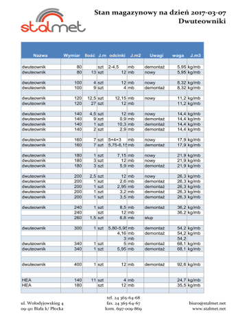 Stan magazynowy na dzień 2017-03-07 Dwuteowniki Nazwa Wymiar Ilość J.m odcinki dwuteownik dwuteownik 80 80 szt 13 szt dwuteownik dwuteownik 100 100 dwuteownik dwuteownik 120 120 dwuteownik dwuteownik dwuteownik dwuteownik 140 140 140 140 dwuteownik dwuteownik 160 160 dwuteownik dwuteownik dwuteownik 180 180 180 dwuteownik dwuteownik dwuteownik dwuteownik dwuteownik 200 200 200 200 200 2,5 1 1 1 1 dwuteownik 240 240 260 dwuteownik Uwagi waga J.m3 mb 12 mb demontaż nowy 5,95 kg/mb 5,95 kg/mb 4 szt 9 szt 12 mb 4 mb nowy demontaż 8,32 kg/mb 8,32 kg/mb 12,5 szt 27 szt 12,15 mb 12 mb nowy 11,2 kg/mb 11,2 kg/mb mb mb mb mb nowy demontaż demontaż demontaż 14,4 14,4 14,4 14,4 7 szt 7 szt 5+4+3 mb 5,75-6,15mb nowy demontaż 17,9 kg/mb 17,9 kg/mb 1 szt 3 szt 3 szt 7,15 mb 12 mb 5,9 mb nowy nowy demontaż 21,9 kg/mb 21,9 kg/mb 21,9 kg/mb 12 2,6 2,95 3,2 3,5 mb mb mb mb mb nowy demontaż demontaż demontaż demontaż 26,3 26,3 26,3 26,3 26,3 1 szt szt 1,5 szt 8,5 mb 12 mb 6,8 mb demontaż 36,2 kg/mb 36,2 kg/mb 300 1 szt demontaż demontaż dwuteownik dwuteownik 340 340 1 szt 1 szt 5,80-5,95mb 4,16 mb 3 mb 5 mb 5,95 mb demontaż demontaż 54,2 54,2 54,2 68,1 68,1 dwuteownik 400 1 szt 12 mb demontaż 92,6 kg/mb HEA HEA 140 180 11 szt szt 4 mb 12 mb ul. Wołodyjowskieg 4 09-411 Biała k/ Płocka 4,5 9 1 2 szt szt szt szt szt szt szt szt szt 2-4,5 J.m2 12 0,9 10,3 2,9 tel. 24 365-64-68 fax. 24 365-64-67 kom. 697-009-869 kg/mb kg/mb kg/mb kg/mb kg/mb kg/mb kg/mb kg/mb kg/mb słup kg/mb kg/mb kg/mb kg/mb 24,7 kg/mb 35,5 kg/mb [email protected] www.stalmet.net Stan magazynowy na dzień 2017-03-07 Dwuteowniki HEB 300 2 szt IPE 100 IPE 100 IPE 120 IPE 140 IPE 160 IPE 160 IPE 160 IPE 180 IPE 180 IPE 200 IPE 200 IPE 240 IPE 330 IPE 330 IPE 360 Dwuteownik specj 240x170 Dwuteownik specj 240x170 9 szt 1 szt 2 szt szt szt szt 1 szt 15 szt 2 szt szt 2 szt 2 szt 1 szt 1 szt 2 szt 1 szt 1 szt Dwuteownik specj 330x160 1 szt ul. Wołodyjowskieg 4 09-411 Biała k/ Płocka 7,3mb; mb 7,75 mb 12 12 12,1 5,2 4 4,65-4,8 14 5-5,30 12,14 5,2 12 12 5 12 12,13 2,7 4,1 117 kg/mb mb mb mb mb mb mb mb mb mb mb mb mb mb mb mb mb mb h-240,b-170 h-240,b-170 kg/mb kg/mb kg/mb kg/mb kg/mb kg/mb kg/mb kg/mb kg/mb kg/mb kg/mb kg/mb kg/mb kg/mb kg/mb kg/mb kg/mb 5 mb h-330,b-160 kg/mb tel. 24 365-64-68 fax. 24 365-64-67 kom. 697-009-869 nowy upłynnienia 8,1 8,1 10,4 12,9 15,8 15,8 15,8 18,8 18,8 22,2 22,2 30,7 49,1 49,1 57,1 [email protected] www.stalmet.net