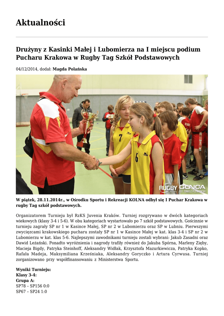 Aktualności Drużyny z Kasinki Małej i Lubomierza na I miejscu podium Pucharu Krakowa w Rugby Tag Szkół Podstawowych 04/12/2014, dodał: Magda Polańska W piątek, 28.11.2014r., w Ośrodku Sportu i Rekreacji KOLNA odbył się I Puchar Krakowa w rugby Tag szkół podstawowych. Organizatorem Turnieju był RzKS Juvenia Kraków. Turniej rozgrywano w dwóch kategoriach wiekowych (klasy 3-4 i 5-6). W obu kategoriach wystartowało po 7 szkół podstawowych. Gościnnie w turnieju zagrały SP nr 1 w Kasince Małej, SP nr 2 w Lubomierzu oraz SP w Lubniu. Pierwszymi zwycięzcami krakowskiego pucharu zostały SP nr 1 w Kasince Małej w kat. klas 3-4 i SP nr 2 w Lubomierzu w kat. klas 5-6. Najlepszymi zawodnikami turnieju zostali wybrani: Jakub Zasadni oraz Dawid Leżański. Ponadto wyróżnienia i nagrody trafiły również do Jakuba Spórna, Marleny Zięby, Macieja Bigdy, Patryka Steinhoff, Aleksandry Widłak, Krzysztofa Mazurkiewicza, Patryka Kopko, Rafała Madeja, Maksymiliana Krześniaka, Aleksandry Goryczko i Artura Cyrwusa. Turniej zorganizowano przy współfinansowaniu z Ministerstwa Sportu. Wyniki Turnieju: Klasy 3-4: Grupa A: SP78 – SP156 0:0 SP67 – SP24 1:0 SP 78 – SP24 1:0 SP67 – SP156 2:1 SP 78 – SP67 2:2 SP 24 – SP156 1:1 Tabela: 1. SP67 8pkt 5:3 2. SP78 6pkt 3:3 3. SP156 5pkt 2:3 4. SP24 5pkt 2:3 (między SP156 a SP24 rozegrano dogrywkę) Grupa B: SP Lubień – SP Kasinka 0:1 SP Lubień – SP8 Kraków 5:0 SP Kasinka – SP8 Kraków 5:0 Tabela: 1. SP Kasinka 6pkt 6:0 2. SP Lubień 4pkt 5:1 3. SP8 Kraków 2pkt 0:10 Półfinały: SP67 Kraków – SP Lubień 0:3 SP78 Kraków - SP Kasinka Mała 0:4 O 5 miejsce: SP156 – SP8 3:1 O 3 miejsce: SP78 – SP67 1:2 O 1 miejsce: SP Kasinka Mała – SP Lubień 3:1 Końcowa kolejność: 1. SP nr 1 Kasinka Mała (trener Łukasz Szlachetka) 2. SP Lubień (trener Anna Surówka) 3. SP nr 67 Kraków (trener Piotr Pasternak) 4. SP nr 78 Kraków (trener Wojciech Urynowicz) 5. SP nr 156 Kraków (trener Jacek Sendra) 6. SP nr 8 Kraków (trener Elżbieta Wolska) 7. SP nr 24 Kraków (trener Grzegorz Jakubiszyn) Klasy 5-6 Grupa A: SP24 II – SP67 0:4 SP Lubomierz – SP Lubień 1:0 SP24 II – SP Lubomierz 0:7 SP Lubień – SP67 4:1 SP Lubomierz – SP67 4:0 SP Lubień – SP24 II 5:0 Tabela: 1. SP nr 2 Lubomierz 9pkt 12:0 2. SP Lubień 7pkt 9:2 3. SP nr 67 Kraków 5pkt 9:4 4. SP nr 24 Kraków II 3pkt 0:16 Grupa B: SP24 – SP78 1:0 SP24 – SP37 2:1 SP78 – SP37 2:1 Tabela: 1. SP nr 24 Kraków 6pkt 3:1 2. SP nr 78 Kraków 4pkt 2:2 3. SP nr 37 Kraków 2pkt 2:4 Półfinały: SP Lubomierz – SP78 7:0 SP Lubień – SP24 5:1 O 5 miejsce: SP37 – SP67 1:2 O 3 miejsce: SP24 – SP78 3:1 O 1 miejsce: SP Lubomierz – SP Lubień 4:1 Końcowa kolejność: 1. SP nr 2 Lubomierz (trener Mateusz Sławecki) 2. SP w Lubniu (trener Anna Surówka) 3. SP nr 24 Kraków (trener Agnieszka Płatek) 4. SP nr 78 Kraków (trener Wojciech Urynowicz) 5. SP nr 67 Kraków (trener Piotr Pasternak) 6.SP nr 37 Kraków (trener Babara Wikiera) 7. SP nr 24 Kraków II (trener Agnieszka Płatek) red. Łukasz Kościelniak