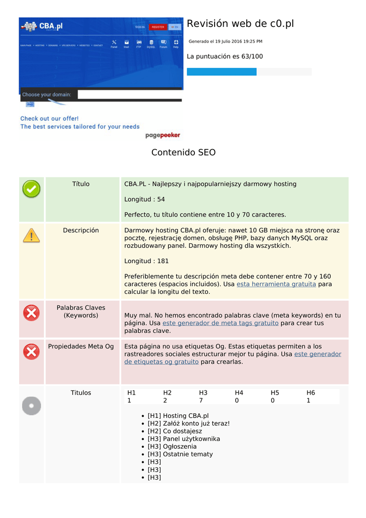 Revisión web de c0.pl Generado el 19 Julio 2016 19:25 PM La puntuación es 63/100 Contenido SEO Título CBA.PL - Najlepszy i najpopularniejszy darmowy hosting Longitud : 54 Perfecto, tu título contiene entre 10 y 70 caracteres. Descripción Darmowy hosting CBA.pl oferuje: nawet 10 GB miejsca na stronę oraz pocztę, rejestrację domen, obsługę PHP, bazy danych MySQL oraz rozbudowany panel. Darmowy hosting dla wszystkich. Longitud : 181 Preferiblemente tu descripción meta debe contener entre 70 y 160 caracteres (espacios incluidos). Usa esta herramienta gratuita para calcular la longitu del texto. Palabras Claves (Keywords) Propiedades Meta Og Titulos Muy mal. No hemos encontrado palabras clave (meta keywords) en tu página. Usa este generador de meta tags gratuito para crear tus palabras clave. Esta página no usa etiquetas Og. Estas etiquetas permiten a los rastreadores sociales estructurar mejor tu página. Usa este generador de etiquetas og gratuito para crearlas. H1 1 H2 2 [H1] [H2] [H2] [H3] [H3] [H3] [H3] [H3] [H3] H3 7 Hosting CBA.pl Załóż konto już teraz! Co dostajesz Panel użytkownika Ogłoszenia Ostatnie tematy H4 0 H5 0 H6 1 Contenido SEO [H3] Najlepszy darmowy hosting cba.pl oferuje: [H6] Copyright © 2005 - 2016 CBA.PL Imagenes Hemos encontrado 20 imágenes en esta web. 18 atributos alt están vacios o no existen. Agrega texto alternativo para que los motores de búsqueda puedan entender las imágenes. Ratio Texto/HTML Ratio : 18% Bien, el ratio entre texto y código HTML de esta página es mayor que 15, pero menor que 25 por ciento. Flash Iframe Perfecto, no se ha detectado contenido Flash en la página. Muy mal, tienes Iframes en la página, esto significa que el contenido no podrá ser indexado. Enlaces SEO Reescritura URL Bien. Tus enlaces parecen amigables Guiones bajos en las URLs Perfecto! No hemos detectado guiones bajos en tus URLs Enlaces en página Hemos encontrado un total de 36 enlaces incluyendo 0 enlace(s) a ficheros Statistics Enlaces Externos : noFollow 0% Enlaces Externos : Pasando Jugo 0% Enlaces Internos 100% Enlaces en página Ancla Tipo Jugo Zaloguj się Interna Pasando Jugo Rejestracja Interna Pasando Jugo Hosting CBA.pl Interna Pasando Jugo Enlaces en página Poczta Interna noFollow FTP Interna noFollow MySQL Interna noFollow Pomoc Interna Pasando Jugo Hosting Interna Pasando Jugo Domeny Interna Pasando Jugo Serwery VPS Interna Pasando Jugo Strony WWW Interna Pasando Jugo Forum Interna Pasando Jugo Regulamin Interna Pasando Jugo Kontakt Interna Pasando Jugo MySQL - procedury składowane i funkcje już dostępne! Interna Pasando Jugo Zajrzyj zanim zapytasz Interna Pasando Jugo Oprogramowanie, które chcielibyście zainstalować na CBA.pl Interna Pasando Jugo Wprowadzenie zadań Crona Interna Pasando Jugo Nowe forum Interna Pasando Jugo Kup domenę .xyz w promocyjnej cenie! Interna Pasando Jugo Nowa opcja - aliasy domen Interna Pasando Jugo PHP 7.0 - już dostępne! Interna Pasando Jugo Certyfikaty SSL Interna Pasando Jugo [ZAKOŃCZONE] Awaria u naszego dostawcy usług 09.12.2015 Interna Pasando Jugo Resetowanie hasła nie działa Interna Pasando Jugo Profesjonalni webmasterzy Interna Pasando Jugo Strony łamiące regulamin cba zgłaszać TUTAJ Interna Pasando Jugo Jak zaktualizować joomlę Interna Pasando Jugo Jak Stworzyć stronę WWW na Donenie i Sub-Domenie Interna Pasando Jugo Kilka pytań o przenoszenie strony Interna Pasando Jugo Problem z FTP Interna Pasando Jugo Enlaces en página Subdomena podpięta do TS3 Interna Pasando Jugo Baza danych- błąd Interna Pasando Jugo CRM na lokalnym czy zdalnym serwerze? Interna Pasando Jugo zobacz szczegóły naszej oferty Interna Pasando Jugo Zarejestruj się już dziś! Interna Pasando Jugo Palabras Clave SEO Nube de Palabras Clave jesteś domeny dostępne hosting już czy strony tej forum cbapl Consistencia de las Palabras Clave Palabra Clave (Keyword) Contenido domeny 10 hosting 7 cbapl 7 już 6 tej 5 Título Palabras Claves (Keywords) Descripció n Titulos Usabilidad Url Dominio : c0.pl Longitud : 5 Favicon Genial, tu web tiene un favicon. Imprimibilidad No hemos encontrado una hoja de estilos CSS para impresión. Idioma Genial. Has declarado el idioma pl. Usabilidad Dublin Core Esta página no usa Dublin Core. Documento Tipo de documento (Doctype) HTML 5 Codificación Perfecto. Has declarado como codificación UTF-8. Validez W3C Errores : 0 Avisos : 0 Privacidad de los Emails Atención! Hemos encontrado por lo menos una dirección de correo electrónico en texto plano. Usa este protector antispam gratuito para ocultarla de los spammers. HTML obsoleto Genial, no hemos detectado ninguna etiqueta HTML obsoleta. Consejos de Velocidad Excelente, esta web no usa tablas. Muy mal, tu web está usando estilos embenidos (inline CSS). Genial, tu página web usa muy pocos ficheros CSS. Perfecto, tu web usa pocos ficheros JavaScript. Su sitio web no se beneficia de gzip. Intente implementarlo en su sitio web. Movil Optimización Móvil Icono para Apple Etiqueta Meta Viewport Contenido Flash Optimización Mapa del sitio XML No disponible Su sitio web no tiene un mapa del sitio XML. Esto puede traerle problemas. Un mapa del sitio enumera las URL que pueden rastrearse y puede incluir información adicional, como las últimas actualizaciones de su sitio web, la frecuencia de cambios y la importancia de las URL. Esto permite a los motores de búsqueda rastrear el sitio web de una forma más exhaustiva. Robots.txt http://c0.pl/robots.txt ¡Estupendo! Su sitio web tiene un archivo robots.txt. Herramientas de Analítica ¡Perfecto! Su sitio web tiene una herramienta de análisis. Google Analytics Powered by TCPDF (www.tcpdf.org)
