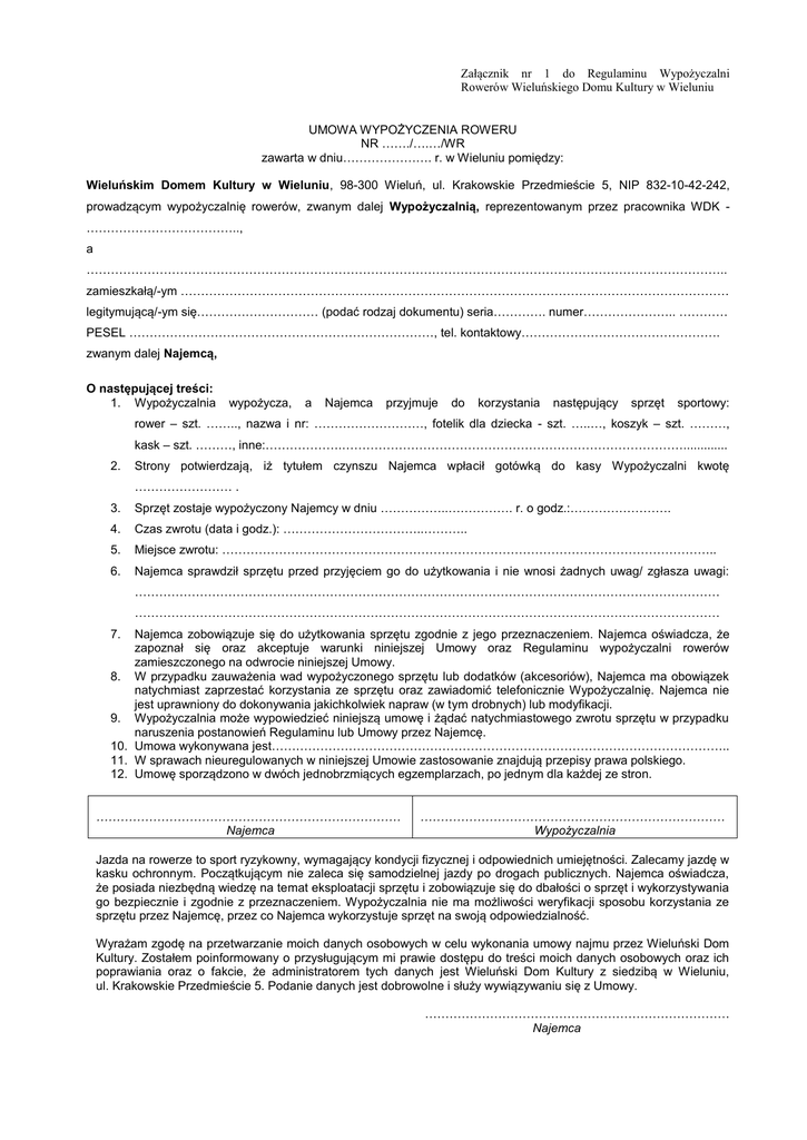 Załącznik nr 1 do Regulaminu Wypożyczalni Rowerów Wieluńskiego Domu Kultury w Wieluniu UMOWA WYPOŻYCZENIA ROWERU NR ……./….…/WR zawarta w dniu…………………. r. w Wieluniu pomiędzy: Wieluńskim Domem Kultury w Wieluniu, 98-300 Wieluń, ul. Krakowskie Przedmieście 5, NIP 832-10-42-242, prowadzącym wypożyczalnię rowerów, zwanym dalej Wypożyczalnią, reprezentowanym przez pracownika WDK ……………………………….., a ………………………………………………………………………………………………………………………………………….. zamieszkałą/-ym ……………………………………………………………………………………………………………………… legitymującą/-ym się………………………… (podać rodzaj dokumentu) seria…………. numer………………….. ………… PESEL …………………………………………………………………, tel. kontaktowy…………………………………………. zwanym dalej Najemcą, O następującej treści: 1. Wypożyczalnia wypożycza, a Najemca przyjmuje do korzystania następujący sprzęt sportowy: rower – szt. …….., nazwa i nr: ………………………, fotelik dla dziecka - szt. …..…, koszyk – szt. ………, kask – szt. ………, inne:……………….…………………………………………………………………………............. 2. Strony potwierdzają, iż tytułem czynszu Najemca wpłacił gotówką do kasy Wypożyczalni kwotę …………………… . 3. Sprzęt zostaje wypożyczony Najemcy w dniu ……………..……………. r. o godz.:……………………. 4. Czas zwrotu (data i godz.): ……………………………..……….. 5. Miejsce zwrotu: ………………………………………………………………………………………………………….. 6. Najemca sprawdził sprzętu przed przyjęciem go do użytkowania i nie wnosi żadnych uwag/ zgłasza uwagi: ……………………………………………………………………………………………………………………………… ……………………………………………………………………………………………………………………………… Najemca zobowiązuje się do użytkowania sprzętu zgodnie z jego przeznaczeniem. Najemca oświadcza, że zapoznał się oraz akceptuje warunki niniejszej Umowy oraz Regulaminu wypożyczalni rowerów zamieszczonego na odwrocie niniejszej Umowy. 8. W przypadku zauważenia wad wypożyczonego sprzętu lub dodatków (akcesoriów), Najemca ma obowiązek natychmiast zaprzestać korzystania ze sprzętu oraz zawiadomić telefonicznie Wypożyczalnię. Najemca nie jest uprawniony do dokonywania jakichkolwiek napraw (w tym drobnych) lub modyfikacji. 9. Wypożyczalnia może wypowiedzieć niniejszą umowę i żądać natychmiastowego zwrotu sprzętu w przypadku naruszenia postanowień Regulaminu lub Umowy przez Najemcę. 10. Umowa wykonywana jest………………………………………………………………………………………………….. 11. W sprawach nieuregulowanych w niniejszej Umowie zastosowanie znajdują przepisy prawa polskiego. 12. Umowę sporządzono w dwóch jednobrzmiących egzemplarzach, po jednym dla każdej ze stron. 7. ………………………………………………………………… Najemca ………………………………………………………………… Wypożyczalnia Jazda na rowerze to sport ryzykowny, wymagający kondycji fizycznej i odpowiednich umiejętności. Zalecamy jazdę w kasku ochronnym. Początkującym nie zaleca się samodzielnej jazdy po drogach publicznych. Najemca oświadcza, że posiada niezbędną wiedzę na temat eksploatacji sprzętu i zobowiązuje się do dbałości o sprzęt i wykorzystywania go bezpiecznie i zgodnie z przeznaczeniem. Wypożyczalnia nie ma możliwości weryfikacji sposobu korzystania ze sprzętu przez Najemcę, przez co Najemca wykorzystuje sprzęt na swoją odpowiedzialność. Wyrażam zgodę na przetwarzanie moich danych osobowych w celu wykonania umowy najmu przez Wieluński Dom Kultury. Zostałem poinformowany o przysługującym mi prawie dostępu do treści moich danych osobowych oraz ich poprawiania oraz o fakcie, że administratorem tych danych jest Wieluński Dom Kultury z siedzibą w Wieluniu, ul. Krakowskie Przedmieście 5. Podanie danych jest dobrowolne i służy wywiązywaniu się z Umowy. ………………………………………………………………… Najemca