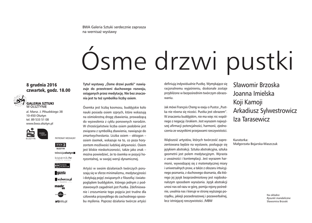 BWA Galeria Sztuki serdecznie zaprasza na wernisaż wystawy Ósme drzwi pustki 8 grudnia 2016 czwartek, godz. 18.00 al. Marsz. J. Piłsudskiego 38 10-450 Olsztyn tel. 89 533 51 08 www.bwa.olsztyn.pl PATRONAT MEDIALNY Tytuł wystawy „Ósme drzwi pustki” nawiązuje do przestrzeni duchowego rozwoju, osiąganych przez medytację. Nie bez znaczenia jest tu też symbolika liczby osiem. definiują indywidualnie Pustkę. Wymykające się racjonalnemu wyjaśnieniu, doskonale zostaje przybliżone w bezpośrednim twórczym obrazowaniu. Ósemka jest liczbą kosmosu, buddyjskie koło nauki posiada osiem szprych, które wskazują na ośmiokrotną drogę zbawienia, prowadzącą do wyzwolenia z cyklu ponownych narodzin. W chrześcijaństwie liczba osiem podobnie jest związana z symboliką zbawienia, nawiązuje do zmartwychwstania. Liczba osiem – oktogon – osiem ósemek, wskazuje na to, co poza horyzontem możliwości ludzkiej aktywności. Osiem jest bliskie nieskończoności, także jako znak – można powiedzieć, że to ósemka w pozycji horyzontalnej, w swojej wersji dynamicznej. Jak mówi François Cheng w eseju o Pustce „Pustka nie równa się nicości. Pustka jest obrazem”. W znaczeniu buddyjskim, nie ma więc nic wspólnego z negacją i brakiem. Jest wyrazem najwyższej afirmacji potencjalności, harmonii, zjednoczenia ze wszystkimi przejawami rzeczywistości. Artyści w swoim działaniach twórczych poruszają się w sferze minimalizmu, medytacyjności i dotykają pojęć związanych z filozofią i światopoglądem buddyjskim, którego jednym z podstawowych zagadnień jest Pustka. Zdefiniowanie i zrozumienie tego pojęcia jest trudne dla człowieka przywykłego do zachodniego sposobu myślenia. Poprzez działania twórcze artyści Większość artystów, których twórczość zaprezentowana będzie na wystawie, posługuje się językiem abstrakcji. Sztuka abstrakcyjna, sztuka geometrii jest polem medytacyjnym. Wyrasta z uważności i kontemplacji. Jest wyrazem harmonii, wywodzącej się z matematycznej miary i uniwersalnych praw, a także z obszaru intuicyjnego poznania, z duchowego doznania, dla którego jej język bezprzedmiotowy jest najdoskonalszym sposobem wyrażania. Język abstrakcji unosi nas od razu w górę, pomija rejony pośrednie, uwalnia nas i kieruje w stronę wyższego porządku, jakiejś pozaobrazowej i pozawerbalnej, lecz istniejącej rzeczywistości. /MBW Sławomir Brzoska Joanna Imielska Koji Kamoji Arkadiusz Sylwestrowicz Iza Tarasewicz Kuratorka: Małgorzata Bojarska-Waszczuk Na okładce Rysunki mandaliczne Sławomira Brzoski