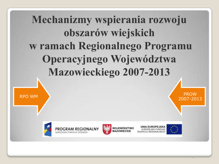Mechanizmy wspierania rozwoju obszarów wiejskich w ramach Regionalnego Programu Operacyjnego Województwa Mazowieckiego 2007-2013 RPO WM PROW 2007-2013 •1 Regionalny Program Operacyjny Województwa Mazowieckiego 2007-2013 RPO WM to największy program regionalny Alokacja z Europejskiego Funduszu Rozwoju Regionalnego – 1,8 mld euro z EFRR Cel główny RPO WM poprawa konkurencyjności regionu i zwiększanie spójności społecznej, gospodarczej i przestrzennej województwa Priorytety RPO WM wyznaczone na podstawie Strategii Rozwoju Województwa Mazowieckiego do roku 2020 Regionalny Program Operacyjny Województwa Mazowieckiego 2007-2013 Mechanizmy wspierania rozwoju obszarów wiejskich w ramach RPO WM: Zaprogramowanie wsparcia obszarów wiejskich Kryteria wyboru projektów Wskaźniki monitorowania projektów realizowanych na obszarach wiejskich Projekty kluczowe dla województwa o dużym oddziaływaniu na obszary wiejskie •3 Zaprogramowane wsparcie dla obszarów wiejskich Wsparcie dla obszarów wiejskich w sześciu priorytetach: I. Tworzenie warunków dla rozwoju potencjału innowacyjnego i przedsiębiorczości na Mazowszu II. e - Rozwój Województwa Mazowieckiego III. Regionalny system transportowy (20% środków przeznaczono na drogi lokalne) V. Wzmacnianie roli miast w rozwoju regionu (działanie 5.1 Transport miejski - projekty wykraczające poza granice administracyjne miast dotyczące budowy, modernizacji infrastruktury, zakupu taboru do obsługi linii podmiejskich) IV. Inwestycje w ochronę środowiska VI. Wykorzystanie walorów naturalnych i kulturowych dla rozwoju turystyki i rekreacji VII. Tworzenie i poprawa warunków dla rozwoju kapitału ludzkiego Wyłączenie: Priorytetu V. Wzmacnianie roli miast w rozwoju regionu w obszarze rewitalizacji obszarów zdegradowanych •4 Kryteria wyboru projektów dotyczące projektów realizowanych na obszarach wiejskich Działanie 2.1. Przeciwdziałanie wykluczeniu informacyjnemu Objęcie projektem instytucji publicznych - promowane będą projekty, które swoim zasięgiem obejmą jak największy procent instytucji publicznych Objęcie projektem ludności - promowane będą projekty, które swoim zasięgiem obejmą jak największy procent ludności Lokalizacja projektu na obszarach wykluczenia informacyjnego – preferowane będą projekty realizowane na obszarach zagrożonych wykluczeniem informacyjnym – tj. o ujemnej wartości wskaźnika innowacyjności. Ocena dokonywana będzie zgodnie z mapą wykluczenia informacyjnego •5 Kryteria wyboru projektów dotyczące projektów realizowanych na obszarach wiejskich Działanie 3.1 Infrastruktura drogowa Wpływ projektu na zintegrowanie regionalnego układu komunikacyjnego i zespolenie z krajowym i europejskim systemem komunikacyjnym – kryterium oceniane będzie na podstawie wykazanej poprawy dostępności do poszczególnych elementów układu komunikacyjnego •6 Kryteria wyboru projektów dotyczące projektów realizowanych na obszarach wiejskich Działanie 4.1 Gospodarka wodno-ściekowa Lokalizacja i wpływ na obszary Natura 2000 - kryterium będzie promowało pozytywny wpływ realizowanego projektu na obszary chronione Zakładana liczba użytkowników z obszarów wiejskich - kryterium oceniane będzie na podstawie udziału liczby osób obsługiwanych w wyniku realizacji projektu z obszarów wiejskich w stosunku do ogólnej liczby osób obsługiwanych w wyniku realizacji projektu Potrzeby z zakresu infrastruktury oczyszczania ścieków, wynikające ze stopnia skanalizowania gminy (%) - Kryterium oceniane będzie na podstawie informacji zawartych w dokumentacji wniosku nt. stopnia skanalizowania gminy wg stanu przed rozpoczęciem realizacji projektu. Kryterium będzie promować gminy o niższym stopniu skanalizowania •7 Kryteria wyboru projektów dotyczące projektów realizowanych na obszarach wiejskich Działanie 5.1 Transport miejski Lokalizacja projektu z zakresu transportu miejskiego – ocena projektu pod kątem poprawy dostępności publicznej komunikacji miejskiej dla osób zamieszkujących tereny zlokalizowane poza granicami administracyjnymi miasta •8 Kryteria wyboru projektów dotyczące projektów realizowanych na obszarach wiejskich Działanie 7.1 Infrastruktura służąca ochronie zdrowia i życia Lokalizacja projektu/dochód podatkowy gminy – kryterium będzie promować projekty realizowane na terenie gminy, w której współczynnik G podstawowych dochodów podatkowych na 1 mieszkańca gminy kształtuje się na poziomie do 100% średniej województwa •9 Kryteria wyboru projektów dotyczące projektów realizowanych na obszarach wiejskich Działanie 7.2 Infrastruktura służąca edukacji Lokalizacja projektu/dochód podatkowy gminy – kryterium będzie promować projekty realizowane na terenie gminy, w której współczynnik G podstawowych dochodów podatkowych na 1 mieszkańca gminy kształtuje się na poziomie do 100% średniej województwa Wpływ projektu na zmniejszenie dysproporcji w dostępie do edukacji pomiędzy obszarami wiejskimi, a miastami - Dysproporcje mierzone są na podstawie % udziału uczniów/słuchaczy z terenów wiejskich w danej placówce, której dotyczy projekt w ogólnej liczbie uczniów/słuchaczy w roku szkolnym poprzedzającym rok złożenia wniosku o dofinansowanie •10 Kryteria wyboru projektów dotyczące projektów realizowanych na obszarach wiejskich Działanie 7.3 Infrastruktura służąca pomocy społecznej Lokalizacja projektu/dochód podatkowy gminy – kryterium będzie promować projekty realizowane na terenie gminy, w której współczynnik G podstawowych dochodów podatkowych na 1 mieszkańca gminy kształtuje się na poziomie do 100% średniej województwa •11 Wskaźniki monitorowania dotyczące projektów realizowanych na obszarach wiejskich Długość nowych dróg lokalnych – 63 km Długość zrekonstruowanych dróg lokalnych – 280 km Liczba utworzonych miejsc pracy w turystyce na obszarach wiejskich – 60 szt.
