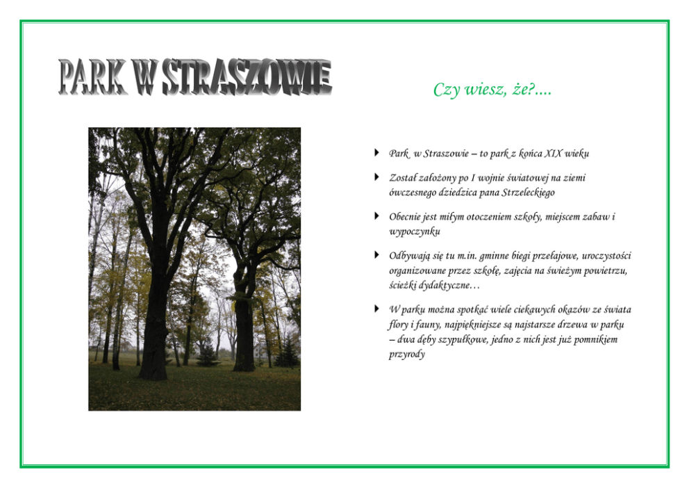 Czy wiesz, że?.... Park w Straszowie – to park z końca XIX wieku Został założony po I wojnie światowej na ziemi ówczesnego dziedzica pana Strzeleckiego Obecnie jest miłym otoczeniem szkoły, miejscem zabaw i wypoczynku Odbywają się tu m.in. gminne biegi przełajowe, uroczystości organizowane przez szkołę, zajęcia na świeżym powietrzu, ścieżki dydaktyczne… W parku można spotkać wiele ciekawych okazów ze świata flory i fauny, najpiękniejsze są najstarsze drzewa w parku – dwa dęby szypułkowe, jedno z nich jest już pomnikiem przyrody