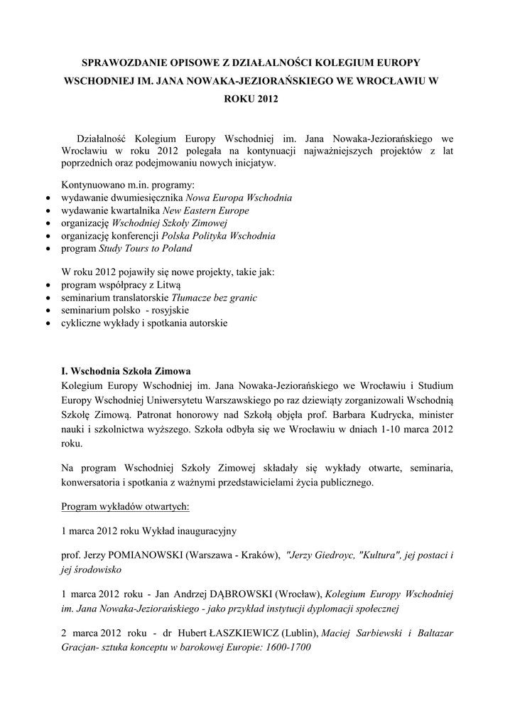 SPRAWOZDANIE OPISOWE Z DZIAŁALNOŚCI KOLEGIUM EUROPY WSCHODNIEJ IM. JANA NOWAKA-JEZIORAŃSKIEGO WE WROCŁAWIU W ROKU 2012 Działalność Kolegium Europy Wschodniej im. Jana Nowaka-Jeziorańskiego we Wrocławiu w roku 2012 polegała na kontynuacji najważniejszych projektów z lat poprzednich oraz podejmowaniu nowych inicjatyw. Kontynuowano m.in. programy: wydawanie dwumiesięcznika Nowa Europa Wschodnia wydawanie kwartalnika New Eastern Europe organizację Wschodniej Szkoły Zimowej organizację konferencji Polska Polityka Wschodnia program Study Tours to Poland W roku 2012 pojawiły się nowe projekty, takie jak: program współpracy z Litwą seminarium translatorskie Tłumacze bez granic seminarium polsko - rosyjskie cykliczne wykłady i spotkania autorskie I. Wschodnia Szkoła Zimowa Kolegium Europy Wschodniej im. Jana Nowaka-Jeziorańskiego we Wrocławiu i Studium Europy Wschodniej Uniwersytetu Warszawskiego po raz dziewiąty zorganizowali Wschodnią Szkołę Zimową. Patronat honorowy nad Szkołą objęła prof. Barbara Kudrycka, minister nauki i szkolnictwa wyższego. Szkoła odbyła się we Wrocławiu w dniach 1-10 marca 2012 roku. Na program Wschodniej Szkoły Zimowej składały się wykłady otwarte, seminaria, konwersatoria i spotkania z ważnymi przedstawicielami życia publicznego. Program wykładów otwartych: 1 marca 2012 roku Wykład inauguracyjny prof. Jerzy POMIANOWSKI (Warszawa - Kraków), "Jerzy Giedroyc, "Kultura", jej postaci i jej środowisko 1 marca 2012 roku - Jan Andrzej DĄBROWSKI (Wrocław), Kolegium Europy Wschodniej im. Jana Nowaka-Jeziorańskiego - jako przykład instytucji dyplomacji społecznej 2 marca 2012 roku - dr Hubert ŁASZKIEWICZ (Lublin), Maciej Sarbiewski i Baltazar Gracjan- sztuka konceptu w barokowej Europie: 1600-1700 3 marca 2012 roku - Cornelius OCHMANN (Berlin), Ocena polskiej prezydencji w Unii Europejskiej ze szczególnym uwzględnieniem Partnerstwa Wschodniego 5 marca 2012 roku - prof. Jan HOLZER (Brno), Aktualne trendy i koncepty w analizie postradzieckiej polityki 6 marca 2012 roku - prof. Rustis KAMUNTAVICIUS (Kowno), Interpretacje przeszłości: białoruskie, polskie i litewskie atlasy historyczne 7 marca 2012 roku - prof. Włodzimierz MARCINIAK Sowieckiego jako symbol nostalgii postimperialnej (Warszawa), Mapa Związku 8 marca 2012 roku DYSKUSJA PANELOWA - Środowiska emigracyjne i ich czasopisma Uczestnicy: prof. Nina BARSZCZEWSKA, dr Rafał HABIELSKI, prof. Piotr MITZNER Bogumiła BERDYCHOWSKA, prof. Prowadzenie: Jan MALICKI (Warszawa) 9 marca 2012 roku - prof. Roman BAECKER (Toruń), Stabilność systemu politycznego w Rosji 10 marca 2012 roku WYKŁAD ZAMYKAJĄCY prof. Jerzy STĘPIEŃ (Warszawa), Polska tradycja konstytucyjna. W dniach 7-9 marca odbyły się także konwersatoria prowadzone Krzysztofa CZYŻEWSKIEGO. Temat konwersatoriów: "Wokół Miłosza". przez Uczestnicy Szkoły pochodzili z Białorusi (8 osób), Gruzji (1 osoba), Polski ( 15 osób), Ukrainy (16 osób). Warto podkreślić bardzo wysoki poziom przysłanych aplikacji. Organizatorzy Wschodniej Szkoły Zimowej dysponowali tylko 30 miejscami, ze względu na bardzo wysoki poziom aplikacji zdecydowali się rozszerzyć pulę miejsc do 40. II. Konferencja Polska Polityka Wschodnia Konferencja odbyła się w dniach 22-24 listopada 2012 roku we Wrocławiu pod patronatem Ministra Spraw Zagranicznych RP Radosława Sikorskiego. Konferencja złożona była z 8 paneli dyskusyjnych poświęconych następującym zagadnieniom: 1. Sukcesy, porażki, rozczarowania - bilans polskiej polityki na obszarze poradzieckim Prowadzenie: Andrzej Brzeziecki Uczestnicy: Katarzyna Pełczyńska - Nałęcz, Olaf Osica, Bartłomiej Sienkiewicz, Krzysztof Stanowski. 2. Stary Prezydent, nowa Rosja Prowadzenie: Jacek Stawiski Uczestnicy: Łukasz Adamski, Stanisław Ciosek, Jarosław Ćwiek - Karpowicz, Jadwiga Rogoża 3. Rola polskich samorządów w polityce wschodniej - turystyka urzędników czy realne efekty Prowadzenie: Bartłomiej Ostrowski Uczestnicy: Aneta Kędziora, Michał Kulesza, Jarosław Obremski, Sławomir Roszczenko 2 4. Polska polityka wschodnia a współpraca ekonomiczna z obszarem poradzieckim Prowadzenie: Maciej Wierzyński Uczestnicy: Bogdan Benczak, Grzegorz Dzik, Krzysztof Domarecki, Jacek Piechota 5. Co zmieniają gruzińskie wybory? Prowadzenie: Wojciech Górecki Uczestnicy: Bartosz Cichocki, Michał Jaros, Dawid Kolbaia, Marian Staszewski 6. Litwa: nie bracia, lecz sąsiedzi. Prowadzenie: Maria Przełomiec Uczestnicy: Jerzy Bahr, Kinga Dudzińska, Jan Malicki, Aleksander Srebrakowski 7. Polska polityka kulturalna na obszarze poradzieckim - nowe wyzwania czy stare koleiny? Prowadzenie: Piotr Kosiewski Uczestnicy: Andrzej Grajewski, Marek Radziwon, Agnieszka Romaszewska - Guzy 8. Białoruś i Ukraina: co dalej? Prowadzenie: Marcin Wojciechowski Uczestnicy: Wojciech Konończuk, Adam Lipiński, Wojciech Borodzicz - Smoliński, Andrzej Szeptycki. Kontrapunkt: Europejska, niemiecka i polska polityka wschodnia: wspólnota interesów czy rozbieżność celów? Prowadzenie: Maria Przełomiec Uczestnicy: Paweł Kowal, Cornelius Ochmann, Jacek Protasiewicz W konferencji wzięło udział około 200 osób, w tym Prezydent Gdańska Paweł Adamowicz, Ambasador Chorwacji Ivan del Vechio, Ambasador Ukrainy Markijan Malskyj, Ambasador Republiki Czeskiej Jan Sechter oraz Katarzyna Pełczyńska Nałęcz, wiceminister spraw zagranicznych RP. Materiały konferencyjne zostały wydane w postaci publikacji pokonferencyjnej Polska Polityka Wschodnia 2012 w nakładzie 1000 egz. III. Program staży i pobytów studyjnych Study Tours to Poland Study Tours to Poland jest Programem Polsko-Amerykańskiej Fundacji Wolności, którego koordynatorem od 2007 roku jest Kolegium Europy Wschodniej im. Jana NowakaJeziorańskiego. Wizyty studyjne w Polsce dla studentów i profesjonalistów z krajów Europy Wschodniej, Azji Centralnej i Kaukazu służą poznaniu Polski, wymianie doświadczeń w zakresie demokratyczny