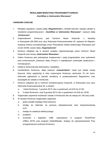 REGULAMIN MARATONU PROGRAMISTYCZNEGO „HackWaw w Uzdrowisko Warszawa” I WARUNKI OGÓLNE 1. Niniejszy regulamin, (zwany dalej „Regulaminem”), określa warunki i zasady udziału w maratonie programistycznym „HackWaw w Uzdrowisko Warszawa”, zwanym dalej „Konkursem”. 2. Organizatorem Konkursu jest Centrum Nauki Kopernik, z siedzibą w Warszawie (00-390) przy ulicy Wybrzeże Kościuszkowskie 20, wpisane do Rejestru Instytucji Kultury prowadzonego przez Prezydenta miasta stołecznego Warszawy pod numer 02/06, zwane dalej „Organizatorem”. 3. Konkurs odbędzie się w ramach projektu organizowanego przez Centrum Nauki Kopernik pod nazwą „Uzdrowisko Warszawa”. 4. Celem Konkursu jest pobudzenie kreatywności i pasji programistów oraz wyłonienie prac konkursowych (zwanych dalej „Praca”) o największym potencjale społecznym i innowacyjnym. 5. Udział w Konkursie jest dobrowolny i bezpłatny. 6. Uczestnikiem Konkursu, dalej zwanym „Uczestnikiem” może być każda osoba fizyczna, która najpóźniej w dniu rozpoczęcia Konkursu ukończyła 18 rok życia, dokonała zgłoszenia w sposób określony w postanowieniach Regulaminu oraz przystąpiła do udziału w Konkursie. 7. Konkurs odbędzie się w Centrum Konferencyjnym Kopernik, w Warszawie przy ulicy Wybrzeże Kościuszkowskie 20, w dniach: a. I dzień Konkursu: 7 grudnia 2013 roku w godzinach od 8:30 do 21:00; b. II dzień Konkursu: oraz 8 grudnia 2013 roku w godzinach od 9:00 do 19:00. 8. Organizator zapewnia możliwość udziału w Konkursie dla nie więcej niż 100 (stu) osób. 9. W ramach Konkursu Organizator zapewnia: a. jeden posiłek każdego dnia konkursu; b. dostęp do Internetu za pomocą zabezpieczonej sieci bezprzewodowej wi-fi; c. dostęp do zasilacza elektrycznego; d. projektor; e. komputer z wejściem USB, wyposażony w program PowerPoint (Office 2010) oraz program AdobeReader, służący do zaprezentowania Prac przygotowanych podczas Konkursu; 1/5 f. miejsce do pracy wyposażone w stoły oraz krzesła dla Uczestników imprezy oraz członków komisji konkursowej. 10. Uczestnik w czasie Konkursu korzysta z własnego komputera. 11. Uczestnicy, którzy zajmą pierwsze miejsce otrzymają nagrody rzeczowe oraz pamiątkowe dyplomy. Wartość nagród rzeczowych dla jednej osoby nie będzie wyższa niż 760 złotych. 12. Warunkiem udziału w konkursie jest akceptacja Regulaminu, oraz spełnienie warunków określonych w Regulaminie, w szczególności dokonanie prawidłowej rejestracji i zgłoszenia się w dniach wydarzenia do udziału w Konkursie II REJESTRACJA 1. Rejestracji do udziału w Konkursie mogą dokonać jedynie osoby, o których jest mowa w rozdziale I pkt.5 Regulaminu. 2. Rejestracja do udziału w Konkursie odbywa się drogą elektroniczną poprzez formularz on-line dostępny na stronie internetowej https://www.eventbrite.com/event/5178170046 3. Rejestracji można dokonać w okresie od 13 listopada 2013 roku od godziny 00:00 do 1 grudnia 2013 roku do godziny 23:59. 4. W przypadku, gdy do udziału w Konkursie zgłosi się nie więcej niż 80 osób, rejestracji można również dokonać w pierwszym dniu Konkursu to jest 7 grudnia 2013 roku w Centrum Konferencyjnym Kopernik. W przypadku opisanym w zdaniu poprzedzającym decyduje kolejność zgłoszeń. III ZASADY KORZYSTANIA Z DANYCH 1. Uczestnik może korzystać z wszystkich niezbędnych podczas Konkursu danych powszechnie dostępnych pod warunkiem korzystania z nich w sposób zgodny z powszechnie obowiązującymi przepisami prawa. 2. Uczestnik w przypadku użycia danych w pracy konkursowej, powinien wskazać źródło ich pochodzenia oraz autora. 3. Wykorzystanie w pracy konkursowej informacji publicznej (w rozumieniu art.1 ustawy o dostępie do informacji publicznej: Dz.U. z 2001r., Nr 112, poz.1198 z późn. zm.) w celu jej dalszego wykorzystania następuje bez ograniczeń warunkami i bezpłatnie, przy czym Organizator nakłada na uczestników Konkursu konieczność zastosowania się do zasad określonych w wyżej wymienionej ustawie oraz zobowiązuje uczestników do: a) poinformowania o źródle, czasie wytworzenia i pozyskania informacji publicznej od podmiotu zobowiązanego (art. 23a ust. 2); b) poinformowania o przetworzeniu informacji ponownie wykorzystywanej. 2/5 IV PRACA KONKURSOWA ORAZ JEJ PREZENTACJA 1. W dniu 7 grudnia 2013 roku po otwarciu Konkursu zgłoszeni Uczestnicy będą informowali komisję konkursową o tematyce zgłoszonego projektu Pracy w ramach jednominutowej prezentacji. 2. Temat przewodni Pracy powinien czerpać z motywu przewodniego Konkursu„Quantified Self”. 3. Projekt Pracy powinien zostać wykonany przez Uczestników Konkursu w grupach nie większych, niż 10 osób. Nie jest dopuszczalne wykorzystywanie podczas trwania Konkursu aplikacji przygotowanych przez Uczestników przed rozpoczęciem Konkursu. 4. Organizator informuje, że technologia wykonania Pracy jest dowolna. 5. Organizator nie wprowadza żadnych ograniczeń na korzystanie z biblioteki narzędzi, o ile ich wykorzystanie nie narusza obowiązujących przepisów prawa. 6. W przypadku zastosowania w Pracy narzędzi programistycznych między innymi zastosowanie bibliotek, framework, api i innych, powinno zostać wskazane w prezentacji Pracy. 7. Uczestnik powinien zakończyć przygotowywanie Pracy najpóźniej 8 grudnia 2013 do godziny 16:30. 8. Uczestnik może zakończyć tworzenie swojej Pracy wcześniej, jednak nie ma to wpływu na wynik Konkursu. 9. Po ukończeniu Pracy każdy Uczestnik, jako autor jest zobowiązany zgłosić ukończoną Pracę, a następnie zaprezentować ją komisji konkursowej. Uczestnicy prezentują swoje prace zgodnie z kolejnością zgłoszenia tematu Pracy. 10. Czas na zaprezentowanie Pracy przez każdego Uczestnika nie może być dłuższy niż 5 minut. 11. Organizator zastrzega sobie prawo do przerwania Uczestnikowi udziału w Konkursie, odmówienia przyjęcia zgłoszenia lub możliwości zaprezentowania swojej pracy, jeżeli oko