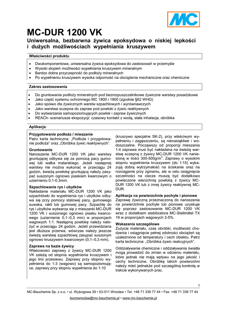 MC-DUR 1200 VK Uniwersalna, bezbarwna żywica epoksydowa o niskiej lepkości i dużych możliwościach wypełniania kruszywem Właściwości produktu Dwukomponentowa, uniwersalna żywica epoksydowa do zastosowań w przemyśle Wysoki stopień możliwości wypełniania kruszywem mineralnym Bardzo dobra przyczepność do podłoży mineralnych Po wypełnieniu kruszywem wysoka odporność na obciążenia mechaniczne oraz chemiczne Zakres zastosowania Do gruntowania podłoży mineralnych pod bezrozpuszczalnikowe żywiczne warstwy posadzkowe Jako część systemu ochronnego MC 1800 i 1900 (zgodnie §62 WHG) Jako spoiwo dla żywicznych warstw szpachlowych i wyrównawczych Jako warstwa sczepna do zapraw pod powłoki z żywic reaktywnych Do wytwarzania samopoziomujących powłok i zapraw żywicznych REACh- scenariusze ekspozycji: czasowy kontakt z wodą, stała inhalacja, obróbka Aplikacja Przygotowanie podłoża / mieszanie Patrz karta techniczna: „Podłoże i przygotowanie podłoża” oraz „Obróbka żywic reaktywnych”. Gruntowanie Nanoszenie MC-DUR 1200 VK jako warstwy gruntującej odbywa się za pomocą pacy gumowej lub wałka malarskiego. Jeżeli następnej warstwy nie można wykonać w przeciągu 24 godzin, świeżą powłokę gruntującą należy zasypać suszonym ogniowo piaskiem kwarcowym o uziarnieniu 0,1-0,3mm. Szpachlowanie rys i ubytków Nakładanie materiału MC-DUR 1200 VK jako szpachlówki do wypełnienia rys i ubytków odbywa się przy pomocy stalowej pacy, gumowego suwaka, rakli lub gumowej pacy. Szpachlę do rys i ubytków wytwarza się z mieszanki MC-DUR 1200 VK i suszonego ogniowo piasku kwarcowego (uziarnienie 0,1–0,3 mm) w proporcjach wagowych 1:1. Następną powłokę należy nałożyć w przeciągu 24 godzin. Jeżeli przewidziana jest dłuższa przerwa, wówczas należy jeszcze świeżą warstwę szpachlową zasypać suszonym ogniowo kruszywem kwarcowym (0,1–0,3 mm). Zaprawa na bazie żywicy Właściwości zaprawy z żywicy MC-DUR 1200 VK zależą od stopnia wypełnienia kruszywem i jego linii przesiewu. Zaprawy przy stopniu wypełnienia do 1:3 (wagowo) są samopoziomujące, zaprawy przy stopniu wypełnienia do 1:10 (kruszywo specjalne SK-2), przy właściwym wypełnieniu i zagęszczeniu, są nienasiąkliwe i wodoszczelne. Począwszy od proporcji mieszania 1:4 zaprawa musi być nakładana na świeżą warstwę sczepną z żywicy MC-DUR 1200 VK nanie2 sioną w ilości 300-500g/m . Zaprawy o wysokim stopniu wypełnienia kruszywem (do 1:15) wykazują dobrą wytrzymałość na ściskanie oraz na rozciąganie przy zginaniu, ale w celu osiągnięcia szczelności na ciecze muszą być dodatkowo powleczone wierzchnią powłoką z żywicy MCDUR 1200 VK lub z innej żywicy reaktywnej MCDUR. Aplikacja na powierzchnie pochyłe i pionowe Zaprawę żywiczną przeznaczoną do nanoszenia na powierzchnie pochyłe lub pionowe uzyskuje się poprzez zastosowanie MC-DUR 1200 VK wraz z dodatkiem stabilizatora MC-Stellmittel TX 19 w proporcjach wagowych 3-5%. Wskazania szczegółowe Zużycie materiału, czas obróbki, możliwość chodzenia i osiągnięcie pełnej zdolności obciążeń są uzależnione od temperatury i cech obiektu. Patrz karta techniczna: „Obróbka żywic reakcyjnych”. Oddziaływanie chemiczne i oddziaływania światła mogą prowadzić do zmian w odcieniu materiału, które jednak nie mają wpływu na jego jakość i cechy techniczne. Obróbkę takich powierzchni należy mieć jednakże pod szczególną kontrolą w trakcie wykonywanych prac. 1 MC-Bauchemie Sp. z o.o. • ul. Wyścigowa 39 • 53-011 Wrocław • Tel. +48 71 339 77 44 • Fax: +48 71 339 77 44 [email protected] • www.mc-bauchemie.pl Właściwości techniczne MC-DUR 1200 VK Parametr Jednostka Wartość Uwagi Proporcje mieszania cz. wagowe 3:1 żywica : utwardzacz Gęstość g/cm³ ok. 1,1 - Lepkość mPa∙s ok. 600 przy 20°C i 50% wilgotności powietrza minuty ok. 30 ok. 25 ok. 20 ok. 15 przy 20°C i 50% wilgotności powietrza Możliwość chodzenia godziny ok. 12 przy 20°C i 50% wilgotności powietrza Pełne obciążenie dni 7 przy 20°C i 50% wilgotności powietrza Czas przerobu: 1 kg-pojemnik 5 kg-pojemnik 10 kg-pojemnik 30 kg-pojemnik Środek wiążący żywica : dodatek kruszywo kwarcowe 0,2–0,7mm (proporcje mieszania 1:5) Wytrzymałość na ściskanie N/mm² ok. 72 po 7 dniach Wytrzymałość na rozciąganie przy zginaniu N/mm² ok. 25 po 7 dniach Środek wiążący zywica : dodatek kruszywo specjalne SK-1 (proporcje mieszania 1:8) Wytrzymałość na ściskanie N/mm² ok. 75 po 7 dniach Wytrzymałość na rozciąganie przy zginaniu N/mm² ok. 30 po 7 dniach Warunki obróbki °C % K ≥10 - ≤30 ≤ 85 3 temp. powietrza, podłoża i materiału wilgotność względna powyżej punktu rosy Cechy produktowe MC-DUR 1200 VK Środek do czyszczenia narzędzi MC-Reinigunsmittel U Kolor Bezbarwny Forma dostawy Pary pojemników 6 x1 kg (karton), 10 kg lub 30 kg Składowanie Około 1 roku przy składowaniu w oryginalnie zamkniętych pojemnikach, w chłodnych i suchych w warunkach (poniżej 20°C). Chronić przed mrozem! Utylizacja Należy dokładnie opróżniać pojemniki przestrzegając w tym względzie informacji w sprawie opakowań. Na życzenie wysyłamy informacje pt. „Koncepcja firmy MC w sprawie utylizacji całkowicie opróżnionych opakowań transportowych i handlowych”. Dyrektywa EU 2004/42 RL2004/42/EG/AII/j (550/500 g/l) max 193 g/l VOC Wskazania dotyczące bezpieczeństwa Prosimy o przestrzeganie wskazówek wykonawczych oraz uwag dotyczących bezpieczeństwa obróbki, umieszczonych na etykietach pojemników oraz w kartach bezpieczeństwa. Należy także zapoznać się z „Ogólnymi warunkami obróbki powłok z żywic reaktywnych”. GISCODE: RE1 Uwaga! Wszelkie informacje zawarte w niniejszej karcie oparte są na naszym doświadczeniu i najlepszej wiedzy, jednakże nie mogą być traktowane jako prawnie wiążące. Należy bezwzględnie każdorazowo stosować się do prawodawst