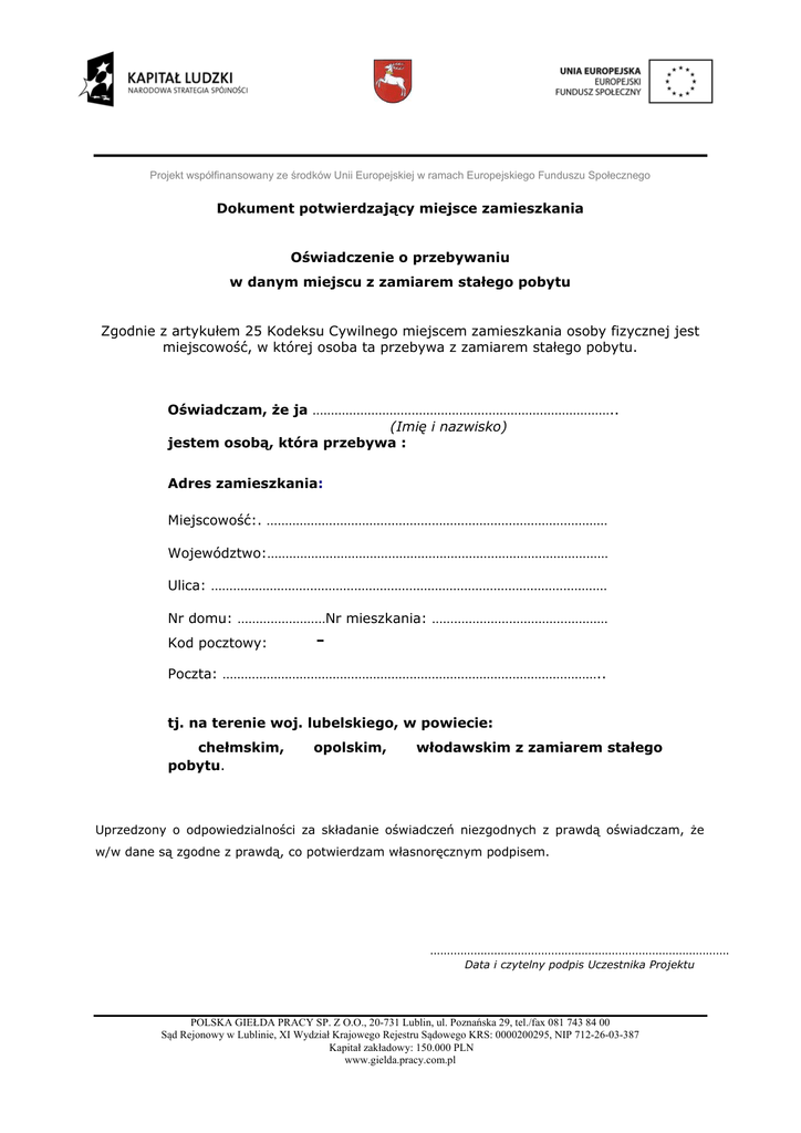 Projekt współfinansowany ze środków Unii Europejskiej w ramach Europejskiego Funduszu Społecznego Dokument potwierdzający miejsce zamieszkania Oświadczenie o przebywaniu w danym miejscu z zamiarem stałego pobytu Zgodnie z artykułem 25 Kodeksu Cywilnego miejscem zamieszkania osoby fizycznej jest miejscowość, w której osoba ta przebywa z zamiarem stałego pobytu. Oświadczam, że ja ……………………………………………………………………….. (Imię i nazwisko) jestem osobą, która przebywa : Adres zamieszkania: Miejscowość:. ………………………………………………………………………………… Województwo:………………………………………………………………………………… Ulica: ……………………………………………………………………………………………… Nr domu: ……………………Nr mieszkania: ………………………………………… Kod pocztowy: - Poczta: ………………………………………………………………………………………….. tj. na terenie woj. lubelskiego, w powiecie: chełmskim, pobytu. opolskim, włodawskim z zamiarem stałego Uprzedzony o odpowiedzialności za składanie oświadczeń niezgodnych z prawdą oświadczam, że w/w dane są zgodne z prawdą, co potwierdzam własnoręcznym podpisem. ......................................................................................... Data i czytelny podpis Uczestnika Projektu POLSKA GIEŁDA PRACY SP. Z O.O., 20-731 Lublin, ul. Poznańska 29, tel./fax 081 743 84 00 Sąd Rejonowy w Lublinie, XI Wydział Krajowego Rejestru Sądowego KRS: 0000200295, NIP 712-26-03-387 Kapitał zakładowy: 150.000 PLN www.gielda.pracy.com.pl