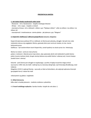 PREZENTACJA MAĆKA 1. Jak ludzie kiedyś wyobrażali sobie świat - Słowianie - mit o Światowicie - książka mitologia Słowian - Afryka - mit o wężu - książka o mitach - starożytna Grecja- mit o żółwiach- żółwie z gry "Pędzące żółwie"- zółw na żółwiu i na zółwiu i na żółwiu itd - starożytność i średniowiecze- ziemia płaska - jak plansza z gry "Niagara" 2. Kopernik i Galileusz// odkrycia geograficzne Kolumb i Magellan Kopernik (pierwsza połowa XVI w.) obliczył, że Ziemia jest planetą, okrągła i tak jak inne ciała niebieskie obraca się względem Słońca, gwiazdy która jest centrum świata, to tzw. teoria heliocentryczna Gallileusz - był zwolennikiem teorii Kopernika, został spalony na stosie przez św. Inkwizycję Słońce to melon- centrum nieruchome pokaz z melonem- Maciek prosi troje dzieci, aby wykonały obrót ciał niebieskich wokół słońca jedno trzyma melona (stoi), drugie ziemię (obraca się wokół słońca i własnej osi), trzecie księżyc (wokół ziemi i słońca) Kolumb - jesli Ziemia jest okrągła to wypływając z punktu A będę musiał do niego wrócić wyruszył w 1492 roku do Indii i natknął się na nieznany dotąd ląd, czyli Amerykę (Środkową), stad Indianie Magellan (1519 r) opłynął Ziemię - wyruszły w ślad za Kolumbem, ale opłynął wybrzeża Ameryki (przylądek Horn) i dotarł do Indii rekwizytami są globus i żaglówka 3. Układ słoneczny kilka zdań o każdej planecie - makieta zrobiona z plasteliny 4. O teorii wielkiego wybuchu- bardzo krotko- książki do rak dzieci:-)
