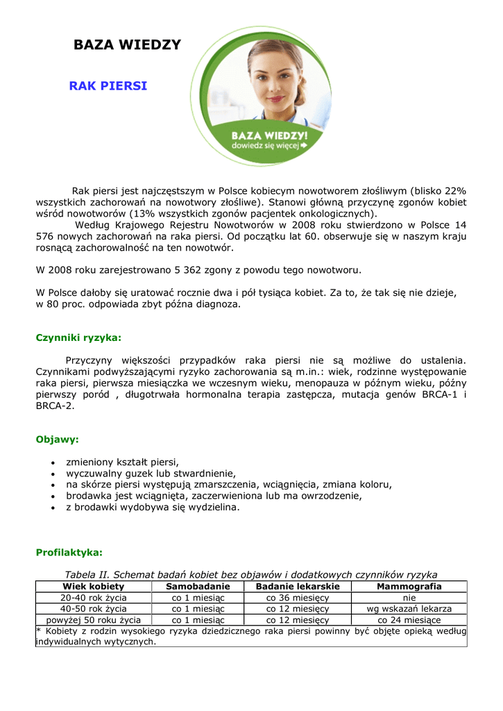 BAZA WIEDZY RAK PIERSI Rak piersi jest najczęstszym w Polsce kobiecym nowotworem złośliwym (blisko 22% wszystkich zachorowań na nowotwory złośliwe). Stanowi główną przyczynę zgonów kobiet wśród nowotworów (13% wszystkich zgonów pacjentek onkologicznych). Według Krajowego Rejestru Nowotworów w 2008 roku stwierdzono w Polsce 14 576 nowych zachorowań na raka piersi. Od początku lat 60. obserwuje się w naszym kraju rosnącą zachorowalność na ten nowotwór. W 2008 roku zarejestrowano 5 362 zgony z powodu tego nowotworu. W Polsce dałoby się uratować rocznie dwa i pół tysiąca kobiet. Za to, że tak się nie dzieje, w 80 proc. odpowiada zbyt późna diagnoza. Czynniki ryzyka: Przyczyny większości przypadków raka piersi nie są możliwe do ustalenia. Czynnikami podwyższającymi ryzyko zachorowania są m.in.: wiek, rodzinne występowanie raka piersi, pierwsza miesiączka we wczesnym wieku, menopauza w późnym wieku, późny pierwszy poród , długotrwała hormonalna terapia zastępcza, mutacja genów BRCA-1 i BRCA-2. Objawy: · · · · · zmieniony kształt piersi, wyczuwalny guzek lub stwardnienie, na skórze piersi występują zmarszczenia, wciągnięcia, zmiana koloru, brodawka jest wciągnięta, zaczerwieniona lub ma owrzodzenie, z brodawki wydobywa się wydzielina. Profilaktyka: Tabela II. Schemat badań kobiet bez objawów i dodatkowych czynników ryzyka Wiek kobiety Samobadanie Badanie lekarskie Mammografia 20-40 rok życia co 1 miesiąc co 36 miesięcy nie 40-50 rok życia co 1 miesiąc co 12 miesięcy wg wskazań lekarza powyżej 50 roku życia co 1 miesiąc co 12 miesięcy co 24 miesiące * Kobiety z rodzin wysokiego ryzyka dziedzicznego raka piersi powinny być objęte opieką według indywidualnych wytycznych. Samobadanie: Samobadanie piersi jest podstawowym, bardzo ważnym elementem w procesie wczesnego wykrywania raka piersi. Składa się z dwóch etapów: oglądania stanu piersi oraz badania dotykowego, tzw. palpacji. Samodzielne badanie piersi należy wykonywać systematycznie, najlepiej w tej samej fazie cyklu miesiączkowego, tj. 2-3 dni po miesiączce, by wykluczyć nadwrażliwość brodawek i bolesność piersi, a w przypadku kobiet niemiesiączkujących raz w miesiącu np. w dniu urodzin Podczas badania kobieta powinna zwracać uwagę na występujące na piersiach: · brodawki i pieprzyki, przebarwienia - czy się nie powiększają, nie zmieniają koloru, · wycieki z brodawki, · otoczkę wokół brodawki - może zmienić swój dotychczasowy regularny kształt, · zmianę kształtu lub wielkości piersi, · obrzęki węzłów chłonnych pod pachą, · guzki i zgrubienia wyczuwalne na piersi, wokół sutka i pod pachą. W przypadku wykrycia guzka w piersi konieczne jest równoczesne zbadanie tego samego fragmentu drugiej piersi. Jeżeli kobieta zaobserwuje podobną zmianę to zazwyczaj nie jest ona groźna (może być uwarunkowana genetycznie), ale wymaga konsultacji lekarza. W pozostałych przypadkach powinna koniecznie skontaktować się z lekarzem i podzielić się swoimi wątpliwościami. USG piersi: USG piersi jest to metoda obrazowa badania z użyciem ultradźwięków. Przeprowadzane jest ono w celu wspomagania i uzupełnienia badania mammograficznego, szczególnie w diagnostyce sutków gruczołowych. USG skutecznie wykrywa łagodne oraz rakowe zmiany w piersi. Zalecane jest kobietom między 20 a 40 rokiem życia, jak również pacjentkom powyżej 40 roku życia, z tego względu, że USG pomaga wykrywać zmiany, których nie wykaże badanie mammograficzne. Jest to metoda nieinwazyjna, bezbolesna i całkowicie bezpieczna (można ją stosować również u kobiet w ciąży i karmiących). Profilaktycznie USG piersi należy robić raz w roku. Wskazaniem do badania mogą być różnego rodzaju stwardnienia, których wcześniej nie było - np. guzki, czy tzw. zaciągnięcie skóry, nietypowy wyciek z sutka u kobiet, które nie są w ciąży ani nie karmią, zmiany w brodawce lub guzki w dołach pachowych. Badanie to nie wymaga specjalnego przygotowania, najlepiej wykonać je w pierwszej połowie cyklu miesiączkowego. Mammografia: Mammografia to rentgenowskie badanie piersi, które jest obecnie najlepszym sposobem wykrywania raka piersi w jego wczesnym stadium rozwoju. Pozwala rozpoznać wczesne zmiany, jak również te, które nie dają się wyczuć podczas badania palpacyjnego, wielkości 2-3 mm. Ucisk stosowany w czasie mammografii nie uszkadza piersi; jest konieczny w celu uzyskania zdjęć wysokiej jakości, a ponadto pozwala na obniżenie dawki promieniowania rentgenowskiego. Mammografia pozwala wcześnie wykrywać 90-95 % zmian nowotworowych, a we wczesnej fazie rozwoju każdy nowotwór może być całkowicie uleczalny. Jeśli jesteś w wieku 50 - 69 lat i: · w ciągu ostatnich dwóch lat nie miałaś wykonywanej mammografii w ramach NFZ, · otrzymałaś w 2010 r. pisemne wskazanie do wykonania ponownej mammografii po 12 miesiącach, · nie miałaś wcześniej stwierdzonej zmiany nowotworowej piersi, zgłoś się na bezpłatne badanie mammograficzne organizowane przez Populacyjny Program Wczesnego Wykrywania Raka Piersi.