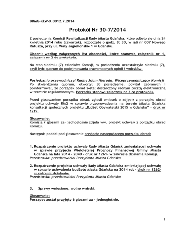BRMG-KRW-X.0012.7.2014 Protokół Nr 30-7/2014 Z posiedzenia Komisji Rewitalizacji Rady Miasta Gdańska, które odbyło się dnia 24 kwietnia 2014 roku (czwartek), rozpoczęte o godz. 8: 30, w sali nr 007 Nowego Ratusza, przy ul. Wały Jagiellońskie 1 w Gdańsku. Obecni: według załączonych list obecności, które stanowią załącznik nr 1, załącznik nr 2 do protokołu. Na stan siedmiu (7) członków Komisji, w posiedzeniu uczestniczyło siedmiu (7), czyli było quorum do podejmowania prawomocnych opinii i wniosków. Posiedzeniu przewodniczył Radny Adam Nieroda, Wiceprzewodniczący Komisji Po stwierdzeniu quorum, otworzył 30 posiedzenie, powitał zebranych i poinformował, Ŝe porządek obrad został dostarczony radnym pocztą elektroniczną w terminie regulaminowym. Porządek stanowi załącznik nr 3 do protokołu. Przed głosowaniem porządku obrad, zgłosił wniosek o zdjęcie z porządku obrad projektu uchwały RMG w sprawie przeprowadzenia na terenie Miasta Gdańska konsultacji społecznych projektu „BudŜet Obywatelski 2015 w Gdańsku” – druk nr 1219. Głosowanie: Komisja 7 głosami za- jednogłośnie zdjęła ww. projekt uchwały z porządku obrad Komisji. Następnie poddał pod głosowanie przyjęcie następującego porządku obrad: 1. Rozpatrzenie projektu uchwały Rady Miasta Gdańsk zmieniającej uchwałę w sprawie przyjęcia Wieloletniej Prognozy Finansowej Gminy Miasta Gdańska na lata 2014 – 2040 - druk nr 1261- w zakresie działania Komisji. Przedstawia: przedstawiciel Prezydenta Miasta Gdańska 2. Rozpatrzenie projektu uchwały Rady Miasta Gdańska zmieniającej uchwałę w sprawie uchwalenia budŜetu Miasta Gdańska na 2014 rok - druk nr 1262w zakresie działania. Przedstawia: przedstawiciel Prezydenta Miasta Gdańska 3. Sprawy wniesione, wolne wnioski. Głosowanie: Porządek został przyjęty 6 głosami za - jednogłośnie. 1 Punkt – 1 Rozpatrzenie projektu uchwały Rady Miasta Gdańsk zmieniającej uchwałę w sprawie przyjęcia Wieloletniej Prognozy Finansowej Gminy Miasta Gdańska na lata 2014 – 2040 - druk nr 1261. Oryginał projektu uchwały – druk nr 1261 stanowi załącznik do protokołu z sesji Rady Miasta Gdańska z kwietnia 2014 roku. Sprawa: BRMG - S.0006.134.2014 Przedstawia: przedstawiciel Prezydenta Miasta Gdańska Pani Jolanta Ostaszewska, Dyrektor Wydziału BudŜetu Miasta i Podatków Zreferowała przedmiotowy projekt uchwały – druk nr 1261 - w zakresie działania Komisji. Wiceprzewodniczący Adam Nieroda Podziękował za przedstawienie informacji. Radna Agnieszka Owczarczak, członek Komisji Zadała pytanie dotyczące zamiany nieruchomości gruntowych między gminą Gdańsk a firmą Euro Styl sp. Z o.o. Pani Jolanta Ostaszewska, Dyrektor Wydziału BudŜetu Miasta i Podatków Odpowiem na to pytanie, gdy będzie rozpatrywany projekt dotyczący zmian w budŜecie. Tej pozycji nie ma w WPF. Wiceprzewodniczący Adam Nieroda Czy ktoś z radnych ma pytania do Wieloletniej Prognozy Finansowej? Nie ma przechodzimy do głosowania. Ustalenia: Opinia Komisji Wiceprzewodniczący Adam Nieroda Poddał pod głosowanie przyjęcie i pozytywne zaopiniowanie projektu uchwały Rady Miasta Gdańska zmieniającej uchwałę w sprawie przyjęcia Wieloletniej Prognozy Finansowej Gminy Miasta Gdańska na lata 20142040 – druk nr 1261 – w zakresie działania Komisji. Głosowanie: Komisja 6 głosami za - jednogłośnie - przyjęła i pozytywnie zaopiniowała przedmiotowy projekt uchwały - bez poprawek, zawarty w druku nr 1261– w zakresie działania Komisji. Opinia Nr 30-7/42/8/2014 2 Punkt – 2 Rozpatrzenie projektu uchwały Rady Miasta Gdańska zmieniającej uchwałę w sprawie uchwalenia budŜetu Miasta Gdańska na 2014 rok - druk nr 1262. Oryginał projektu uchwały – druk nr 1262 stanowi załącznik do protokołu z sesji Rady Miasta Gdańska z kwietnia 2014 roku. Sprawa: BRMG - S.0006.135.2014 Przedstawia: przedstawiciel Prezydenta Miasta Gdańska Pani Jolanta Ostaszewska, Dyrektor Wydziału BudŜetu Miasta i Podatków Zreferowała przedmiotowy projekt uchwały – druk nr 1262 – w zakresie działania Komisji. Wiceprzewodniczący Adam Nieroda Dziękuję. Pani Jolanta Ostaszewska, Dyrektor Wydziału BudŜetu Miasta i Podatków Jeśli chodzi o zamianę nieruchomości gruntowych, o którą pytała pani radna Owczarczak, jest to zamiana między miastem Gdańsk a firmą Euro Styl sp. z o.o., w związku z realizacją przedsięwzięcia miejskiego „Nadmorskie Centrum Rekreacji i Wypoczynku”. Firma Euro Styl odsprzeda miastu Gdańsk grunty w Brzeźnie, przy ul. Hallera 240. W zamian za to miasto odsprzeda firmie grunty w Gdańsku przy ul. Obrońców WybrzeŜa 19A. Przewodniczący Dariusz Słodkowski Jeśli chodzi o to Centrum Nadmorskie, to miała ta inwestycja być realizowana w formule Partnerstwa Publiczno Prywatnego, o ile dobrze pamiętam. Pani Jolanta Ostaszewska, Dyrektor Wydziału BudŜetu Miasta i Podatków Jest przewidziana formuła PPP. W związku z tym na razie jest przygotowywany teren, do tego jest ta zamiana gruntów z firmą Euro Styl, Ŝeby obszar zagospodarowania poszerzyć o te tereny i przygotować propozycję dla potencjalnego partnera prywatnego. Radna Agnieszka Owczarczak, członek Komisji Czyli my do tej pory nie byliśmy właścicielem nieruchomości pod to planowane centrum? Pani Jolanta Ostaszewska, Dyrektor Wydziału BudŜetu Miasta i Podatków Tak. Przewodniczący Dariusz Słodkowski My wciąŜ nie wiemy, co chcemy tylko grunty mamy. Pani Jolanta Ostaszewska, Dyrektor Wydziału BudŜetu Miasta i Podatków Chcemy zrobić Centrum Rekreacyjno-Sportowe, które będzie chciał realizować partner prywatny, a jak partner prywatny będzie chciał wejść w to przedsięwzięcie, to się okaŜe w trakcie procedowania PPP. Radny Piotr Skiba, członek Komisji Czy jakieś wstępne zarysy biznes planu były przygotowywane po stronie miejskiej? 3 Pani Jolanta Ostaszewska, Dyrektor Wydziału BudŜetu Miasta i Podatków W tej chwili p