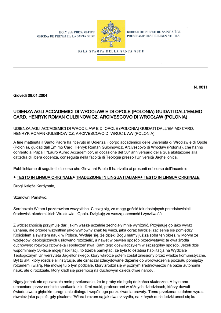 N. 0011 Giovedì 08.01.2004 UDIENZA AGLI ACCADEMICI DI WROCŁAW E DI OPOLE (POLONIA) GUIDATI DALL’EM.MO CARD. HENRYK ROMAN GULBINOWICZ, ARCIVESCOVO DI WROCŁAW (POLONIA) UDIENZA AGLI ACCADEMICI DI WROC Ł AW E DI OPOLE (POLONIA) GUIDATI DALL’EM.MO CARD. HENRYK ROMAN GULBINOWICZ, ARCIVESCOVO DI WROC Ł AW (POLONIA) A fine mattinata il Santo Padre ha ricevuto in Udienza il corpo accademico delle università di Wrocław e di Opole (Polonia), guidati dall’Em.mo Card. Henryk Roman Gulbinowicz, Arcivescovo di Wrocław (Polonia), che hanno conferito al Papa il "Lauro Aureo Accademico", in occasione del 50° anniversario della Sua abilitazione alla cattedra di libera docenza, conseguita nella facoltà di Teologia presso l’Università Jaghellonica. Pubblichiamo di seguito il discorso che Giovanni Paolo II ha rivolto ai presenti nel corso dell’incontro: ● TESTO IN LINGUA ORIGINALE● TRADUZIONE IN LINGUA ITALIANA● TESTO IN LINGUA ORIGINALE Drogi Księże Kardynale, Szanowni Państwo, Serdecznie Witam i pozdrawiam wszystkich. Cieszę się, że mogę gościć tak dostojnych przedstawicieli środowisk akademickich Wrocławia i Opola. Dziękuję za waszą obecność i życzliwość. Z wdzięcznością przyjmuję dar, jakim wasze uczelnie zechciały mnie wyróżnić. Przyjmuję go jako wyraz uznania, ale przede wszystkim jako wymowny znak tej więzi, jaka coraz bardziej zacieśnia się pomiędzy Kościołem a światem nauki w Polsce. Wydaje się, że dzięki Bogu mamy już za sobą ten okres, w którym ze względów ideologicznych usiłowano rozdzielić, a nawet w pewien sposób przeciwstawić te dwa źródła duchowego rozwoju człowieka i społeczeństwa. Sam tego doświadczyłem w szczególny sposób. Jeżeli dziś wspominamy 50-lecie mojej habilitacji, to trzeba pamiętać, że była to ostatnia habilitacja na Wydziale Teologicznym Uniwersytetu Jagiellońskiego, który wkrótce potem został zniesiony przez władze komunistyczne. Był to akt, który rozdzielał instytucje, ale oznaczał zdecydowane dążenie do wprowadzenia podziału pomiędzy rozumem i wiarą. Nie mówię tu o tym podziale, który zrodził się w późnym średniowieczu na bazie autonomii nauk, ale o rozdziale, który kładł się przemocą na duchowym dziedzictwie narodu. Nigdy jednak nie opuszczało mnie przekonanie, że te próby nie będą do końca skuteczne. A było ono umacniane przez osobiste spotkania z ludźmi nauki, profesorami w różnych dziedzinach, którzy dawali świadectwo o głębokim pragnieniu dialogu i wspólnego poszukiwania prawdy. Temu przekonaniu dałem wyraz również jako papież, gdy pisałem: "Wiara i rozum są jak dwa skrzydła, na których duch ludzki unosi się ku 2 kontemplacji prawdy" (Fides et ratio, 1). Wasza obecność tutaj budzi we mnie nadzieję, że ten ożywczy dialog będzie nadal trwał i żadne inne współczesne ideologie nie zdołają go przerwać. Z tą nadzieją patrzę w kierunku wszystkich polskich uniwersytetów, akademii i szkół wyższych. Życzę, aby wielkie możliwości intelektualne i duchowe polskiego świata nauki spotykały się z takim materialnym wsparciem, aby mogły być wykorzystane i objawione światu, dla powszechnego dobra. Raz jeszcze dziękuję. Proszę, zawieźcie moje pozdrowienie waszym wspólnotom akademickim. Niech Bóg wam błogosławi! [00036-09.02] [Testo originale: Polacco] ● TRADUZIONE IN LINGUA ITALIANA Caro Signor Cardinale, Gentili Signori e Signore! Rivolgo un cordiale benvenuto a tutti. Sono lieto di poter accogliere così illustri rappresentanti degli ambienti accademici di Wrocław e di Opole. Vi ringrazio per la presenza e per la benevolenza. Accetto con gratitudine il dono, con il quale i vostri Atenei hanno voluto onorarmi. Lo accolgo come espressione di riconoscenza, ma soprattutto come eloquente segno del legame che sempre di più si stringe tra la Chiesa e il mondo della scienza in Polonia. Sembra che, grazie a Dio, sia già dietro le spalle quel periodo in cui, per ragioni ideologiche, si tentò di dividere, anzi in un certo modo di contrapporre queste due fonti della crescita spirituale dell’uomo e della società. Ne ho fatto esperienza personale in modo del tutto speciale. Se oggi ricordiamo il 50° della mia discussione per l’abilitazione alla cattedra di libera docenza, non si deve dimenticare che tale abilitazione fu l’ultima conseguita nella Facoltà di Teologia presso l’Università Jaghellonica. Poco dopo essa fu soppressa dalle autorità comuniste. Fu un atto volto a dividere le istituzioni, ma suo intento era anche di contrapporre ragione e fede. Non parlo qui di quella distinzione che nacque nel tardo medioevo sulla base dell’autonomia delle scienze, ma della separazione che fu imposta facendo violenza al patrimonio spirituale della nazione. Tuttavia non mi ha mai abbandonato la convinzione che quei tentativi non avrebbero raggiunto, in definitiva, lo scopo. Questa convinzione si rafforzava in me grazie ai personali incontri con gli uomini di scienza, i professori di diverse discipline, i quali testimoniavano il profondo desiderio di dialogo e di comune ricerca della verità. Ho espresso questa convinzione anche come Papa, quando ho scritto: "La fede e la ragione sono come le due ali con le quali lo spirito umano s’innalza verso la contemplazione della verità" (Fides et ratio, 1). La vostra presenza qui ispira in me la speranza che questo dialogo vivificante durerà e che nessuna delle odierne ideologie riuscirà a interromperlo. Con questa speranza guardo verso tutte le università, le accademie e le scuole superiori. Auguro che le grandi possibilità intellettuali e spirituali del mondo scientifico polacco incontrino adeguato supporto materiale, così da poter essere valorizzate e fatte conoscere al mondo a vantaggio del bene comune. Vi ringrazio ancora una volta. Vi prego di portare il mio saluto alle vostre comunità accademiche. Dio vi benedica! [00036-01.01] [Testo originale: Polacco] 3