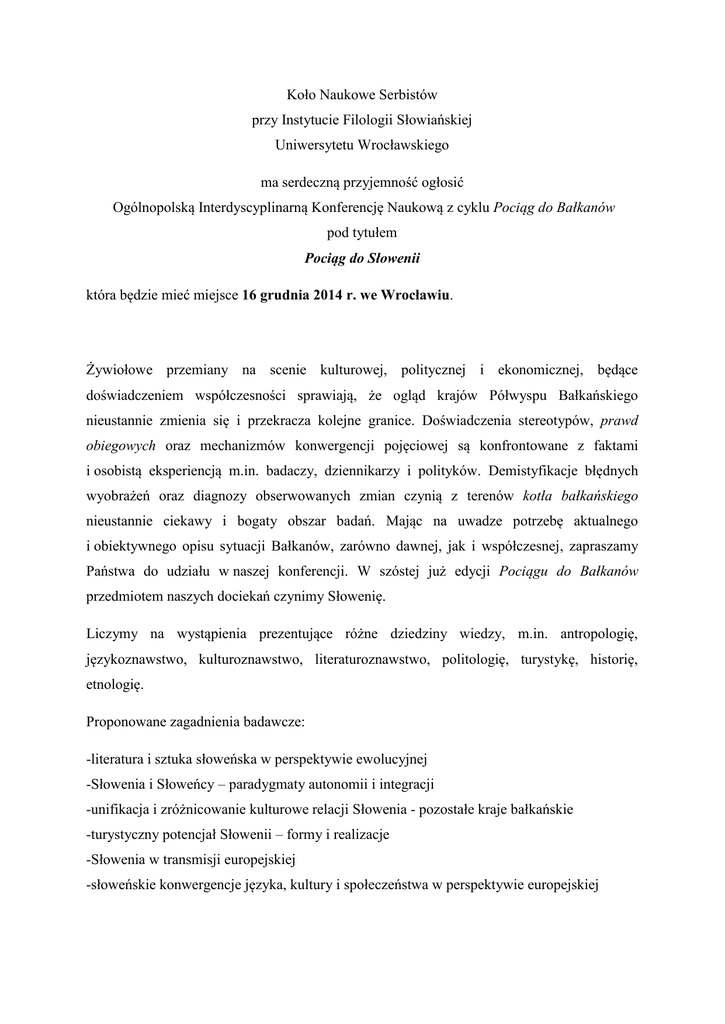 Koło Naukowe Serbistów przy Instytucie Filologii Słowiańskiej Uniwersytetu Wrocławskiego ma serdeczną przyjemność ogłosić Ogólnopolską Interdyscyplinarną Konferencję Naukową z cyklu Pociąg do Bałkanów pod tytułem Pociąg do Słowenii która będzie mieć miejsce 16 grudnia 2014 r. we Wrocławiu. Żywiołowe przemiany na scenie kulturowej, politycznej i ekonomicznej, będące doświadczeniem współczesności sprawiają, że ogląd krajów Półwyspu Bałkańskiego nieustannie zmienia się i przekracza kolejne granice. Doświadczenia stereotypów, prawd obiegowych oraz mechanizmów konwergencji pojęciowej są konfrontowane z faktami i osobistą eksperiencją m.in. badaczy, dziennikarzy i polityków. Demistyfikacje błędnych wyobrażeń oraz diagnozy obserwowanych zmian czynią z terenów kotła bałkańskiego nieustannie ciekawy i bogaty obszar badań. Mając na uwadze potrzebę aktualnego i obiektywnego opisu sytuacji Bałkanów, zarówno dawnej, jak i współczesnej, zapraszamy Państwa do udziału w naszej konferencji. W szóstej już edycji Pociągu do Bałkanów przedmiotem naszych dociekań czynimy Słowenię. Liczymy na wystąpienia prezentujące różne dziedziny wiedzy, m.in. antropologię, językoznawstwo, kulturoznawstwo, literaturoznawstwo, politologię, turystykę, historię, etnologię. Proponowane zagadnienia badawcze: -literatura i sztuka słoweńska w perspektywie ewolucyjnej -Słowenia i Słoweńcy – paradygmaty autonomii i integracji -unifikacja i zróżnicowanie kulturowe relacji Słowenia - pozostałe kraje bałkańskie -turystyczny potencjał Słowenii – formy i realizacje -Słowenia w transmisji europejskiej -słoweńskie konwergencje języka, kultury i społeczeństwa w perspektywie europejskiej Tematy wystąpień (do 15 minut) wraz z abstraktami (do 150 słów) prosimy przesyłać do 5 grudnia 2014 r. na adres mailowy [email protected] Udział w konferencji jest darmowy. Zastrzegamy sobie prawo do selekcji zgłoszeń. Po obradach przewidujemy część kulturową poświęconą współczesnej kulturze słoweńskiej. Pozostając z nadzieją na wiele interesujących wystąpień dr Gordana Đurđev-Małkiewicz kierownik naukowy konferencji