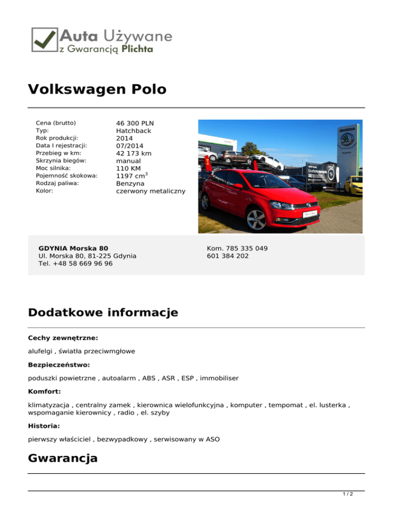 Volkswagen Polo Cena (brutto) Typ: Rok produkcji: Data I rejestracji: Przebieg w km: Skrzynia biegów: Moc silnika: Pojemność skokowa: Rodzaj paliwa: Kolor: 46 300 PLN Hatchback 2014 07/2014 42 173 km manual 110 KM 1197 cm3 Benzyna czerwony metaliczny GDYNIA Morska 80 Ul. Morska 80, 81-225 Gdynia Tel. +48 58 669 96 96 Kom. 785 335 049 601 384 202 Dodatkowe informacje Cechy zewnętrzne: alufelgi , światła przeciwmgłowe Bezpieczeństwo: poduszki powietrzne , autoalarm , ABS , ASR , ESP , immobiliser Komfort: klimatyzacja , centralny zamek , kierownica wielofunkcyjna , komputer , tempomat , el. lusterka , wspomaganie kierownicy , radio , el. szyby Historia: pierwszy właściciel , bezwypadkowy , serwisowany w ASO Gwarancja 1/2 Szanowni Państwo, Pragniemy Państwa poinformować, iż firma Plichta – Autoryzowany Dealer Škoda Auto prowadzi skup oraz sprzedaż samochodów używanych wszystkich marek, oferując także samochody używane z gwarancją objęte programem „Auta używane z Gwarancją Plichta”. W ramach programu „Auta Używane z Gwarancją Plichta ” każdy Klient otrzymuje atrakcyjny pakiet zniżek pozwalający zoptymalizować koszty eksploatacji samochodu: -50% na serwis klimatyzacji -50% na ustawienie zbieżności -50% na kosmetykę auta -50% na ścieżkę diagnostyczną -25% na wymiany oleju -25% na zakup opon + 5zł na sezon za hotelowanie opon -15% na części i akcesoria Oferujemy również kompleksową obsługę w zakresie finansowania i ubezpieczenia: - kredyty już od 4,99% - leasingi i kredyty bez zaświadczeń - uproszczone procedury – decyzja już od 30 min. - atrakcyjne pakiety AC/OC/NW/ASS wiodących firm ubezpieczeniowych Możliwość pozostawienia dotychczas użytkowanego auta w rozliczeniu – BEZPŁATNA WYCENA!!! Zapraszamy wszystkich Klientów na jazdę próbną wybranym autem. Numer oferty: B 164 Informacja nie stanowi oferty w rozumieniu art. 66 KC. Podane dane mają charakter wyłącznie informacyjny. 2/2 Powered by TCPDF (www.tcpdf.org)