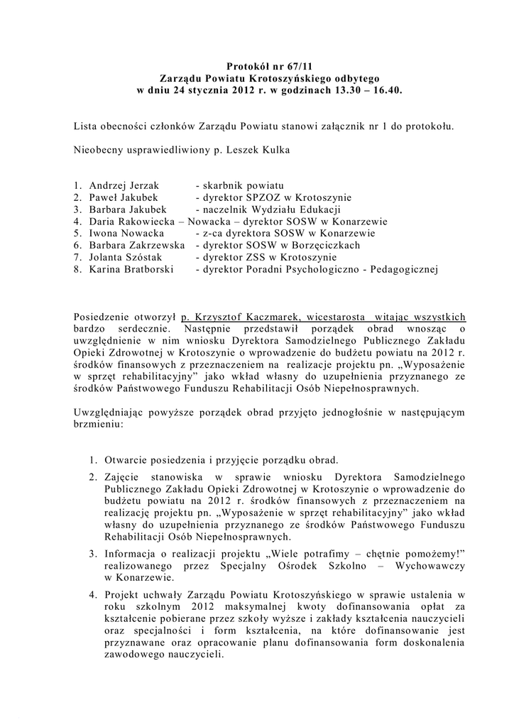 Protokół nr 67/11 Zarządu Powiatu Krotoszyńskiego odbytego w