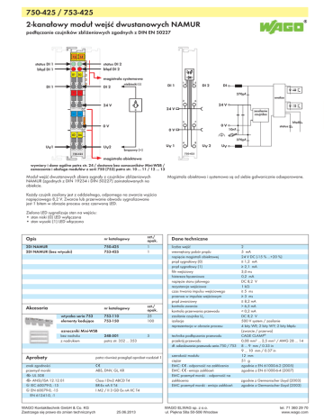 750-425 / 753-425 1 2-kanałowy moduł wejść dwustanowych NAMUR podłączanie czujników zbliżeniowych zgodnych z DIN EN 50227 191 13 14 A status DI 1 błąd DI 1 status DI 2 błąd DI 2 C B D 01 03 magistrala systemowa DI 1 DI 2 + niebieski (-) DI 1 5 1 DI 2 DI + 270pF analiza A 24 V 24 V 24 V + — 6 2 7 3 błąd 0V 0V 1.3 zasilanie czujnika — status 10nF 0V 02 04 270pF UV2 UV1 UV 1 brązowy (+) 8 4 UV 2 UV 750-425 750-425 magistrala obiektowa wymiary i dane ogólne patrz str. 24 / dostawa bez oznaczników Mini-WSB / oznaczenia i obsługa modułów z serii 750 (753) patrz str. 10 ... 11 / 12 ... 13 Moduł wejść dwustanowych zbiera sygnały z czujników zbliżeniowych NAMUR (zgodnych z DIN 19234 i DIN 50227) zainstalowanych na obiekcie. Magistrala obiektowa i systemowa są od siebie galwanicznie odseparowane. Każdy czujnik zasilany jest z oddzielnego, odpornego na zwarcia wyjścia napięciowego 8,2 V. Zwarcie lub przerwanie obwodu sygnalizowane jest 1 bitem w obrazie procesu oraz czerwoną LED. Zielona LED sygnalizuje stan na wejściu: • stan niski (0) LED wyłączona • stan wysoki (1) LED włączona Opis nr katalogowy szt./ opak. Dane techniczne 2DI NAMUR 2DI NAMUR (bez wtyczki) 750-425 753-425 1 1 Akcesoria nr katalogowy szt./ opak. wtyczka seria 753 elementy kodujące 753-110 753-150 25 100 liczba wejść wewnętrzny pobór prądu napięcie magistrali obiektowej prąd sygnałowy (0) prąd sygnałowy (1) filtr wejściowy histereza łączeniowa napięcie stanu jałowego rezystancja wejściowa czas trwania impulsu wejściowego przerwa w impulsie wejściowym prąd zwarciowy kontrola zwarcia kontrola przerwania przewodu zasilanie czujnika UV izolacja reprezentacja w obrazie procesu oznaczniki Mini-WSB bez nadruku z nadrukiem 248-501 patrz str. 352 ... 353 5 Aprobaty patrz również przegląd aprobat rozdział 1 znak zgodności przemysł morski r UL 508 r ANSI/ISA 12.12.01 4 IEC 60079-0, -15 4 EN 60079-0, -15 EN 61241-0, -1 1 ABS, DNV, GL, KR Class I Div2 ABCD T4 BR-Ex nA II T4 I M2 / II 3 GD Ex nA IIC T4 technika podłączania przewodu przekrój przewodu dł. odizolowania przewodu seria 750 / 753 szerokość modułu ciężar EMC: 1 - odporność na zakłócenia EMC: 1 - emisja zakłóceń EMC przemysł morski - odporność na zakłócenia EMC przemysł morski - emisja zakłóceń :$*2.RQWDNWWHFKQLN*PE+&R.* :$*2(/:$*VS]RR =DVWU]HJDVLĊSUDZRGR]PLDQWHFKQLF]Q\FK XO3LĊNQDD:URFáDZ 2 5 mA 24 V DC (-15 % ...+20 %) ≤ 1,2 mA ≥ 2,1 mA 3,0 ms 0,2 mA DC 8,2 V 1 kΩ ≥ 5 ms ≥ 3 ms ≤ 8,2 mA > 6,5 mA < 0,2 mA DC 8,2 V 500 V system / zasilanie 4 bity WE; 2 bity WY; 2 bity błędu (zwarcie / przerwa) CAGE CLAMP® 0,08 mm² ... 2,5 mm² / AWG 28 ... 14 8 ... 9 mm / 0.33 in 9 ... 10 mm / 0.37 in 12 mm 51 g zgodnie z EN 61000-6-2 (2005) zgodnie z EN 61000-6-4 (2007) zgodnie z Germanischer Lloyd (2003) zgodnie z Germanischer Lloyd (2003) WHO ZZZZDJRFRP