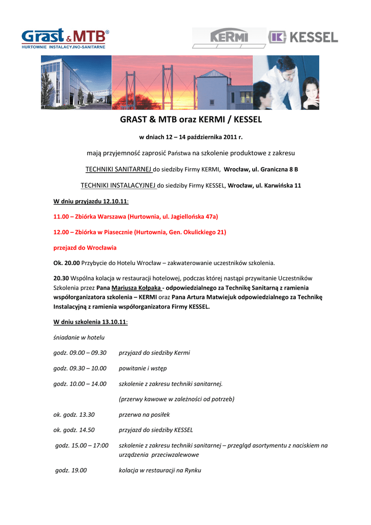 GRAST & MTB oraz KERMI / KESSEL w dniach 12 – 14 października 2011 r. mają przyjemność zaprosić Państwa na szkolenie produktowe z zakresu TECHNIKI SANITARNEJ do siedziby Firmy KERMI, Wrocław, ul. Graniczna 8 B TECHNIKI INSTALACYJNEJ do siedziby Firmy KESSEL, Wrocław, ul. Karwińska 11 W dniu przyjazdu 12.10.11: 11.00 – Zbiórka Warszawa (Hurtownia, ul. Jagiellońska 47a) 12.00 – Zbiórka w Piasecznie (Hurtownia, Gen. Okulickiego 21) przejazd do Wrocławia Ok. 20.00 Przybycie do Hotelu Wrocław – zakwaterowanie uczestników szkolenia. 20.30 Wspólna kolacja w restauracji hotelowej, podczas której nastąpi przywitanie Uczestników Szkolenia przez Pana Mariusza Kołpaka - odpowiedzialnego za Technikę Sanitarną z ramienia współorganizatora szkolenia – KERMI oraz Pana Artura Matwiejuk odpowiedzialnego za Technikę Instalacyjną z ramienia współorganizatora Firmy KESSEL. W dniu szkolenia 13.10.11: śniadanie w hotelu godz. 09.00 – 09.30 przyjazd do siedziby Kermi godz. 09.30 – 10.00 powitanie i wstęp godz. 10.00 – 14.00 szkolenie z zakresu techniki sanitarnej. (przerwy kawowe w zależności od potrzeb) ok. godz. 13.30 przerwa na posiłek ok. godz. 14.50 przyjazd do siedziby KESSEL godz. 15.00 – 17:00 szkolenie z zakresu techniki sanitarnej – przegląd asortymentu z naciskiem na urządzenia przeciwzalewowe godz. 19.00 kolacja w restauracji na Rynku W dniu wyjazdu 14.10.11: śniadanie w hotelu i wyjazd ok. 08.00 – Zbiórka w Holu Hotelowym przejazd do Warszawy PROSIMY O POTWIERDZENIE UDZIAŁU W SZKOLENIU do dnia 03 października 2011 FIRMA:……………………………………………………………………………………………………………………………………………….… IMIĘ I NAZWISKO UCZESTNIKA:………………………………..……………………………………………………………………….… TELEFON KOMÓRKOWY: …………………………….…………………………………………………………………………………………. • OGRANICZONA LICZBA MIEJSC – OBOWIĄZUJE KOLEJNOŚĆ ZGŁOSZEŃ. • OSOBA DO KONTAKTU: Iwona Bednarz , • Tel. 022 736 59 92 lub 60, fax.. 022 736 59 68, [email protected] ***