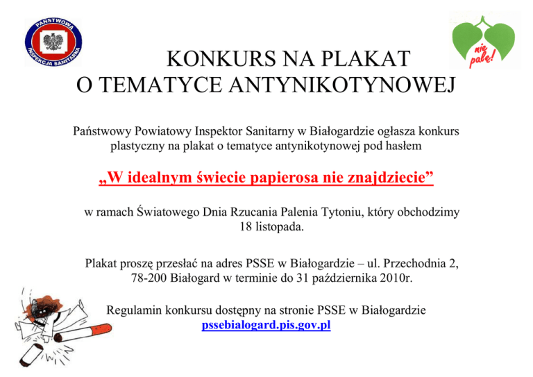 KONKURS NA PLAKAT O TEMATYCE ANTYNIKOTYNOWEJ Państwowy Powiatowy Inspektor Sanitarny w Białogardzie ogłasza konkurs plastyczny na plakat o tematyce antynikotynowej pod hasłem „W idealnym świecie papierosa nie znajdziecie” w ramach Światowego Dnia Rzucania Palenia Tytoniu, który obchodzimy 18 listopada. Plakat proszę przesłać na adres PSSE w Białogardzie – ul. Przechodnia 2, 78-200 Białogard w terminie do 31 października 2010r. Regulamin konkursu dostępny na stronie PSSE w Białogardzie pssebialogard.pis.gov.pl