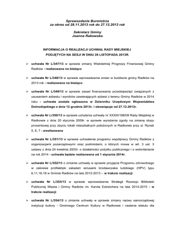 Sprawozdanie Burmistrza za okres od 28.11.2013 rok do 27.12.2013 rok Sekretarz Gminy Joanna Rakowska INFORMACJA O REALIZACJI UCHWAŁ RADY MIEJSKIEJ PODJĘTYCH NA SESJI W DNIU 28 LISTOPADA 2013R. uchwała Nr L/347/13 w sprawie zmiany Wieloletniej Prognozy Finansowej Gminy Radków - realizowana na bieżąco uchwała Nr L/348/13 w sprawie wprowadzenia zmian w budżecie gminy Radków na 2013 rok - realizowana na bieżąco uchwała Nr L/349/13 w sprawie zasad finansowania przedsięwzięć związanych z usuwaniem azbestu i wyrobów zawierających azbest z terenu Gminy Radków w 2014 roku - uchwała została ogłoszona w Dzienniku Urzędowym Województwa Dolnośląskiego z dnia 12 grudnia 2013r. i obowiązuje od 27.12.2013r. uchwała Nr L/350/13 w sprawie uchylenia uchwały nr XXXIII/188/09 Rady Miejskiej w Radkowie z dnia 20 stycznia 2009r. w sprawie wyrażenia zgody na zmianę stopy procentowej przy zbyciu lokali mieszkalnych położonych w Radkowie przy ul. Rynek 5, 6, 7 - zrealizowana uchwała Nr L/351/13 w sprawie uchwalenia programu współpracy Gminy Radków z organizacjami pozarządowymi oraz podmiotami, o których mowa w art. 3 ust. 3 ustawy z dnia 24 kwietnia 2003r. o działalności pożytku publicznego i o wolontariacie na rok 2014 - uchwała będzie realizowana od 1 stycznia 2014r. uchwała Nr L/352/13 o zmianie uchwały w sprawie przyjęcia Programu zdrowotnego w zakresie profilaktyki zakażeń wirusami brodawczaka ludzkiego (HPV) typu 6,11,16,18 w Gminie Radków na lata 2012-2013 - w trakcie realizacji uchwała Nr L/353/13 w sprawie wprowadzenia Strategii Rozwoju Biblioteki Publicznej Miasta i Gminy Radków im. Karola Estreichera na lata 2014-2015 - w trakcie realizacji uchwała Nr L/354/13 o zmianie uchwały w sprawie zmiany nazwy samorządowej instytucji kultury - Gminnego Centrum Kultury w Radkowie i nadania statutu dla Gminnego Centrum Kultury, Sportu i Turystyki w Radkowie – uchwała została ogłoszona w Dzienniku Urzędowym Województwa Dolnośląskiego z dnia 12 grudnia 2013r. i obowiązuje od 27.12.2013r. Uchwała będzie realizowana od stycznia 2014r. uchwała Nr L/355/13 w sprawie wyrażenia zgody na przystąpienie do opracowania i wdrażania Planu gospodarki niskoemisyjnej - w trakcie realizacji uchwała Nr L/356/13 w sprawie udzielenia pomocy finansowej dla Województwa Dolnośląskiego na wypłatę odszkodowań za nieruchomości w ramach realizowanego zadania pn. „Przebudowa odcinka drogi wojewódzkiej nr 387 w m. Ratno Dolne, w rejonie wiaduktu kolejowego” - w trakcie realizacji INFORMACJA O REALIZACJI UCHWAŁ RADY MIEJSKIEJ PODJĘTYCH NA SESJI W DNIU 18 GRUDNIA 2013R. uchwała Nr LI/357/13 w sprawie zmiany Wieloletniej Prognozy Finansowej Gminy Radkowie – realizowana na bieżąco uchwała Nr LI/358/13 w sprawie budżetu gminy Radków na 2014 rok – uchwała będzie realizowana od dnia 1 stycznia 2014r. uchwała Nr LI/359/13 o zmianie uchwały w sprawie Statutu Ośrodka Pomocy Społecznej w Radkowie z siedzibą w Ścinawce Średniej – uchwała została przekazana do ogłoszenia w Dzienniku Urzędowym Województwa Dolnośląskiego i wejdzie w życie po upływie 14 dni od dnia ogłoszenia uchwała Nr LI/360/13 o zmianie uchwały w sprawie uchwalenia programu współpracy Gminy Radków z organizacjami pozarządowymi oraz podmiotami, o których mowa w art. 3 ust. 3 ustawy z dnia 24 kwietnia 2003r. o działalności pożytku publicznego i o wolontariacie na rok 2014 – w trakcie realizacji. INFORMACJA O ZARZĄDZENIACH WYDANYCH PRZEZ BURMISTRZA W OKRESIE MIEDZYSESYJNYM zarządzenie Nr 125/13 z dnia 28 listopada 2013r. w sprawie przeznaczenia gminnej nieruchomości gruntowej do wydzierżawienia - przedmiotowym zarządzeniem przeznaczono do wydzierżawienia gminną nieruchomość gruntową, oznaczoną jako działka nr 117/6 AM 1 o powierzchni 0,5600 ha położoną w Suszynie (grunty zadrzewione i zakrzewione) zarządzenie Nr 126/13 z dnia 28 listopada 2013r. w sprawie utraty mocy Zarządzenia nr 10/2002 Burmistrza Miasta i Gminy Radków z dnia 31 grudnia 2002r. w sprawie przekazania w użyczenie z dniem 01-01-2003 nieruchomości stanowiących własność Gminy Radków - dotyczy kontenerowych stacji telefonicznych przekazanych w użyczenie dla GZUP-u w Radkowie zarządzenie Nr 127/13 z dnia 29 listopada 2013r. w sprawie powołania likwidatora Gminnych Zakładów Użyteczności Publicznej w Radkowie - przedmiotowym zarządzeniem powołano likwidatora Gminnych Zakładów Użyteczności Publicznej w Radkowie w osobie Pana Piotra Mruka. Likwidator będzie pełnił swoje obowiązki od dnia 1 grudnia 2013r. do czasu zakończenia procesu likwidacyjnego, zgodnie z przepisami prawa, uchwałą Nr XLIX/345/13 Rady Miejskiej w Radkowie z dnia 30 października 2013r., harmonogramem ramowym oraz zawartą z nim umową zlecenia. zarządzenie Nr128/13 z dnia 29 listopada 2013r. w sprawie zmian w budżecie gminy na 2013 rok - w wyniku wprowadzonych zmian plan budżetu gminy na 2013 rok wynosi po stronie dochodów 34.421.246,95 zł oraz po stronie wydatków 36,173.979,95 zł zarządzenie Nr 129/13 z dnia 2 grudnia 2013r. w sprawie ogłoszenia konkursu na realizację szczepień profilaktycznych przeciwko rakowi szyjki macicy, wywoływanego przez wirusy HPV, dotyczących dziewcząt urodzonych w roku 2000,2001 i w 2002 w ramach programu zdrowotnego pn.: „Program Zdrowotny w zakresie profilaktyki zakażeń wirusami brodawczaka ludzkiego (HPV) typu 6,11,16,18 w Gminie Radków na lata 2012-2015” - przedmiotowym zarządzeniem ogłoszono konkurs na realizację w/w Programu oraz powołano konkursowych w składzie: komisję konkursową do rozpatrzenia ofert Elżbieta Polanowska - przewodnicząca; Marzena Dukielska - członek; Ewa Sowa - członek zarządzenie Nr 130/13 z dnia 3 grudnia 2013r. w sprawie ustalenia zasad płatności oraz wysokości stawek bazowych czynszu dzierżawnego - przedmiotowym zarządzeniem ustalono stawki bazowe czynszu dzierżawnego należnego z tytułu dzierżawy g
