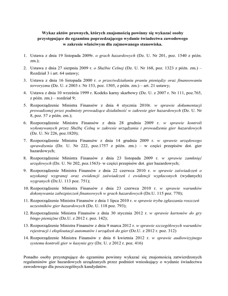 Wykaz aktów prawnych, których znajomością powinny się wykazać osoby przystępujące do egzaminu poprzedzającego wydanie świadectwa zawodowego w zakresie właściwym dla zajmowanego stanowiska. 1. Ustawa z dnia 19 listopada 2009r. o grach hazardowych (Dz. U. Nr 201, poz. 1540 z późn. zm.); 2. Ustawa z dnia 27 sierpnia 2009 r. o SłuŜbie Celnej (Dz. U. Nr 168, poz. 1323 z późn. zm.) – Rozdział 3 i art. 64 ustawy; 3. Ustawa z dnia 16 listopada 2000 r. o przeciwdziałaniu praniu pieniędzy oraz finansowaniu terroryzmu (Dz. U. z 2003 r. Nr 153, poz. 1505, z późn. zm.) – art. 21 ustawy; 4. Ustawa z dnia 10 września 1999 r. Kodeks karny skarbowy (Dz. U. z 2007 r. Nr 111, poz.765, z późn. zm.) – rozdział 9; 5. Rozporządzenie Ministra Finansów z dnia 4 stycznia 2010r. w sprawie dokumentacji prowadzonej przez podmioty prowadzące działalność w zakresie gier hazardowych (Dz. U. Nr 8, poz. 57 z późn. zm.); 6. Rozporządzenie Ministra Finansów z dnia 28 grudnia 2009 r. w sprawie kontroli wykonywanych przez SłuŜbę Celną w zakresie urządzania i prowadzenia gier hazardowych (Dz. U. Nr 226, poz.1820); 7. Rozporządzenie Ministra Finansów z dnia 14 grudnia 2009 r. w sprawie urzędowego sprawdzenia (Dz. U. Nr 222, poz.1757 z późn. zm.) – w części przepisów dot. gier hazardowych; 8. Rozporządzenie Ministra Finansów z dnia 23 listopada 2009 r. w sprawie zamknięć urzędowych (Dz. U. Nr 202, poz.1563)- w części przepisów dot. gier hazardowych; 9. Rozporządzenie Ministra Finansów z dnia 22 czerwca 2010 r. w sprawie zaświadczeń o uzyskanej wygranej oraz ewidencji zaświadczeń i ewidencji wypłaconych (wydanych) wygranych (Dz.U. 113 poz. 751); 10. Rozporządzenie Ministra Finansów z dnia 23 czerwca 2010 r. w sprawie warunków dokonywania zabezpieczeń finansowych w grach hazardowych (Dz.U. 115 poz. 770); 11. Rozporządzenie Ministra Finansów z dnia 1 lipca 2010 r. w sprawie trybu zgłaszania roszczeń uczestników gier hazardowych (Dz. U. 118 poz. 793); 12. Rozporządzenie Ministra Finansów z dnia 30 stycznia 2012 r. w sprawie kartonów do gry bingo pienięŜne (Dz.U. z 2012 r. poz. 142); 13. Rozporządzenie Ministra Finansów z dnia 9 marca 2012 r. w sprawie szczegółowych warunków rejestracji i eksploatacji automatów i urządzeń do gier (Dz.U. z 2012 r. poz. 312) 14. Rozporządzenie Ministra Finansów z dnia 6 kwietnia 2012 r. w sprawie audiowizyjnego systemu kontroli gier w kasynie gry (Dz. U. z 2012 r. poz. 416) Ponadto osoby przystępujące do egzaminu powinny wykazać się znajomością zatwierdzonych regulaminów gier hazardowych urządzanych przez podmiot wnioskujący o wydanie świadectwa zawodowego dla poszczególnych kandydatów.