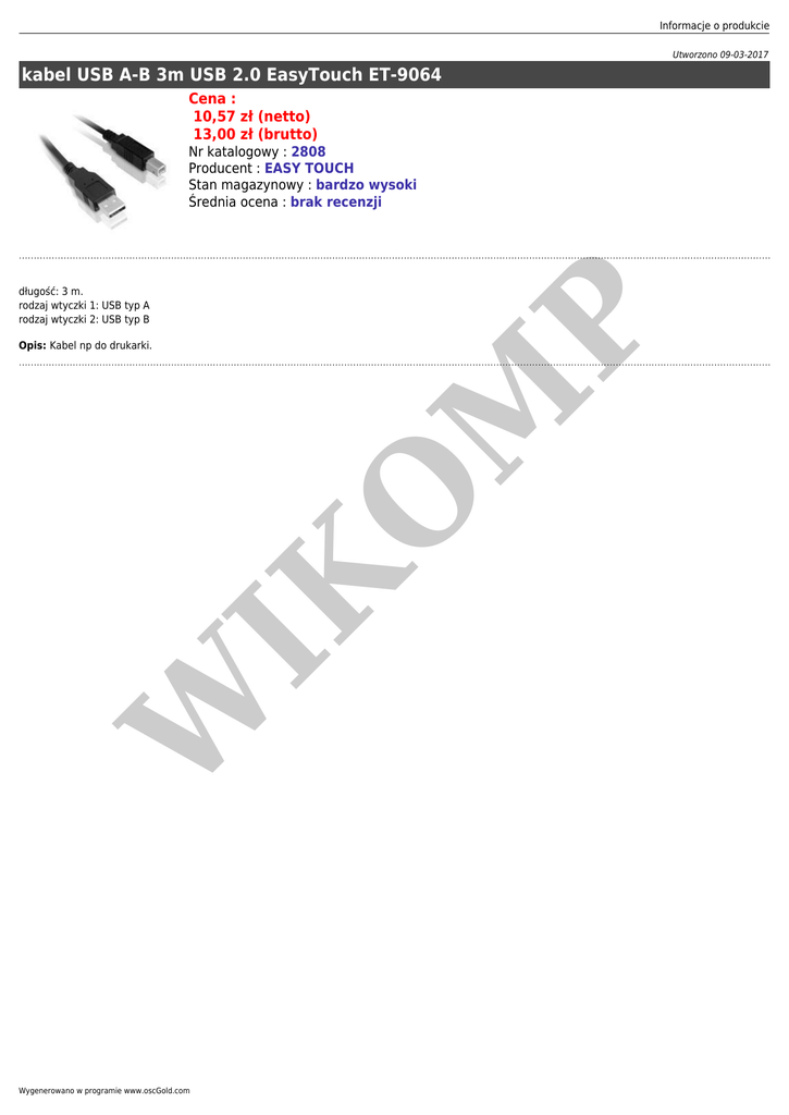 Informacje o produkcie Utworzono 09-03-2017 kabel USB A-B 3m USB 2.0 EasyTouch ET-9064 Cena : 10,57 zł (netto) 13,00 zł (brutto) Nr katalogowy : 2808 Producent : EASY TOUCH Stan magazynowy : bardzo wysoki Średnia ocena : brak recenzji P długość: 3 m. rodzaj wtyczki 1: USB typ A rodzaj wtyczki 2: USB typ B W IK O M Opis: Kabel np do drukarki. Wygenerowano w programie www.oscGold.com