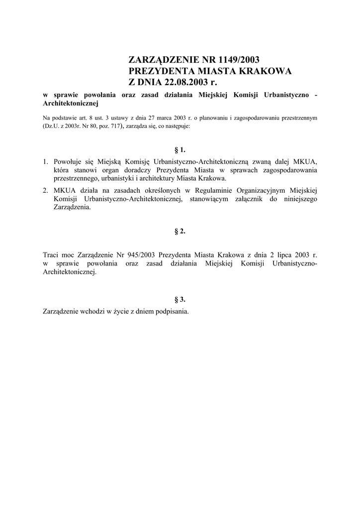ZARZĄDZENIE NR 1149/2003 PREZYDENTA MIASTA KRAKOWA Z DNIA 22.08.2003 r. w sprawie powołania oraz zasad działania Miejskiej Komisji Urbanistyczno Architektonicznej Na podstawie art. 8 ust. 3 ustawy z dnia 27 marca 2003 r. o planowaniu i zagospodarowaniu przestrzennym (Dz.U. z 2003r. Nr 80, poz. 717), zarządza się, co następuje: § 1. 1. Powołuje się Miejską Komisję Urbanistyczno-Architektoniczną zwaną dalej MKUA, która stanowi organ doradczy Prezydenta Miasta w sprawach zagospodarowania przestrzennego, urbanistyki i architektury Miasta Krakowa. 2. MKUA działa na zasadach określonych w Regulaminie Organizacyjnym Miejskiej Komisji Urbanistyczno-Architektonicznej, stanowiącym załącznik do niniejszego Zarządzenia. § 2. Traci moc Zarządzenie Nr 945/2003 Prezydenta Miasta Krakowa z dnia 2 lipca 2003 r. w sprawie powołania oraz zasad działania Miejskiej Komisji UrbanistycznoArchitektonicznej. § 3. Zarządzenie wchodzi w życie z dniem podpisania. Załącznik do Zarządzenia Nr 1149/2003 Prezydenta Miasta Krakowa z dnia 22.08.2003 r. REGULAMIN ORGANIZACYJNY MIEJSKIEJ KOMISJI URBANISTYCZNO-ARCHITEKTONICZNEJ Rozdział I POSTANOWIENIA OGÓLNE § 1. Regulamin Organizacyjny Miejskiej Komisji Urbanistyczno-Architektonicznej zwany dalej "Regulaminem" określa wewnętrzną strukturę, zasady organizacji pracy oraz tryb działania Miejskiej Komisji Urbanistyczno-Architektonicznej § 2. Ilekroć w regulaminie jest mowa o: 1) Prezydencie- należy przez to rozumieć Prezydenta Miasta Krakowa, 2) MKUA - należy przez to rozumieć Miejską Komisję Urbanistyczno-Architektoniczną, 3) Przewodniczącym - należy przez to rozumieć Przewodniczącego MKUA, 4) Zastępcy - należy przez to rozumieć Zastępcę Przewodniczącego MKUA, 5) Regulaminie - należy przez to rozumieć regulamin organizacyjny MKUA. § 3. 1. MKUA stanowi organ doradczy Prezydenta w sprawach zagospodarowania przestrzennego, urbanistyki i architektury Miasta Krakowa. 2. MKUA działa na zasadach i w trybie określonym w niniejszym Regulaminie. 3. Nadzór nad pracami MKUA sprawuje Prezydent lub upoważniony przez Niego Zastępca. 4. Do zadań MKUA należy w szczególności: 1) wyrażanie opinii w sprawach z zakresu planowania i zagospodarowania przestrzennego, urbanistyki i architektury o istotnym znaczeniu dla Miasta, będących przedmiotem zainteresowania Prezydenta, 2) opiniowanie koncepcji i opracowań urbanistycznych i architektonicznych przedkładanych Prezydentowi, dotyczących zamierzeń inwestycyjnych o istotnym znaczeniu dla Krakowa, 3) opiniowanie projektów miejscowych planów zagospodarowania przestrzennego, 4) opiniowanie projektu studium uwarunkowań i kierunków zagospodarowania przestrzennego Miasta, 5) opiniowanie sporządzonych przez Prezydenta : analizy zmian w zagospodarowaniu przestrzennym Miasta, oceny postępu w opracowywaniu planów miejscowych oraz wieloletniego programu sporządzania miejscowych planów zagospodarowania przestrzennego, 6) opiniowanie wniosków w sprawach warunków zabudowy w sytuacjach braku miejscowego planu zagospodarowania przestrzennego, 7) inicjowanie prac koncepcyjnych i opracowań w zakresie rozwoju przestrzennego Miasta, 8) współpraca z Radą Miasta Krakowa. Rozdział II ORGANIZACJA I ZASADY POWOŁYWANIA CZŁONKÓW § 4. 1. W skład MKUA wchodzą: 1) Przewodniczący i Zastępca wyznaczeni przez Prezydenta spośród członków MKUA. 2) członkowie rekomendowani przez Prezydenta, Komisję Planowania Przestrzennego i Ochrony Środowiska oraz branżowe stowarzyszenia i samorządy zawodowe. 2. W pracach MKUA mogą brać udział, jako rzeczoznawcy, osoby nie będące jej członkami. Rzeczoznawcy będący przedstawicielami stowarzyszeń twórczych, naukowych technicznych oraz samorządów zawodowych sporządzają koreferaty i ekspertyzy. 3. W skład MKUA powoływanych zostaje 24 członków. 4. Członków MKUA rekomendują w sposób przez siebie ustalony: 1) Prezydent Miasta - 7 członków 2) Komisja Planowania Przestrzennego i Ochrony Środowiska Rady Miasta Krakowa - 5 członków 3) Branżowe stowarzyszenia i samorządy zawodowe: Małopolska Okręgowa Izba Architektów, Południowa Izba Urbanistów, Stowarzyszenie Architektów Polskich SARP, Towarzystwo Urbanistów Polskich TUP - 12 członków 5. W oparciu o zasady określone w ust. 4 pkt. 2 i 3 Główny Architekt Miasta w terminie 14 dni od daty wejścia w życie zarządzenia wystąpi do wymienionych podmiotów o wskazanie kandydatów na członków MKUA. 6. W przypadkach określonych w ust.7 zasady określone powyżej stosuje się odpowiednio. 7. Prezydent odwołuje członka MKUA: 1) w przypadku jego rezygnacji albo, 2) w uzgodnieniu z podmiotem rekomendującym albo, 3) na wniosek podmiotu rekomendującego. Rozdział III ZASADY PRACY MKUA § 5. 1. Pracami MKUA kieruje Przewodniczący. 2. Przewodniczący: 1) reprezentuje MKUA na zewnątrz, 2) organizuje i koordynuje prace MKUA, oraz czuwa nad ich tokiem i terminowością, 3) zwołuje posiedzenia MKUA i przewodniczy obradom, 4) wyznacza rzeczoznawców, 5) proponuje program działania i plan pracy MKUA , 6) przedstawia Prezydentowi kwartalne sprawozdania z prac MKUA. 3. W razie nieobecności Przewodniczącego jego obowiązki wykonuje Zastępca. § 6. 1. Posiedzenia MKUA zwołuje Przewodniczący. Zawiadomienie członków o posiedzeniu następuje co najmniej na 7 dni przed jego datą. 2. Przewodniczący, prowadząc posiedzenie proponuje porządek posiedzenia przyjmowany przez MKUA w głosowaniu. 3. W sprawach określonych w § 3 ust. 4 pkt. 4, w posiedzeniu uczestniczą, poza Przewodniczącym, co najmniej 3 członków MKUA, wyznaczonych przez Przewodniczącego, z uwagi na posiadane przez nich wiadomości specjalne z zakresu będącego przedmiotem opiniowania. Przewodniczący zawiadamia o posiedzeniu oraz o wyznaczonych osobach pozostałych członków MKUA. 4. Na posiedzenia mogą zostać zaproszone, bez prawa głosu, osoby nie będące członkami MKUA. 5. Posiedzenia mogą mieć 