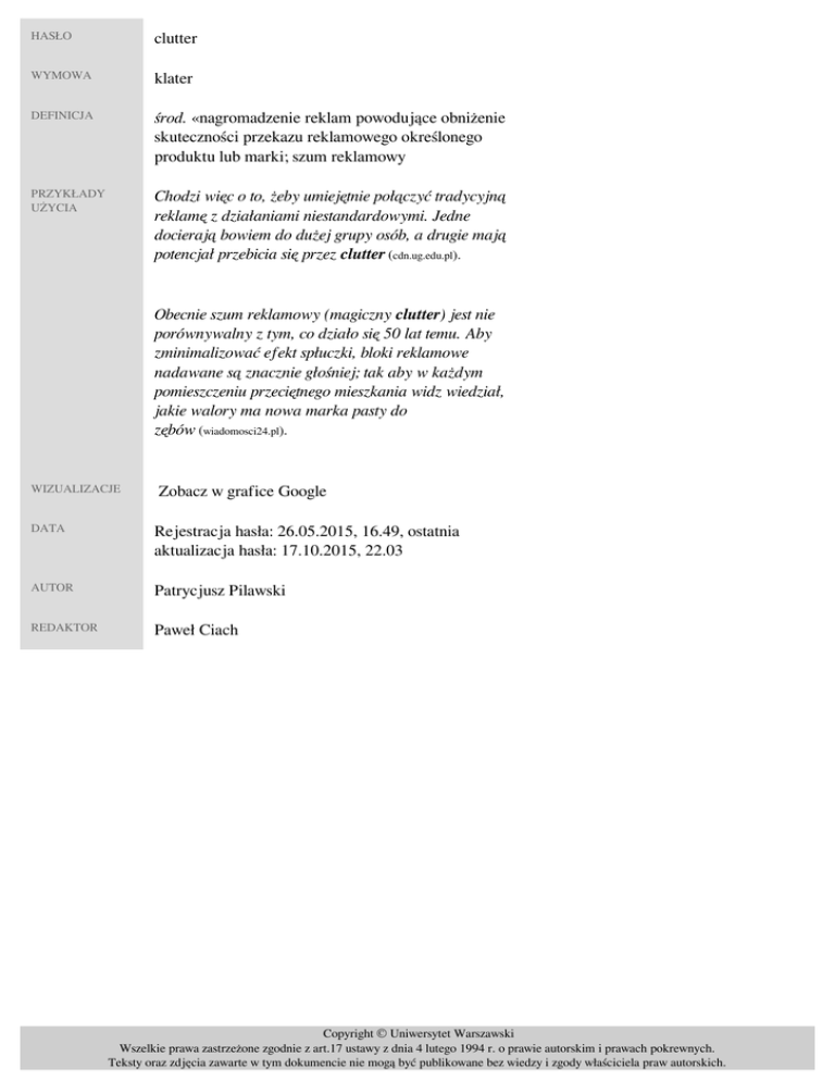 HASŁO clutter WYMOWA klater DEFINICJA środ. «nagromadzenie reklam powodujące obniżenie skuteczności przekazu reklamowego określonego produktu lub marki; szum reklamowy» PRZYKŁADY UŻYCIA Chodzi więc o to, żeby umiejętnie połączyć tradycyjną reklamę z działaniami niestandardowymi. Jedne docierają bowiem do dużej grupy osób, a drugie mają potencjał przebicia się przez clutter (cdn.ug.edu.pl). Obecnie szum reklamowy (magiczny clutter) jest nie porównywalny z tym, co działo się 50 lat temu. Aby zminimalizować efekt spłuczki, bloki reklamowe nadawane są znacznie głośniej; tak aby w każdym pomieszczeniu przeciętnego mieszkania widz wiedział, jakie walory ma nowa marka pasty do zębów (wiadomosci24.pl). WIZUALIZACJE Zobacz w grafice Google DATA Rejestracja hasła: 26.05.2015, 16.49, ostatnia aktualizacja hasła: 17.10.2015, 22.03 AUTOR Patrycjusz Pilawski REDAKTOR Paweł Ciach Copyright © Uniwersytet Warszawski Wszelkie prawa zastrzeżone zgodnie z art.17 ustawy z dnia 4 lutego 1994 r. o prawie autorskim i prawach pokrewnych. Teksty oraz zdjęcia zawarte w tym dokumencie nie mogą być publikowane bez wiedzy i zgody właściciela praw autorskich. Powered by TCPDF (www.tcpdf.org)