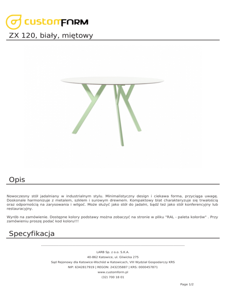 ZX 120, biały, miętowy Opis Nowoczesny stół jadalniany w industrialnym stylu. Minimalistyczny design i ciekawa forma, przyciąga uwagę. Doskonale harmonizuje z metalem, szkłem i surowym drewnem. Kompaktowy blat charakteryzuje się trwałością oraz odpornością na zarysowania i wilgoć. Może służyć jako stół do jadalni, bądź też jako stół konferencyjny lub restauracyjny. Wyrób na zamówienie. Dostępne kolory podstawy można zobaczyć na stronie w pliku "RAL - paleta kolorów" . Przy zamówieniu proszę podać kod koloru!!! Specyfikacja ----------------------------------------------------------------------------------------------------------------------------------LARB Sp. z o.o. S.K.A. 40-862 Katowice, ul. Gliwicka 275 Sąd Rejonowy dla Katowice-Wschód w Katowicach, VIII Wydział Gospodarczy KRS NIP: 6342817919 | REGON: 243235887 | KRS: 0000457871 www.customform.pl (32) 700 18 01 Page 1/2 Wysokość 73 cm Średnica 120 cm Podstawa metal malowany proszkowo Blat laminat kompaktowy Dodatkowe zdjęcia ----------------------------------------------------------------------------------------------------------------------------------LARB Sp. z o.o. S.K.A. 40-862 Katowice, ul. Gliwicka 275 Sąd Rejonowy dla Katowice-Wschód w Katowicach, VIII Wydział Gospodarczy KRS NIP: 6342817919 | REGON: 243235887 | KRS: 0000457871 www.customform.pl (32) 700 18 01 Page 2/2 Powered by TCPDF (www.tcpdf.org)