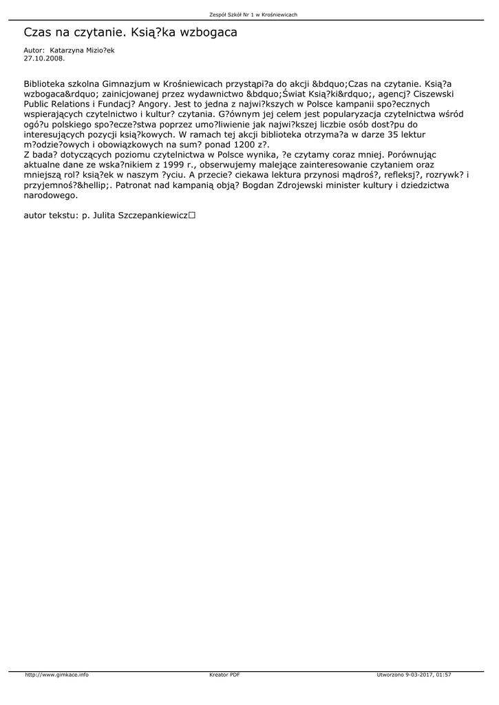 Zespół Szkół Nr 1 w Krośniewicach Czas na czytanie. Ksią?ka wzbogaca Autor: Katarzyna Mizio?ek 27.10.2008. Biblioteka szkolna Gimnazjum w Krośniewicach przystąpi?a do akcji „Czas na czytanie. Ksią?a wzbogaca” zainicjowanej przez wydawnictwo „Świat Ksią?ki”, agencj? Ciszewski Public Relations i Fundacj? Angory. Jest to jedna z najwi?kszych w Polsce kampanii spo?ecznych wspierających czytelnictwo i kultur? czytania. G?ównym jej celem jest popularyzacja czytelnictwa wśród ogó?u polskiego spo?ecze?stwa poprzez umo?liwienie jak najwi?kszej liczbie osób dost?pu do interesujących pozycji ksią?kowych. W ramach tej akcji biblioteka otrzyma?a w darze 35 lektur m?odzie?owych i obowiązkowych na sum? ponad 1200 z?. Z bada? dotyczących poziomu czytelnictwa w Polsce wynika, ?e czytamy coraz mniej. Porównując aktualne dane ze wska?nikiem z 1999 r., obserwujemy malejące zainteresowanie czytaniem oraz mniejszą rol? ksią?ek w naszym ?yciu. A przecie? ciekawa lektura przynosi mądroś?, refleksj?, rozrywk? i przyjemnoś?…. Patronat nad kampanią obją? Bogdan Zdrojewski minister kultury i dziedzictwa narodowego. autor tekstu: p. Julita Szczepankiewicz http://www.gimkace.info Kreator PDF Utworzono 9-03-2017, 01:57