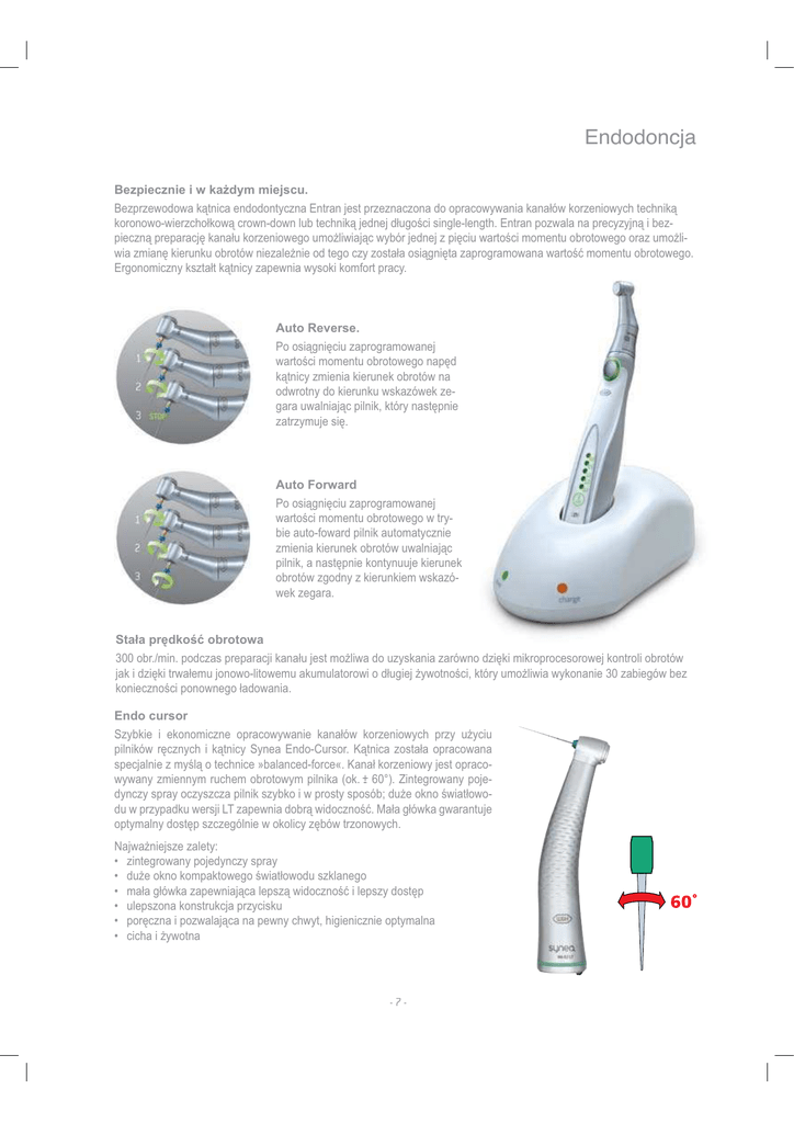 Endodoncja %H]SLHF]QLHLZNDĪG\PPLHMVFX %H]SU]HZRGRZDNąWQLFDHQGRGRQW\F]QD(QWUDQMHVWSU]H]QDF]RQDGRRSUDFRZ\ZDQLDNDQDáyZNRU]HQLRZ\FKWHFKQLNą NRURQRZRZLHU]FKRáNRZąFURZQGRZQOXEWHFKQLNąMHGQHMGáXJRĞFLVLQJOHOHQJWK(QWUDQSR]ZDODQDSUHF\]\MQąLEH]SLHF]QąSUHSDUDFMĊNDQDáXNRU]HQLRZHJRXPRĪOLZLDMąFZ\EyUMHGQHM]SLĊFLXZDUWRĞFLPRPHQWXREURWRZHJRRUD]XPRĪOLZLD]PLDQĊNLHUXQNXREURWyZQLH]DOHĪQLHRGWHJRF]\]RVWDáDRVLąJQLĊWD]DSURJUDPRZDQDZDUWRĞüPRPHQWXREURWRZHJR (UJRQRPLF]Q\NV]WDáWNąWQLF\]DSHZQLDZ\VRNLNRPIRUWSUDF\ $XWR5HYHUVH 3RRVLąJQLĊFLX]DSURJUDPRZDQHM ZDUWRĞFLPRPHQWXREURWRZHJRQDSĊG NąWQLF\]PLHQLDNLHUXQHNREURWyZQD RGZURWQ\GRNLHUXQNXZVND]yZHN]HJDUDXZDOQLDMąFSLOQLNNWyU\QDVWĊSQLH ]DWU]\PXMHVLĊ $XWR)RUZDUG 3RRVLąJQLĊFLX]DSURJUDPRZDQHM ZDUWRĞFLPRPHQWXREURWRZHJRZWU\ELHDXWRIRZDUGSLOQLNDXWRPDW\F]QLH ]PLHQLDNLHUXQHNREURWyZXZDOQLDMąF SLOQLNDQDVWĊSQLHNRQW\QXXMHNLHUXQHN REURWyZ]JRGQ\]NLHUXQNLHPZVND]yZHN]HJDUD 6WDáDSUĊGNRĞüREURWRZD REUPLQSRGF]DVSUHSDUDFMLNDQDáXMHVWPRĪOLZDGRX]\VNDQLD]DUyZQRG]LĊNLPLNURSURFHVRURZHMNRQWUROLREURWyZ MDNLG]LĊNLWUZDáHPXMRQRZROLWRZHPXDNXPXODWRURZLRGáXJLHMĪ\ZRWQRĞFLNWyU\XPRĪOLZLDZ\NRQDQLH]DELHJyZEH] NRQLHF]QRĞFLSRQRZQHJRáDGRZDQLD (QGRFXUVRU 6]\ENLH L HNRQRPLF]QH RSUDFRZ\ZDQLH NDQDáyZ NRU]HQLRZ\FK SU]\ XĪ\FLX SLOQLNyZ UĊF]Q\FK L NąWQLF\ 6\QHD (QGR&XUVRU .ąWQLFD ]RVWDáD RSUDFRZDQD VSHFMDOQLH]P\ĞOąRWHFKQLFHªEDODQFHGIRUFH©.DQDáNRU]HQLRZ\MHVWRSUDFRZ\ZDQ\]PLHQQ\PUXFKHPREURWRZ\PSLOQLNDRN=LQWHJURZDQ\SRMHG\QF]\VSUD\RF]\V]F]DSLOQLNV]\ENRLZSURVW\VSRVyEGXĪHRNQRĞZLDWáRZRGXZSU]\SDGNXZHUVML/7]DSHZQLDGREUąZLGRF]QRĞü0DáDJáyZNDJZDUDQWXMH RSW\PDOQ\GRVWĊSV]F]HJyOQLHZRNROLF\]ĊEyZWU]RQRZ\FK 1DMZDĪQLHMV]H]DOHW\ ]LQWHJURZDQ\SRMHG\QF]\VSUD\ GXĪHRNQRNRPSDNWRZHJRĞZLDWáRZRGXV]NODQHJR PDáDJáyZND]DSHZQLDMąFDOHSV]ąZLGRF]QRĞüLOHSV]\GRVWĊS XOHSV]RQDNRQVWUXNFMDSU]\FLVNX SRUĊF]QDLSR]ZDODMąFDQDSHZQ\FKZ\WKLJLHQLF]QLHRSW\PDOQD FLFKDLĪ\ZRWQD -7-