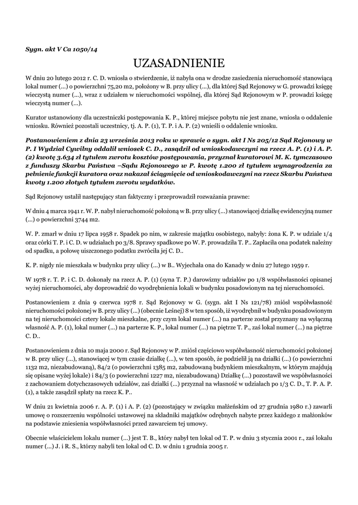 Sygn. akt V Ca 1050/14 UZASADNIENIE W dniu 20 lutego 2012 r. C. D. wniosła o stwierdzenie, iż nabyła ona w drodze zasiedzenia nieruchomość stanowiącą lokal numer (...) o powierzchni 75,20 m2, położony w B. przy ulicy (...), dla której Sąd Rejonowy w G. prowadzi księgę wieczystą numer (...), wraz z udziałem w nieruchomości wspólnej, dla której Sąd Rejonowym w P. prowadzi księgę wieczystą numer (...). Kurator ustanowiony dla uczestniczki postępowania K. P., której miejsce pobytu nie jest znane, wniosła o oddalenie wniosku. Również pozostali uczestnicy, tj. A. P. (1), T. P. i A. P. (2) wnieśli o oddalenie wniosku. Postanowieniem z dnia 23 września 2013 roku w sprawie o sygn. akt I Ns 205/12 Sąd Rejonowy w P. I Wydział Cywilny oddalił wniosek C. D., zasądził od wnioskodawczyni na rzecz A. P. (1) i A. P. (2) kwotę 3.634 zł tytułem zwrotu kosztów postępowania, przyznał kuratorowi M. K. tymczasowo z funduszy Skarbu Państwa –Sądu Rejonowego w P. kwotę 1.200 zł tytułem wynagrodzenia za pełnienie funkcji kuratora oraz nakazał ściągnięcie od wnioskodawczyni na rzecz Skarbu Państwa kwoty 1.200 złotych tytułem zwrotu wydatków. Sąd Rejonowy ustalił następujący stan faktyczny i przeprowadził rozważania prawne: W dniu 4 marca 1941 r. W. P. nabył nieruchomość położoną w B. przy ulicy (...) stanowiącej działkę ewidencyjną numer (...) o powierzchni 3744 m2. W. P. zmarł w dniu 17 lipca 1958 r. Spadek po nim, w zakresie majątku osobistego, nabyły: żona K. P. w udziale 1/4 oraz córki T. P. i C. D. w udziałach po 3/8. Sprawy spadkowe po W. P. prowadziła T. P.. Zapłaciła ona podatek należny od spadku, a połowę uiszczonego podatku zwróciła jej C. D.. K. P. nigdy nie mieszkała w budynku przy ulicy (...) w B.. Wyjechała ona do Kanady w dniu 27 lutego 1959 r. W 1978 r. T. P. i C. D. dokonały na rzecz A. P. (1) (syna T. P.) darowizny udziałów po 1/8 współwłasności opisanej wyżej nieruchomości, aby doprowadzić do wyodrębnienia lokali w budynku posadowionym na tej nieruchomości. Postanowieniem z dnia 9 czerwca 1978 r. Sąd Rejonowy w G. (sygn. akt I Ns 121/78) zniósł współwłasność nieruchomości położonej w B. przy ulicy (...) (obecnie Leśnej) 8 w ten sposób, iż wyodrębnił w budynku posadowionym na tej nieruchomości cztery lokale mieszkalne, przy czym lokal numer (...) na parterze został przyznany na wyłączną własność A. P. (1), lokal numer (...) na parterze K. P., lokal numer (...) na piętrze T. P., zaś lokal numer (...) na piętrze C. D.. Postanowieniem z dnia 10 maja 2000 r. Sąd Rejonowy w P. zniósł częściowo współwłasność nieruchomości położonej w B. przy ulicy (...), stanowiącej w tym czasie działkę (...), w ten sposób, że podzielił ją na działki (...) (o powierzchni 1132 m2, niezabudowaną), 84/2 (o powierzchni 1385 m2, zabudowaną budynkiem mieszkalnym, w którym znajdują się opisane wyżej lokale) i 84/3 (o powierzchni 1227 m2, niezabudowaną) Działkę (...) pozostawił we współwłasności z zachowaniem dotychczasowych udziałów, zaś działki (...) przyznał na własność w udziałach po 1/3 C. D., T. P. A. P. (1), a także zasądził spłaty na rzecz K. P.. W dniu 21 kwietnia 2006 r. A. P. (1) i A. P. (2) (pozostający w związku małżeńskim od 27 grudnia 1980 r.) zawarli umowę o rozszerzeniu wspólności ustawowej na składniki majątków odrębnych nabyte przez każdego z małżonków na podstawie zniesienia współwłasności przed zawarciem tej umowy. Obecnie właścicielem lokalu numer (...) jest T. B., który nabył ten lokal od T. P. w dniu 3 stycznia 2001 r., zaś lokalu numer (...) J. i R. S., którzy nabyli ten lokal od C. D. w dniu 1 grudnia 2005 r. Sąd Rejonowy ustalił ponadto, że budynek posadowiony przy ulicy (...) w B. był objęty kwaterunkiem od roku 1968 r. Poza lokatorami kwaterunkowymi w budynku tym mieszkali: S. P. oraz jej córki C. D. i T. P., a także wnuk A. P. (1). Około połowy lat 70-tych z budynku tego wyprowadzili się T. P. i A. P. (1). Sprawami związanymi z utrzymaniem tego budynku zajmowała się do roku 1968 S. P.. Po niej zarządzanie nieruchomością, za zgodą T. P., przejęła C. D., czego motywem był fakt, iż była ona starszą z córek S. P. i T. P. pracowała poza miejscem zamieszkania. Od początku 1993 r. administrację nieruchomości przy ulicy (...) w B. przejęła T. P., przy czym rachunki za wspólne wydatki współwłaściciela nadal były wystawiane na C. D.. Od czerwca 1997 r. T. P. zaprzestała administrowania wspólną nieruchomością w związku z wyprowadzeniem się do B.. W okresie od 1968 r. do 1991 r. w pomieszczeniach wchodzących od 1978 r. w skład lokali numer (...) (z wyjątkiem pomieszczenia na parterze zajmowanego przez S. P., które to pomieszczenie stanowiło część lokalu numer (...)) funkcjonowała Gminna Biblioteka Publiczna w B.. Z inicjatywą ulokowania biblioteki w budynku przy ulicy (...) kierowniczka biblioteki zwróciła się do C. D., proponując pomoc w opróżnieniu tego budynku z lokatorów kwaterunkowych. Sprawę ulokowania biblioteki w budynku przy ulicy (...) omówiły wspólnie S. P., C. D. i T. P.. Biblioteka zajęła pomieszczenia na parterze budynku na podstawie umowy najmu zawartej na skutek wydania nakazu kwaterunkowego. W czasie funkcjonowania biblioteki C. D. mieszkała na piętrze budynku w pomieszczeniach wchodzących w skład lokalu numer (...). T. P. zajęła lokal numer (...) po wyprowadzeniu się z niego lokatorki kwaterunkowej Z. S. do lokalu znajdującego się w zasobach Spółdzielni Mieszkaniowej (...) w B., przy czym T. P., aby doprowadzić do uzyskania przez Z. S. prawa do tego lokalu i wyprowadzenia się z budynku przy ulicy (...) w B. pokryła wkład budowlany kwotą 43.800 złotych, a także uiściła na rzecz Z. P. dodatkową kwotę 2.500 złotych, w tym 1.500 złotych tytułem zwrotu kosztów remontu. W dniu 27 lipca 1978 r. lokal numer (...)