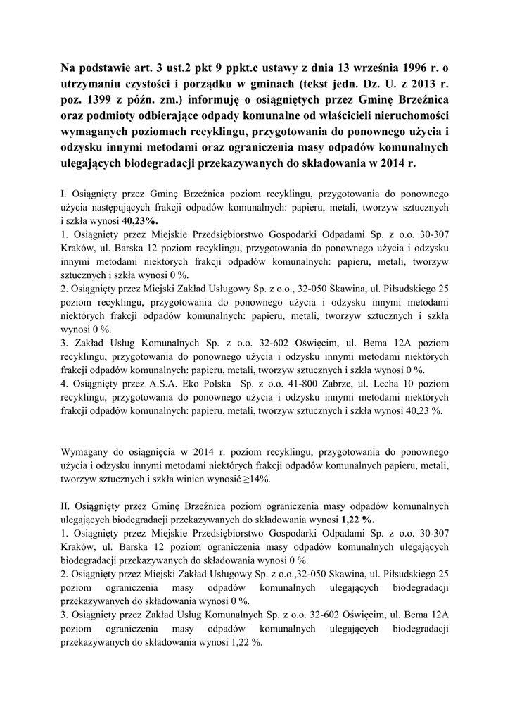 Na podstawie art. 3 ust.2 pkt 9 ppkt.c ustawy z dnia 13 września 1996 r. o utrzymaniu czystości i porządku w gminach (tekst jedn. Dz. U. z 2013 r. poz. 1399 z późn. zm.) informuję o osiągniętych przez Gminę Brzeźnica oraz podmioty odbierające odpady komunalne od właścicieli nieruchomości wymaganych poziomach recyklingu, przygotowania do ponownego użycia i odzysku innymi metodami oraz ograniczenia masy odpadów komunalnych ulegających biodegradacji przekazywanych do składowania w 2014 r. I. Osiągnięty przez Gminę Brzeźnica poziom recyklingu, przygotowania do ponownego użycia następujących frakcji odpadów komunalnych: papieru, metali, tworzyw sztucznych i szkła wynosi 40,23%. 1. Osiągnięty przez Miejskie Przedsiębiorstwo Gospodarki Odpadami Sp. z o.o. 30-307 Kraków, ul. Barska 12 poziom recyklingu, przygotowania do ponownego użycia i odzysku innymi metodami niektórych frakcji odpadów komunalnych: papieru, metali, tworzyw sztucznych i szkła wynosi 0 %. 2. Osiągnięty przez Miejski Zakład Usługowy Sp. z o.o., 32-050 Skawina, ul. Piłsudskiego 25 poziom recyklingu, przygotowania do ponownego użycia i odzysku innymi metodami niektórych frakcji odpadów komunalnych: papieru, metali, tworzyw sztucznych i szkła wynosi 0 %. 3. Zakład Usług Komunalnych Sp. z o.o. 32-602 Oświęcim, ul. Bema 12A poziom recyklingu, przygotowania do ponownego użycia i odzysku innymi metodami niektórych frakcji odpadów komunalnych: papieru, metali, tworzyw sztucznych i szkła wynosi 0 %. 4. Osiągnięty przez A.S.A. Eko Polska Sp. z o.o. 41-800 Zabrze, ul. Lecha 10 poziom recyklingu, przygotowania do ponownego użycia i odzysku innymi metodami niektórych frakcji odpadów komunalnych: papieru, metali, tworzyw sztucznych i szkła wynosi 40,23 %. Wymagany do osiągnięcia w 2014 r. poziom recyklingu, przygotowania do ponownego użycia i odzysku innymi metodami niektórych frakcji odpadów komunalnych papieru, metali, tworzyw sztucznych i szkła winien wynosić ≥14%. II. Osiągnięty przez Gminę Brzeźnica poziom ograniczenia masy odpadów komunalnych ulegających biodegradacji przekazywanych do składowania wynosi 1,22 %. 1. Osiągnięty przez Miejskie Przedsiębiorstwo Gospodarki Odpadami Sp. z o.o. 30-307 Kraków, ul. Barska 12 poziom ograniczenia masy odpadów komunalnych ulegających biodegradacji przekazywanych do składowania wynosi 0 %. 2. Osiągnięty przez Miejski Zakład Usługowy Sp. z o.o.,32-050 Skawina, ul. Piłsudskiego 25 poziom ograniczenia masy odpadów komunalnych ulegających biodegradacji przekazywanych do składowania wynosi 0 %. 3. Osiągnięty przez Zakład Usług Komunalnych Sp. z o.o. 32-602 Oświęcim, ul. Bema 12A poziom ograniczenia masy odpadów komunalnych ulegających biodegradacji przekazywanych do składowania wynosi 1,22 %. 4. Osiągnięty przez A.S.A. Eko Polska Sp. z o.o. 41-800 Zabrze, ul. Lecha 10 poziom ograniczenia masy odpadów komunalnych ulegających biodegradacji przekazywanych do składowania wynosi 0 %. Wymagany do osiągnięcia w 2014 r. poziom ograniczenia masy odpadów komunalnych ulegających biodegradacji przekazywanych do składowania powinien wynosić 50%.