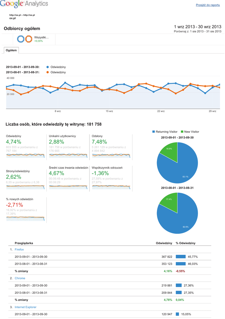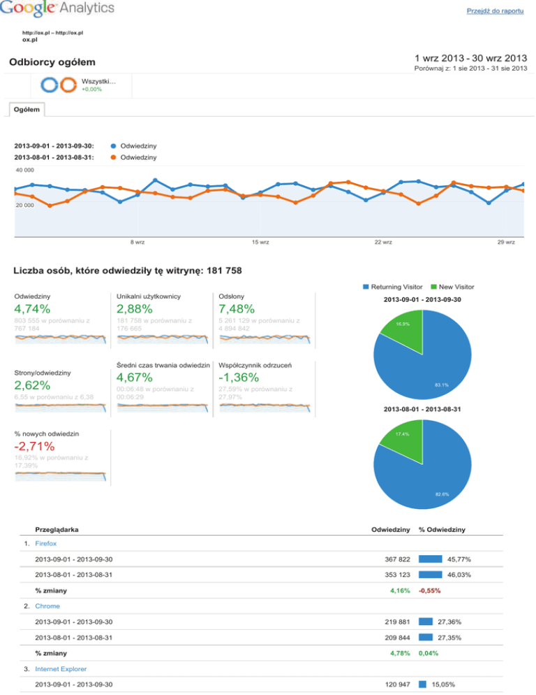 Przejdź do raportu http://ox.pl – http://ox.pl ox.pl 1 wrz 2013 - 30 wrz 2013 Odbiorcy ogółem Porównaj z: 1 sie 2013 - 31 sie 2013 Wszystki… +0,00% Ogółem 2013-09-01 - 2013-09-30: Odwiedziny 2013-08-01 - 2013-08-31: Odwiedziny 40 000 20 000 8 wrz 15 wrz 22 wrz 29 wrz Liczba osób, które odwiedziły tę witrynę: 181 758 Returning Visitor Odwiedziny Unikalni użytkownicy Odsłony 4,74% 2,88% 7,48% 803 555 w porównaniu z 767 184 181 758 w porównaniu z 176 665 5 261 129 w porównaniu z 4 894 842 Średni czas trwania odwiedzin Współczynnik odrzuceń 4,67% -1,36% 00:06:48 w porównaniu z 00:06:29 27,59% w porównaniu z 27,97% Strony/odwiedziny 2,62% 6,55 w porównaniu z 6,38 New Visitor 2013-09-01 - 2013-09-30 16.9% 83.1% 2013-08-01 - 2013-08-31 % nowych odwiedzin 17.4% -2,71% 16,92% w porównaniu z 17,39% 82.6% Przeglądarka Odwiedziny % Odwiedziny 1. Firefox 2013-09-01 - 2013-09-30 367 822 45,77% 2013-08-01 - 2013-08-31 353 123 46,03% % zmiany 4,16% -0,55% 2. Chrome 2013-09-01 - 2013-09-30 219 881 27,36% 2013-08-01 - 2013-08-31 209 844 27,35% % zmiany 4,78% 0,04% 3. Internet Explorer 2013-09-01 - 2013-09-30 120 947 15,05% 113 458 2013-08-01 - 2013-08-31 % zmiany 6,60% 14,79% 1,78% 4. Opera 2013-09-01 - 2013-09-30 58 955 7,34% 2013-08-01 - 2013-08-31 56 014 7,30% % zmiany 5,25% 0,49% 5. Android Browser 2013-09-01 - 2013-09-30 17 767 2,21% 2013-08-01 - 2013-08-31 16 362 2,13% % zmiany 8,59% 3,67% 6. Safari 2013-09-01 - 2013-09-30 10 460 1,30% 2013-08-01 - 2013-08-31 10 095 1,32% % zmiany 3,62% -1,07% 7. Opera Mini 2013-09-01 - 2013-09-30 3 289 0,41% 2013-08-01 - 2013-08-31 3 475 0,45% % zmiany -5,35% -9,64% 8. Maxthon 2013-09-01 - 2013-09-30 1 394 0,17% 2013-08-01 - 2013-08-31 1 503 0,20% -7,25% -11,45% 2013-09-01 - 2013-09-30 769 0,10% 2013-08-01 - 2013-08-31 830 0,11% -7,35% -11,54% 2013-09-01 - 2013-09-30 638 0,08% 2013-08-01 - 2013-08-31 733 0,10% -12,96% -16,90% % zmiany 9. IE with Chrome Frame % zmiany 10. S40 Ovi Browser % zmiany wyświetl pełny raport © 2013 Google Przejdź do raportu http://ox.pl – http://ox.pl ox.pl 1 wrz 2013 - 30 wrz 2013 Źródła odwiedzin ogółem Porównaj z: 1 sie 2013 - 31 sie 2013 Wszystki… +0,00% Ogółem 2013-09-01 - 2013-09-30: Odwiedziny 2013-08-01 - 2013-08-31: Odwiedziny 40 000 20 000 8 wrz 15 wrz 22 wrz 29 wrz Osoby, które odwiedziły tę witrynę: 803 555 Odwiedziny w sieci wyszukiwania Ruch z witryn odsyłających Wejścia bezpośrednie Kampanie 2013-09-01 - 2013-09-30 25.8% 39% 35.2% 2013-08-01 - 2013-08-31 27% 39.5% 33.5% Źródło Odwiedziny % Odwiedziny 1. ox.pl 2013-09-01 - 2013-09-30 86 188 30,50% 2013-08-01 - 2013-08-31 80 590 31,33% % zmiany 6,95% -2,64% 2. facebook.com 2013-09-01 - 2013-09-30 79 955 28,29% 2013-08-01 - 2013-08-31 68 275 26,54% % zmiany 17,11% 6,61% 3. ogloszenia.ox.pl 2013-09-01 - 2013-09-30 27 237 9,64% 2013-08-01 - 2013-08-31 24 817 % zmiany 9,75% 9,65% -0,09% 4. pl.indeed.com 2013-09-01 - 2013-09-30 18 783 6,65% 2013-08-01 - 2013-08-31 17 432 6,78% % zmiany 7,75% -1,91% 5. m.ox.pl 2013-09-01 - 2013-09-30 13 954 4,94% 2013-08-01 - 2013-08-31 13 807 5,37% % zmiany 1,06% -8,00% 6. wiadomosci.ox.pl 2013-09-01 - 2013-09-30 13 421 4,75% 2013-08-01 - 2013-08-31 12 769 4,96% % zmiany 5,11% -4,32% 7. praca.trovit.pl 2013-09-01 - 2013-09-30 5 621 1,99% 2013-08-01 - 2013-08-31 5 059 1,97% % zmiany 11,11% 1,15% 8. m.facebook.com 2013-09-01 - 2013-09-30 2 888 1,02% 2013-08-01 - 2013-08-31 2 378 0,92% 21,45% 10,56% 2013-09-01 - 2013-09-30 2 035 0,72% 2013-08-01 - 2013-08-31 1 665 0,65% 22,22% 11,26% 2013-09-01 - 2013-09-30 1 986 0,70% 2013-08-01 - 2013-08-31 2 264 0,88% -12,28% -20,15% % zmiany 9. google.pl % zmiany 10. poczta.wp.pl % zmiany wyświetl pełny raport © 2013 Google