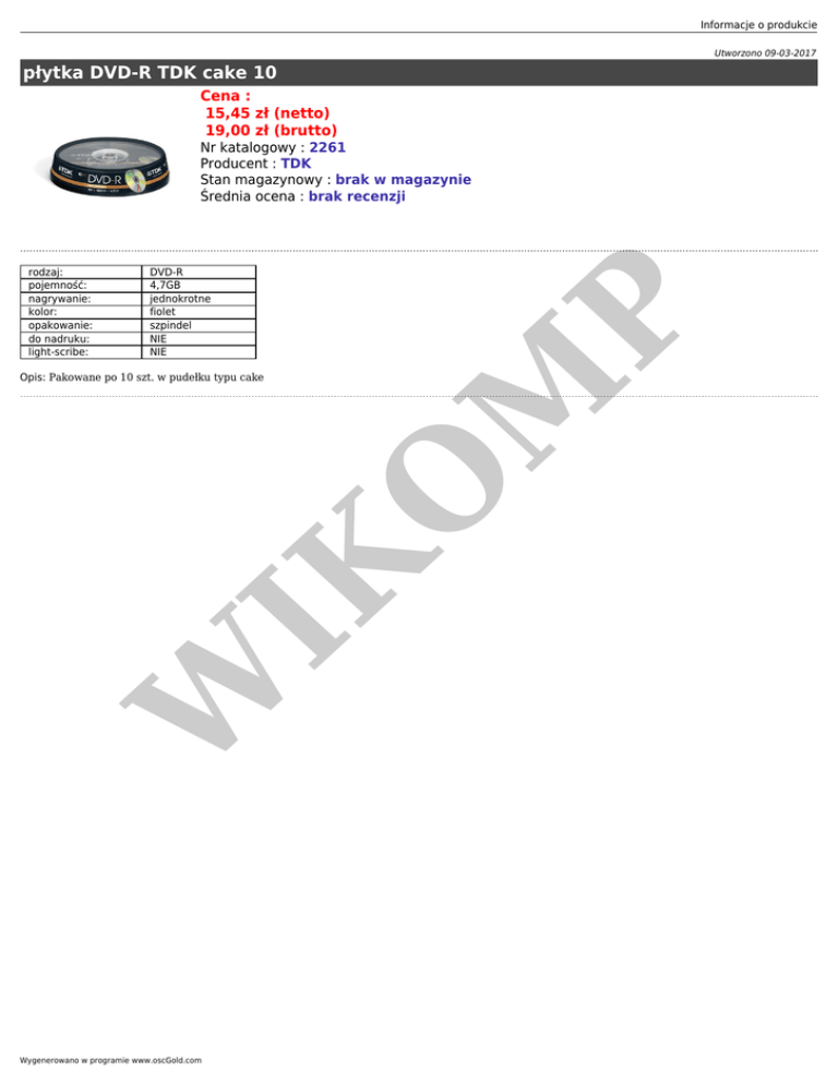 Informacje o produkcie Utworzono 09-03-2017 płytka DVD-R TDK cake 10 Cena : 15,45 zł (netto) 19,00 zł (brutto) Nr katalogowy : 2261 Producent : TDK Stan magazynowy : brak w magazynie Średnia ocena : brak recenzji W IK Opis: Pakowane po 10 szt. w pudełku typu cake P DVD-R 4,7GB jednokrotne fiolet szpindel NIE NIE O M rodzaj: pojemność: nagrywanie: kolor: opakowanie: do nadruku: light-scribe: Wygenerowano w programie www.oscGold.com