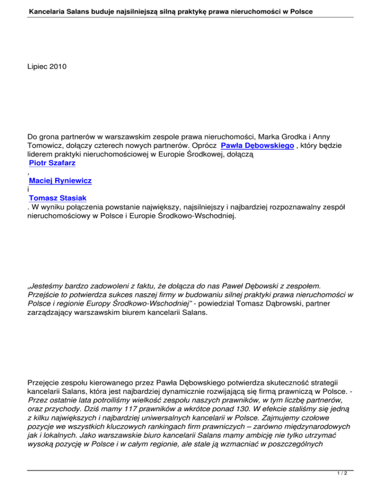 Kancelaria Salans buduje najsilniejszą silną praktykę prawa nieruchomości w Polsce Lipiec 2010 Do grona partnerów w warszawskim zespole prawa nieruchomości, Marka Grodka i Anny Tomowicz, dołączy czterech nowych partnerów. Oprócz Pawła Dębowskiego , który będzie liderem praktyki nieruchomościowej w Europie Środkowej, dołączą Piotr Szafarz , Maciej Ryniewicz i Tomasz Stasiak . W wyniku połączenia powstanie największy, najsilniejszy i najbardziej rozpoznawalny zespół nieruchomościowy w Polsce i Europie Środkowo-Wschodniej. „Jesteśmy bardzo zadowoleni z faktu, że dołącza do nas Paweł Dębowski z zespołem. Przejście to potwierdza sukces naszej firmy w budowaniu silnej praktyki prawa nieruchomości w Polsce i regionie Europy Środkowo-Wschodniej” - powiedział Tomasz Dąbrowski, partner zarządzający warszawskim biurem kancelarii Salans. Przejęcie zespołu kierowanego przez Pawła Dębowskiego potwierdza skuteczność strategii kancelarii Salans, która jest najbardziej dynamicznie rozwijającą się firmą prawniczą w Polsce. Przez ostatnie lata potroiliśmy wielkość zespołu naszych prawników, w tym liczbę partnerów, oraz przychody. Dziś mamy 117 prawników a wkrótce ponad 130. W efekcie staliśmy się jedną z kilku największych i najbardziej uniwersalnych kancelarii w Polsce. Zajmujemy czołowe pozycje we wszystkich kluczowych rankingach firm prawniczych – zarówno międzynarodowych jak i lokalnych. Jako warszawskie biuro kancelarii Salans mamy ambicję nie tylko utrzymać wysoką pozycję w Polsce i w całym regionie, ale stale ją wzmacniać w poszczególnych 1/2 Kancelaria Salans buduje najsilniejszą silną praktykę prawa nieruchomości w Polsce dziedzinach prawa i sektorach rynku. Jestem przekonany, że model i sukcesy naszego biura przyciągną do nas najlepszych specjalistów - powiedział Tomasz Dąbrowski. Przypomnijmy. Paweł Dębowski, wcześniej w Clifford Chance, jeden z najbardziej rozpoznawalnych prawników na rynku nieruchomości w Europie Środkowej i Wschodniej, dołączył do kancelarii Salans. Wydawnictwo prawnicze Chambers Europe uznało Pawła Dębowskiego za „Gwiazdę” (Band Star) twierdząc, że „obserwatorzy są pełni podziwu dla jego wybitnego zespołu”. Wśród prawników, którzy dołączą do kancelarii Salans z Clifford Chance znajdą się także Piotr Szafarz, Maciej Ryniewicz oraz Tomasz Stasiak, kluczowi członkowie zespołu kierowanego przez Pawła Dębowskiego, uznawanego – obok Globalnego Zespołu Nieruchomości kancelarii Salans - za jedną z wiodących praktyk na europejskich rynkach wschodzących. Według współprzewodniczących Globalnego Zespołu Nieruchomości kancelarii Salans, Erica Rosedale’a i Evana Lazara „ten ruch odzwierciedla nasze długotrwałe zaangażowanie w Europie Środkowej i Wschodniej. To kolejny ważny krok w budowie wiodącej, transgranicznej praktyki prawa nieruchomości, w gronie najlepszych międzynarodowych kancelarii, który jednocześnie podkreśla naszą tradycyjną siłę na rynkach wschodzących. ” Wraz z zespołem kancelarii Salans, grupa Pawła Dębowskiego będzie mogła świadczyć usługi doradcze dla większości wiodących funduszy inwestycyjnych, instytucji finansowych oraz deweloperów na rynku nieruchomości. Lazar i Rosedale podkreślają, że “ będzie to niepowtarzalna okazja do połączenia zasobów i kontaktów, która umożliwi kancelarii Salans uzyskanie przodującej pozycji na europejskich rynkach wschodzących. ” 2/2