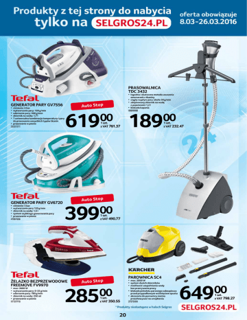 PRASOWALNICA TDC 3432 • łagodna i skuteczna metoda usuwania zmarszczek z tkaniny Auto Stop GENERATOR PARY GV7556 • • • • • ciśnienie: 6 bar wytwarzanie pary: 120 g/min uderzenie pary: 300 g/min zbiornik na wodę: 1,7 l 1 uniwersalna kombinacja temperatury i pary do prasowania wszystkich typów tkanin • prasowanie w pionie 35251511 GENERATOR PARY GV6720 • • • • • ciśnienie: 5 bar wytwarzanie pary 120 g/min zbiornik na wodę: 1,5 l system szybkiego generowania pary prasowanie w pionie 41061656 619 moc: 2600 W wytwarzanie pary: 0-35 g/min uderzenie pary: 180 g/min zbiornik na wodę: 250 ml prasowanie w pionie 41157710 o pojemności 1,2 l • blokada kapania 189 40899908 00 1 szt. z VAT 761.37 00 1 szt. z VAT 232.47 Auto Stop 399 00 ŻELAZKO BEZPRZEWODOWE FREEMOVE FV9970 • • • • • • ciągły wypływ pary: około 30 g/min • zdejmowany zbiornik na wodę 1 szt. z VAT 490.77 PAROWNICA SC4 Auto Stop 285 • moc: 2000 W • system dwóch zbiorników • możliwość uzupełniania wody 00 bez przerywania pracy • blokada pistoletu parowego zabezpiecza przed przypadkowym wciśnięciem spustu 1 szt. z VAT 350.55 20 • akcesoria do parownicy można przechowywać na urządzeniu 27275494 649 00 1 szt. z VAT 798.27
