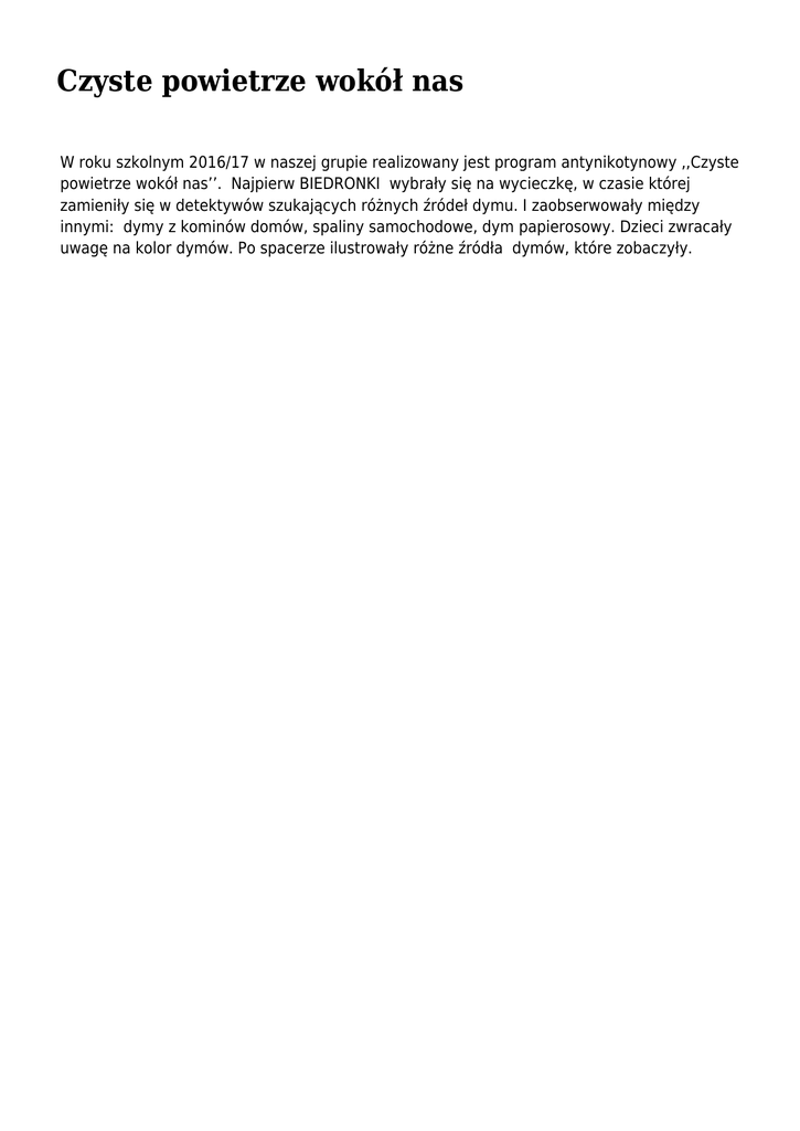 Czyste powietrze wokół nas W roku szkolnym 2016/17 w naszej grupie realizowany jest program antynikotynowy ,,Czyste powietrze wokół nas’’. Najpierw BIEDRONKI wybrały się na wycieczkę, w czasie której zamieniły się w detektywów szukających różnych źródeł dymu. I zaobserwowały między innymi: dymy z kominów domów, spaliny samochodowe, dym papierosowy. Dzieci zwracały uwagę na kolor dymów. Po spacerze ilustrowały różne źródła dymów, które zobaczyły.