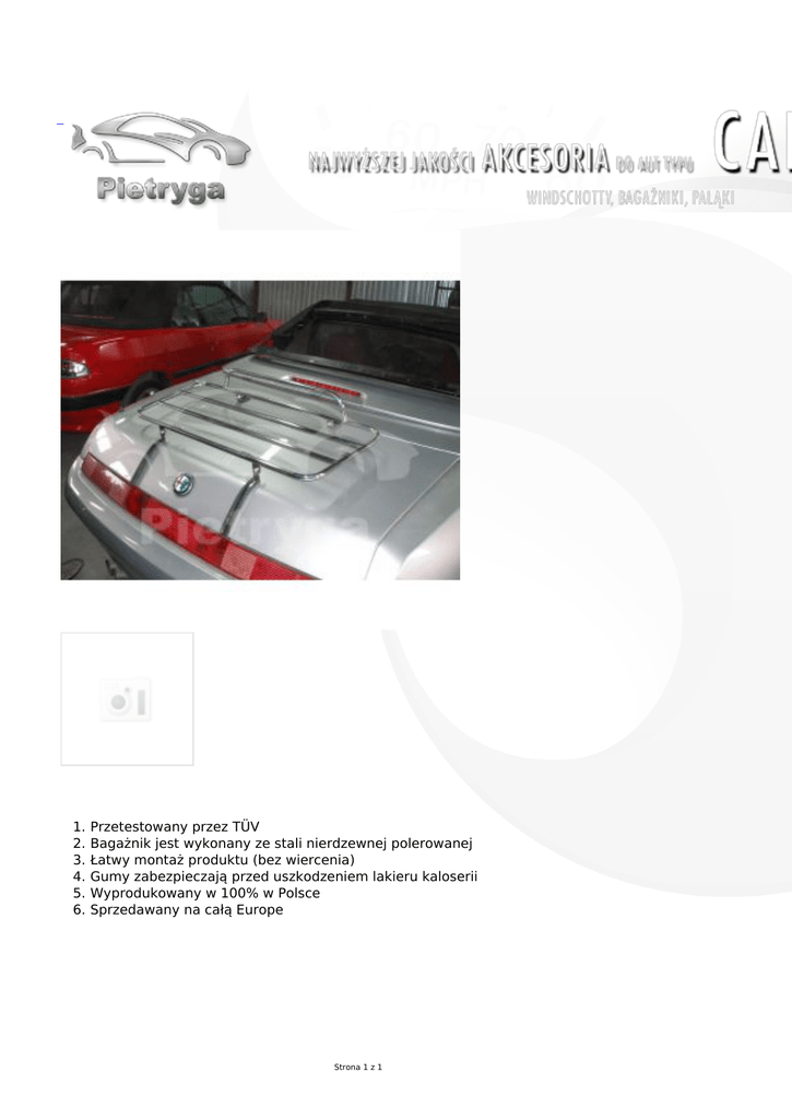 1. 2. 3. 4. 5. 6. Przetestowany przez TÜV Bagażnik jest wykonany ze stali nierdzewnej polerowanej Łatwy montaż produktu (bez wiercenia) Gumy zabezpieczają przed uszkodzeniem lakieru kaloserii Wyprodukowany w 100% w Polsce Sprzedawany na całą Europe Strona 1 z 1