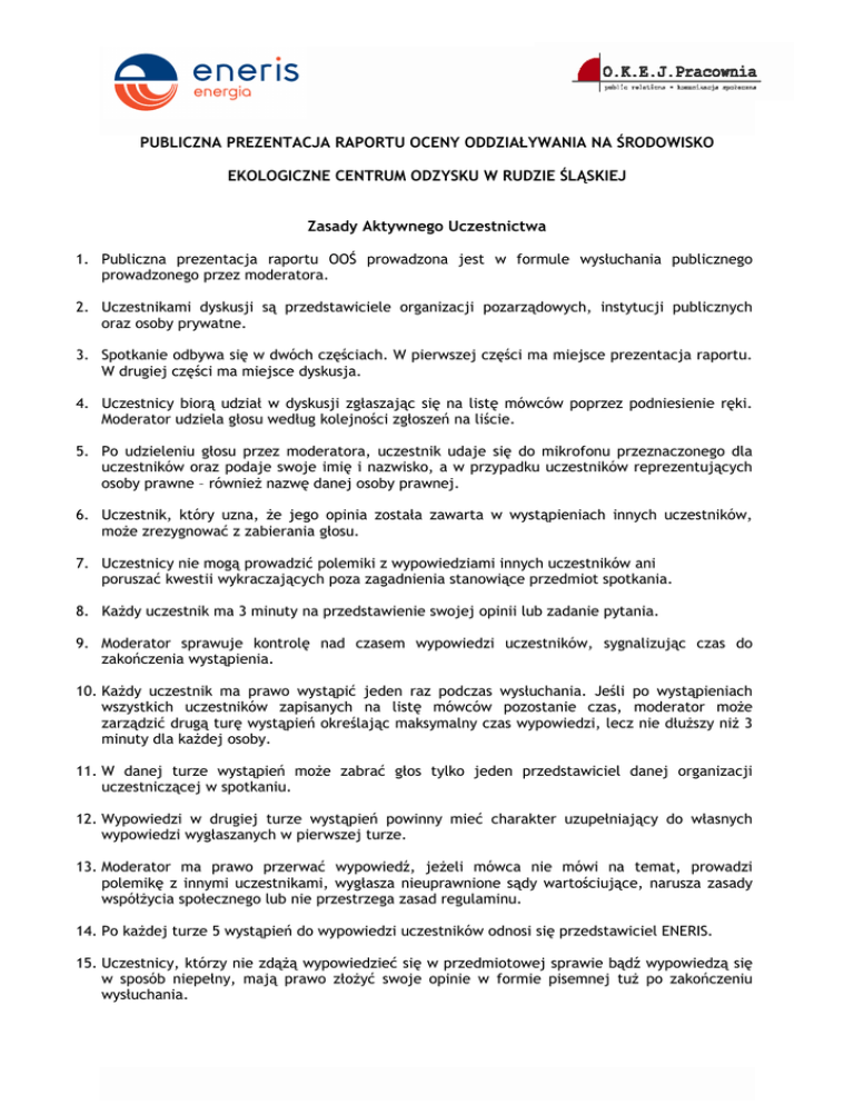 PUBLICZNA PREZENTACJA RAPORTU OCENY ODDZIAŁYWANIA NA ŚRODOWISKO EKOLOGICZNE CENTRUM ODZYSKU W RUDZIE ŚLĄSKIEJ Zasady Aktywnego Uczestnictwa 1. Publiczna prezentacja raportu OOŚ prowadzona jest w formule wysłuchania publicznego prowadzonego przez moderatora. 2. Uczestnikami dyskusji są przedstawiciele organizacji pozarządowych, instytucji publicznych oraz osoby prywatne. 3. Spotkanie odbywa się w dwóch częściach. W pierwszej części ma miejsce prezentacja raportu. W drugiej części ma miejsce dyskusja. 4. Uczestnicy biorą udział w dyskusji zgłaszając się na listę mówców poprzez podniesienie ręki. Moderator udziela głosu według kolejności zgłoszeń na liście. 5. Po udzieleniu głosu przez moderatora, uczestnik udaje się do mikrofonu przeznaczonego dla uczestników oraz podaje swoje imię i nazwisko, a w przypadku uczestników reprezentujących osoby prawne – również nazwę danej osoby prawnej. 6. Uczestnik, który uzna, że jego opinia została zawarta w wystąpieniach innych uczestników, może zrezygnować z zabierania głosu. 7. Uczestnicy nie mogą prowadzić polemiki z wypowiedziami innych uczestników ani poruszać kwestii wykraczających poza zagadnienia stanowiące przedmiot spotkania. spotkania 8. Każdy uczestnik ma 3 minuty uty na przedstawienie swojej opinii lub zadanie pytania. 9. Moderator sprawuje kontrolę nad na czasem wypowiedzi uczestników, sygnalizując czas do zakończenia wystąpienia. wystąp jeden raz podczas wysłuchania.. Jeśli po wystąpieniach 10. Każdy uczestnik ma prawo wystąpić wszystkich uczestników zapisanych na listę mówców pozostanie czas, moderator może zarządzić drugą turę wystąpień określając maksymalny czas wypowiedzi, wypowiedzi lecz nie dłuższy niż 3 minuty dla każdej osoby. 11. W danej turze wystąpień może zabrać głos tylko jeden przedstawiciel przedstawiciel danej organizacji uczestniczącej w spotkaniu. 12. Wypowiedzi w drugiej turze wystąpień powinny mieć charakter uzupełniający do własnych wypowiedzi wygłaszanych w pierwszej turze. 13. Moderator ma prawo przerwać wypowiedź, jeżeli mówca nie mówi na temat, te prowadzi polemikę z innymi uczestnikami, wygłasza nieuprawnione sądy wartościujące, narusza zasady współżycia społecznego lub nie przestrzega zasad regulaminu. 14. Po każdej turze 5 wystąpień do wypowiedzi uczestników odnosi się przedstawiciel ENERIS. ENERIS 15. Uczestnicy, którzy nie zdążą wypowiedzieć się w przedmiotowej sprawie bądź wypowiedzą się w sposób niepełny, mają prawo złożyć swoje opinie w formie pisemnej tuż po zakończeniu wysłuchania. 16. Regulamin spotkania dostępny jest do wiadomości na stronie inwestora www.enerisrudaslaska.pl oraz przy wejściu na salę spotkań. Każda osoba biorąca udział w spotkaniu ma obowiązek zapoznania się i przestrzegania zasad zapisanych w regulaminie.
