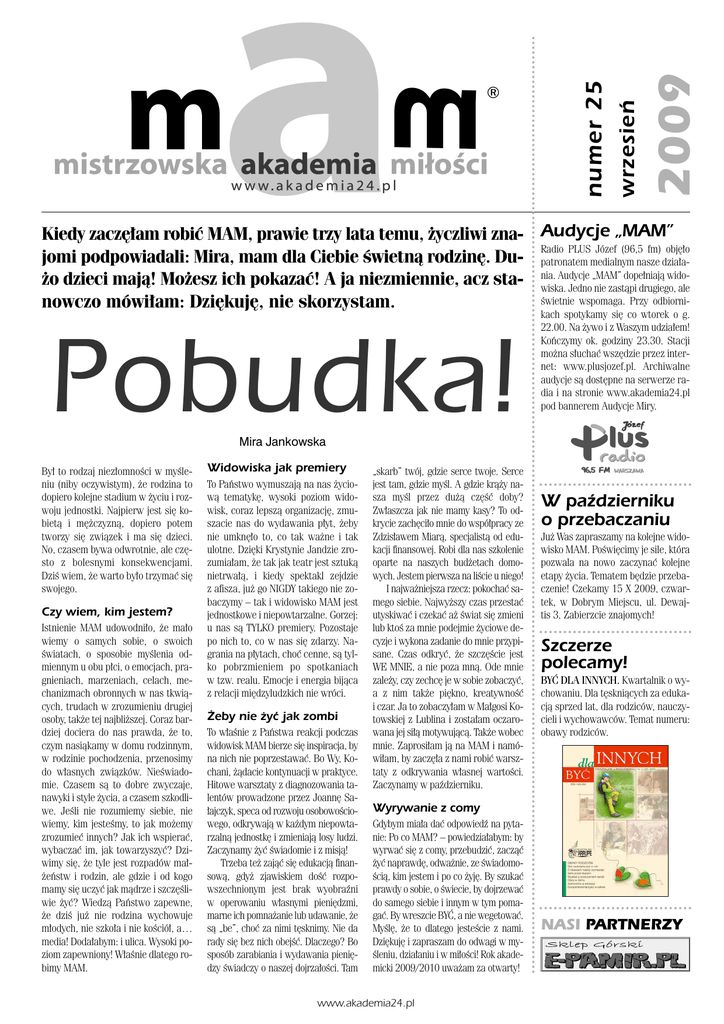 2009 wrzesień numer 25 ® Kiedy zacz´∏am robiç MAM, prawie trzy lata temu, ˝yczliwi zna- Audycje „MAM” Radio PLUS Józef (96,5 fm) obj´∏o jomi podpowiadali: Mira, mam dla Ciebie Êwietnà rodzin´. Du- patronatem medialnym nasze dzia∏aAudycje „MAM” dope∏niajà wido˝o dzieci majà! Mo˝esz ich pokazaç! A ja niezmiennie, acz sta- nia. wiska. Jedno nie zastàpi drugiego, ale Êwietnie wspomaga. Przy odbiorninowczo mówi∏am: Dzi´kuj´, nie skorzystam. Pobudka! kach spotykamy si´ co wtorek o g. 22.00. Na ˝ywo i z Waszym udzia∏em! Koƒczymy ok. godziny 23.30. Stacji mo˝na s∏uchaç wsz´dzie przez internet: www.plusjozef.pl. Archiwalne audycje sà dost´pne na serwerze radia i na stronie www.akademia24.pl pod bannerem Audycje Miry. Mira Jankowska By∏ to rodzaj niez∏omnoÊci w myÊleniu (niby oczywistym), ˝e rodzina to dopiero kolejne stadium w ˝yciu i rozwoju jednostki. Najpierw jest si´ kobietà i m´˝czyznà, dopiero potem tworzy si´ zwiàzek i ma si´ dzieci. No, czasem bywa odwrotnie, ale cz´sto z bolesnymi konsekwencjami. DziÊ wiem, ˝e warto by∏o trzymaç si´ swojego. Czy wiem, kim jestem? Istnienie MAM udowodni∏o, ˝e ma∏o wiemy o samych sobie, o swoich Êwiatach, o sposobie myÊlenia odmiennym u obu p∏ci, o emocjach, pragnieniach, marzeniach, celach, mechanizmach obronnych w nas tkwiàcych, trudach w zrozumieniu drugiej osoby, tak˝e tej najbli˝szej. Coraz bardziej dociera do nas prawda, ˝e to, czym nasiàkamy w domu rodzinnym, w rodzinie pochodzenia, przenosimy do w∏asnych zwiàzków. NieÊwiadomie. Czasem sà to dobre zwyczaje, nawyki i style ˝ycia, a czasem szkodliwe. JeÊli nie rozumiemy siebie, nie wiemy, kim jesteÊmy, to jak mo˝emy zrozumieç innych? Jak ich wspieraç, wybaczaç im, jak towarzyszyç? Dziwimy si´, ˝e tyle jest rozpadów ma∏˝eƒstw i rodzin, ale gdzie i od kogo mamy si´ uczyç jak màdrze i szcz´Êliwie ˝yç? Wiedzà Paƒstwo zapewne, ˝e dziÊ ju˝ nie rodzina wychowuje m∏odych, nie szko∏a i nie koÊció∏, a… media! Doda∏abym: i ulica. Wysoki poziom zapewniony! W∏aÊnie dlatego robimy MAM. Widowiska jak premiery To Paƒstwo wymuszajà na nas ˝yciowà tematyk´, wysoki poziom widowisk, coraz lepszà organizacj´, zmuszacie nas do wydawania p∏yt, ˝eby nie umkn´∏o to, co tak wa˝ne i tak ulotne. Dzi´ki Krystynie Jandzie zrozumia∏am, ˝e tak jak teatr jest sztukà nietrwa∏à, i kiedy spektakl zejdzie z afisza, ju˝ go NIGDY takiego nie zobaczymy – tak i widowisko MAM jest jednostkowe i niepowtarzalne. Gorzej: u nas sà TYLKO premiery. Pozostaje po nich to, co w nas si´ zdarzy. Nagrania na p∏ytach, choç cenne, sà tylko pobrzmieniem po spotkaniach w tzw. realu. Emocje i energia bijàca z relacji mi´dzyludzkich nie wróci. Żeby nie żyć jak zombi To w∏aÊnie z Paƒstwa reakcji podczas widowisk MAM bierze si´ inspiracja, by na nich nie poprzestawaç. Bo Wy, Kochani, ˝àdacie kontynuacji w praktyce. Hitowe warsztaty z diagnozowania talentów prowadzone przez Joann´ Sa∏ajczyk, speca od rozwoju osobowoÊciowego, odkrywajà w ka˝dym niepowtarzalnà jednostk´ i zmieniajà losy ludzi. Zaczynamy ˝yç Êwiadomie i z misjà! Trzeba te˝ zajàç si´ edukacjà finansowà, gdy˝ zjawiskiem doÊç rozpowszechnionym jest brak wyobraêni w operowaniu w∏asnymi pieni´dzmi, marne ich pomna˝anie lub udawanie, ˝e sà „be”, choç za nimi t´sknimy. Nie da rady si´ bez nich obejÊç. Dlaczego? Bo sposób zarabiania i wydawania pieni´dzy Êwiadczy o naszej dojrza∏oÊci. Tam „skarb” twój, gdzie serce twoje. Serce jest tam, gdzie myÊl. A gdzie krà˝y nasza myÊl przez du˝à cz´Êç doby? Zw∏aszcza jak nie mamy kasy? To odkrycie zach´ci∏o mnie do wspó∏pracy ze Zdzis∏awem Miarà, specjalistà od edukacji finansowej. Robi dla nas szkolenie oparte na naszych bud˝etach domowych. Jestem pierwsza na liÊcie u niego! I najwa˝niejsza rzecz: pokochaç samego siebie. Najwy˝szy czas przestaç utyskiwaç i czekaç a˝ Êwiat si´ zmieni lub ktoÊ za mnie podejmie ˝yciowe decyzje i wykona zadanie do mnie przypisane. Czas odkryç, ˝e szcz´Êcie jest WE MNIE, a nie poza mnà. Ode mnie zale˝y, czy zechc´ je w sobie zobaczyç, a z nim tak˝e pi´kno, kreatywnoÊç i czar. Ja to zobaczy∏am w Ma∏gosi Kotowskiej z Lublina i zosta∏am oczarowana jej si∏à motywujàcà. Tak˝e wobec mnie. Zaprosi∏am jà na MAM i namówi∏am, by zacz´∏a z nami robiç warsztaty z odkrywania w∏asnej wartoÊci. Zaczynamy w paêdzierniku. W październiku o przebaczaniu Ju˝ Was zapraszamy na kolejne widowisko MAM. PoÊwi´cimy je sile, która pozwala na nowo zaczynaç kolejne etapy ˝ycia. Tematem b´dzie przebaczenie! Czekamy 15 X 2009, czwartek, w Dobrym Miejscu, ul. Dewajtis 3. Zabierzcie znajomych! Szczerze polecamy! BYå DLA INNYCH. Kwartalnik o wychowaniu. Dla t´skniàcych za edukacjà sprzed lat, dla rodziców, nauczycieli i wychowawców. Temat numeru: obawy rodziców. Wyrywanie z comy Gdybym mia∏a daç odpowiedê na pytanie: Po co MAM? – powiedzia∏abym: by wyrwaç si´ z comy, przebudziç, zaczàç ˝yç naprawd´, odwa˝nie, ze ÊwiadomoÊcià, kim jestem i po co ˝yj´. By szukaç prawdy o sobie, o Êwiecie, by dojrzewaç do samego siebie i innym w tym pomagaç. By wreszcie BYå, a nie wegetowaç. MyÊl´, ˝e to dlatego jesteÊcie z nami. Dzi´kuj´ i zapraszam do odwagi w myÊleniu, dzia∏aniu i w mi∏oÊci! Rok akademicki 2009/2010 uwa˝am za otwarty! www.akademia24.pl NASI PARTNERZY WARTO PRZECZYTAĆ SUPERPOTENCJA Dudley Seth Danoff Autor, urolog i chirurg, udowadnia, ˝e superpotencja to nie sprawnoÊç m´skiego organu p∏ciowego, ale przede wszystkim si∏a wewn´trzna, charakter i to, kim m´˝czyzna si´ czuje. Napisane konkretnie, edukacyjnie i z humorem. Niektóre treÊci ksià˝ki sà doÊç kontrowersyjne. Warto czytaç z g∏owà! Niemniej warto! Liczny sk∏ad rodziny traktowany jest przez znaczàcà cz´Êç otoczenia jako oznaka braku opano