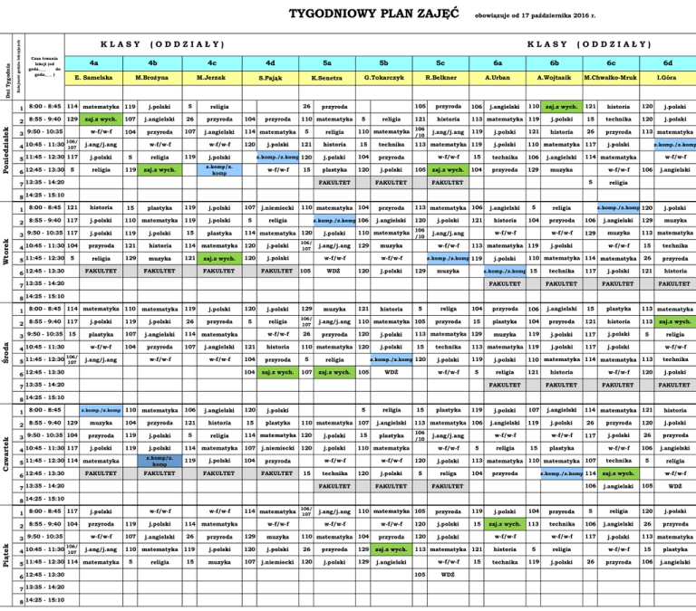 Poniedziałek Kolejność godzin lekcyjnych Dni Tygodnia TYGODNIOWY PLAN ZAJĘĆ KLASY Czas trwania lekcji (od godz.___ do godz,___ ) obowiązuje od 17 października 2016 r. (ODDZIAŁY) KLASY (ODDZIAŁY) 4a 4b 4c 4d 5a 5b 5c 6a 6b 6c 6d E. Samelska M.Brożyna M.Jerzak S.Pająk K.Senetra G.Tokarczyk R.Belkner A.Urban A.Wojtasik M.Chwałko-Mruk I.Góra 1 8:00 - 8:45 114 matematyka 119 2 8:55 - 9:40 129 3 9:50 - 10:35 106/ j.polski 5 religia zaj.z wych. 107 j.angielski 26 przyroda w-f/w-f 104 przyroda 107 j.angielski 119 j.polski 4 10:45 - 11:30 107 j.ang/j.ang 5 11:45 - 12:30 117 j.polski 5 religia 6 12:45 - 13:30 religia 119 zaj.z wych. 5 w-f/w-f w-f/w-f 26 104 przyroda 114 matematyka 120 z.komp/z. komp przyroda 110 matematyka 5 religia 5 religia 121 historia 15 technika z.komp./z.komp 120 j.polski 104 przyroda plastyka 120 j.polski j.polski w-f/w-f 15 7 13:35 - 14:20 110 matematyka 105 przyroda 106 zaj.z wych. 121 historia 120 j.polski 121 historia 113 matematyka 119 j.polski 15 technika 120 j.polski 106 /10 j.ang/j.ang 119 historia 26 przyroda 113 matematyka j.angielski 110 j.polski 121 113 matematyka 119 j.polski 110 matematyka 117 w-f/w-f 15 technika 106 j.angielski zaj.z wych. 104 przyroda 129 muzyka 105 w-f/w-f 5 FAKULTET FAKULTET FAKULTET 110 matematyka 104 przyroda 113 matematyka 106 j.polski z.komp./z.komp 114 matematyka w-f/w-f 106 j.angielski religia Wtorek 8 14:25 - 15:10 1 8:00 - 8:45 121 2 8:55 - 9:40 117 j.polski 3 9:50 - 10:35 117 j.polski 4 10:45 - 11:30 104 5 11:45 - 12:30 5 6 12:45 - 13:30 historia plastyka 119 j.polski 107 j.niemiecki 110 matematyka 119 j.polski 5 religia 119 j.polski 15 plastyka przyroda 121 historia 114 matematyka 120 j.polski religia 129 muzyka 121 zaj.z wych. 120 j.polski 15 FAKULTET FAKULTET z.komp./z.komp 106 114 matematyka 120 FAKULTET FAKULTET 106/ 107 j.polski j.ang/j.ang 129 w-f/w-f 105 WDŻ j.angielski 110 matematyka j.polski religia historia 104 przyroda 106 j.angielski w-f/w-f 129 muzyka j.polski 106 /10 j.ang/j.ang w-f/w-f w-f/w-f 113 matematyka 119 w-f/w-f 120 5 120 muzyka 121 j.angielski z.komp./z.komp 119 129 muzyka j.polski j.polski 129 muzyka w-f/w-f j.polski 110 matematyka 114 matematyka z.komp./z.komp 15 7 13:35 - 14:20 z.komp./z.komp 120 FAKULTET technika 117 FAKULTET j.polski 113 matematyka 15 technika 26 przyroda 121 FAKULTET historia FAKULTET Środa 8 14:25 - 15:10 1 8:00 - 8:45 114 matematyka 110 matematyka 119 j.polski 120 j.polski 129 muzyka 2 8:55 - 9:40 117 j.polski 119 j.polski 26 przyroda 5 religia 106/ 107 j.ang/j.ang 3 9:50 - 10:35 15 plastyka 107 j.angielski 114 matematyka w-f/w-f 26 przyroda przyroda 107 4 10:45 - 11:30 w-f/w-f 106/ 5 11:45 - 12:30 107 104 w-f/w-f j.ang/j.ang j.angielski 121 historia w-f/w-f 104 przyroda 5 religia 104 zaj.z wych. 107 zaj.z wych. 6 12:45 - 13:30 121 historia 5 110 matematyka 105 120 110 matematyka 120 j.polski j.polski 104 przyroda 106 j.angielski 15 plastyka 113 matematyka 15 plastyka 104 przyroda 121 historia 113 muzyka 119 j.polski 117 j.polski 5 113 matematyka 119 j.polski 117 113 matematyka 129 15 z.komp./z.komp 120 105 religa przyroda WDŻ technika j.polski 119 j.polski 110 matematyka 114 matematyka 113 w-f/w-f 5 religia 121 FAKULTET religia w-f/w-f j.polski 7 13:35 - 14:20 zaj.z wych. 120 technika historia w-f/w-f FAKULTET FAKULTET 114 matematyka 121 historia j.polski j.polski FAKULTET 8 14:25 - 15:10 1 8:00 - 8:45 Czwartek 2 8:55 - 9:40 z.komp./z.komp 129 muzyka 110 matematyka 106 j.angielski 120 j.polski 104 121 historia 15 plastyka przyroda 5 110 matematyka 107 3 9:50 - 10:35 104 przyroda 119 j.polski 5 religia 114 matematyka 120 j.polski 4 10:45 - 11:30 117 j.polski 119 j.polski 114 matematyka 107 j.niemiecki 120 j.polski z.komp/z. komp 119 j.polski 104 przyroda 15 technika 5 11:45 - 12:30 114 matematyka 6 12:45 - 13:30 FAKULTET FAKULTET FAKULTET FAKULTET 15 plastyka 15 120 plastyka 119 113 matematyka 106 106 /10 110 matematyka w-f/w-f 7 13:35 - 14:20 religia j.angielski w-f/w-f 120 j.polski 5 j.polski religa 107 j.angielski 119 j.polski 26 przyroda w-f/w-f 117 j.polski 26 przyroda 15 plastyka w-f/w-f 106 j.angielski technika 5 religia w-f/w-f j.ang/j.ang w-f/w-f j.polski j.angielski 5 religia 113 matematyka 110 matematyka 107 104 przyroda 120 z.komp./z.komp 114 zaj.z wych. 106 j.angielski 105 WDŻ 5 religia 120 j.polski 26 przyroda FAKULTET FAKULTET FAKULTET j.ang/j.ang 110 matematyka 105 przyroda 119 j.polski 104 przyroda 15 zaj.z wych. 113 technika 106 j.angielski w-f/w-f 117 j.polski w-f/w-f 8 14:25 - 15:10 117 j.polski 2 8:55 - 9:40 104 przyroda 119 j.polski 114 matematyka w-f/w-f w-f/w-f w-f/w-f 120 j.polski w-f/w-f 107 j.angielski 26 przyroda 129 muzyka 110 matematyka 104 przyroda 120 j.polski w-f/w-f 119 j.polski 120 j.polski 26 przyroda 129 zaj.z wych. 113 matematyka 121 historia 5 religia 15 muzyka 107 j.niemiecki 120 j.polski 129 j.angielski w-f/w-f technika 119 j.polski Piątek 3 9:50 - 10:35 106/ 4 10:45 - 11:30 107 j.ang/j.ang 5 11:45 - 12:30 114 matematyka 6 12:45 - 13:30 7 13:35 - 14:20 8 14:25 - 15:10 w-f/w-f 110 matematyka 5 religia w-f/w-f 114 matematyka 106/ 107 1 8:00 - 8:45 105 WDŻ 15 26 113 matematyka w-f/w-f 15 plastyka przyroda 106 j.angielski